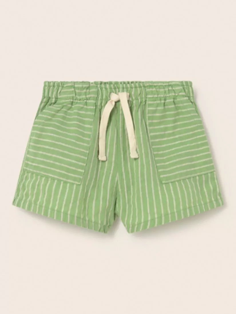 Striped shorts made from cotton fabric with a linen-like texture. They feature an elastic waistband with a decorative drawstring and front patch pockets with horizontal stripes for a classic, comfortable fit.