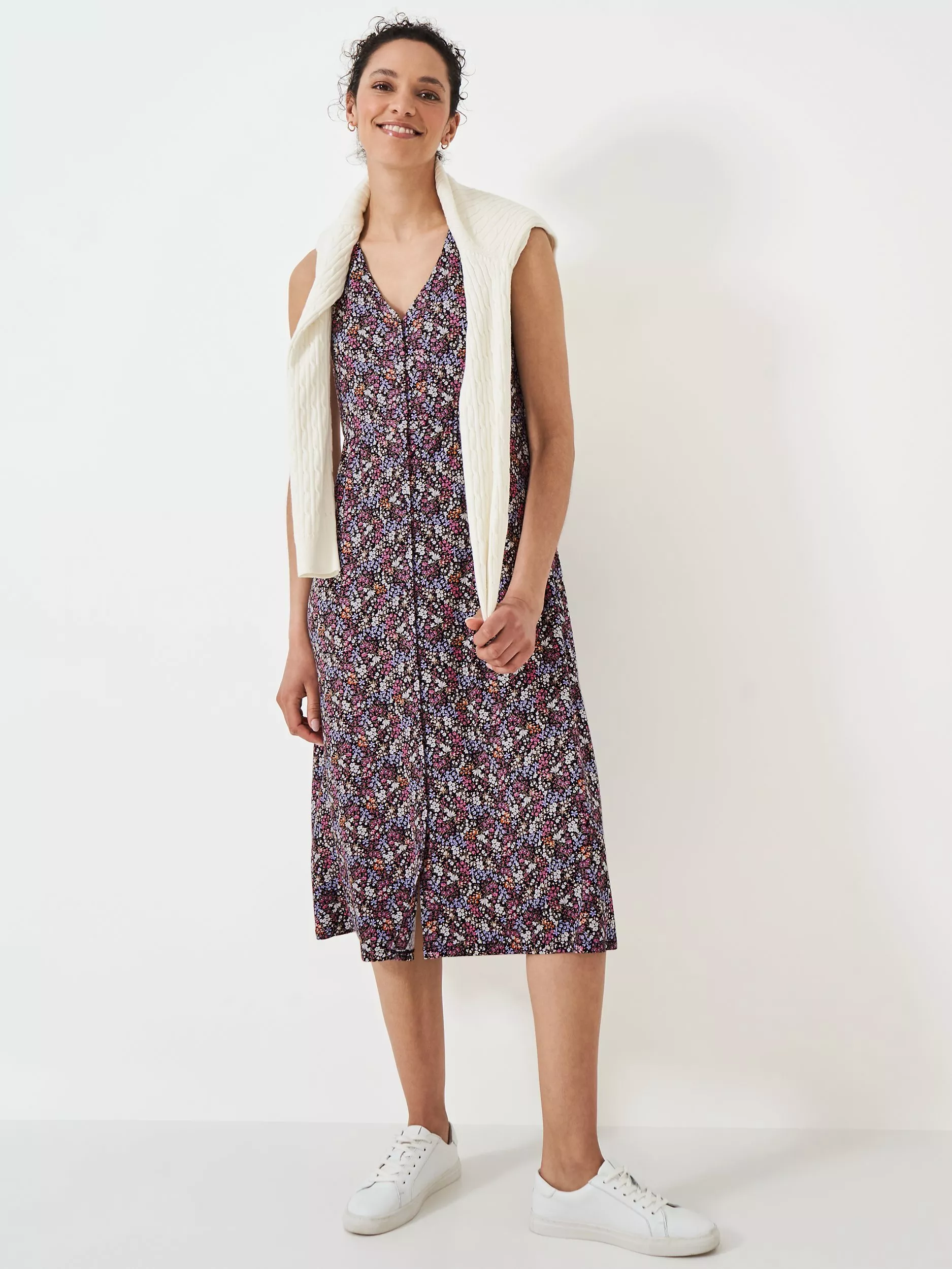 Offered in a universally flattering fit and flare shape, this mid-length dress from Crew Clothing is blended with viscose for a weightless feel. Defined with a conventional round neckline, this sleeveless style is planted with flourishing florals.