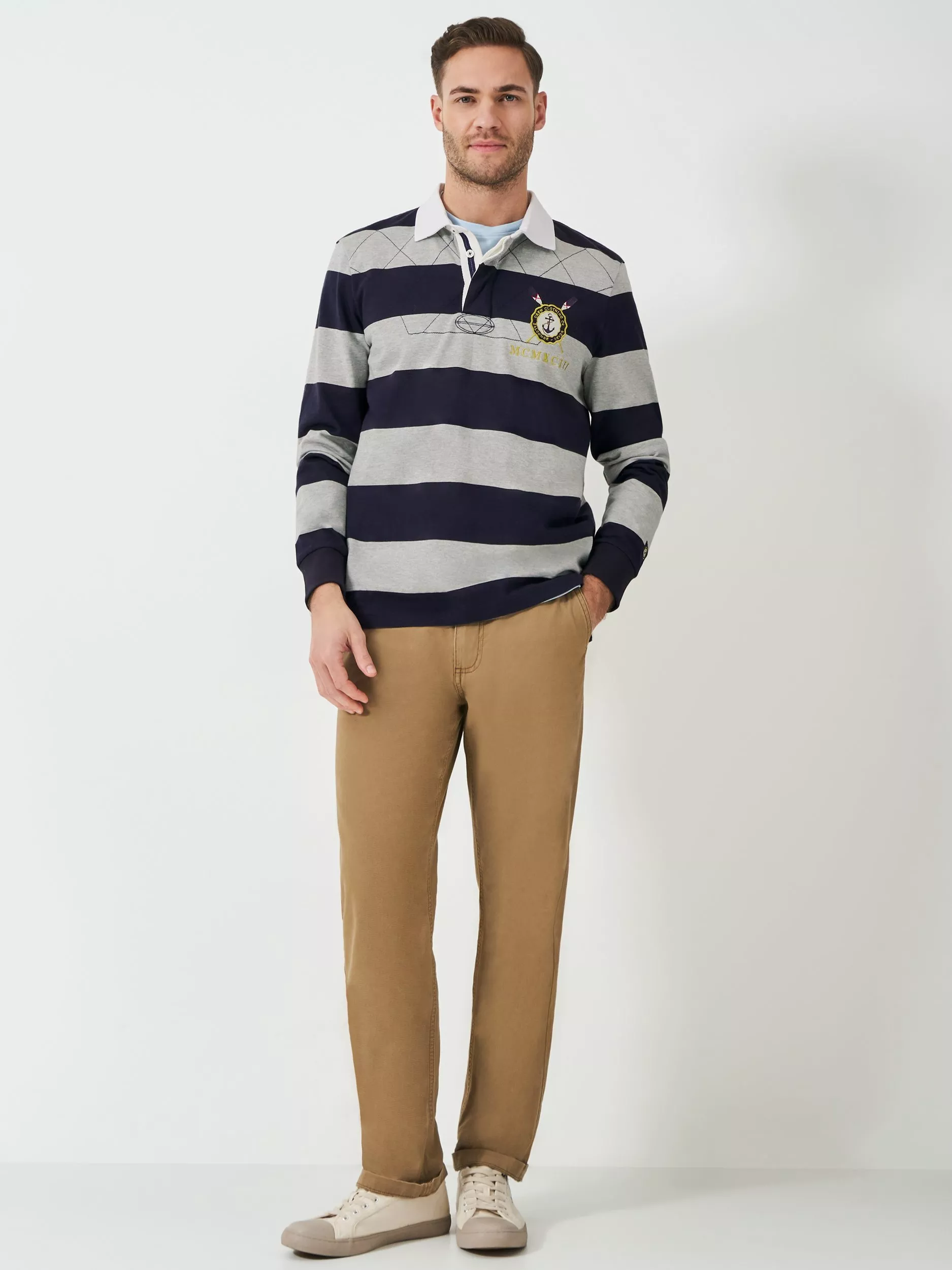 Introducing the Callington Rugby shirt in a navy and grey stripe. This match-ready style takes notes from Crew Clothing's heritage, with branded appliqué on the chest and an embroidered patch on the reverse that call back to the coast. Wear with jeans from pitch to pub and beyond.