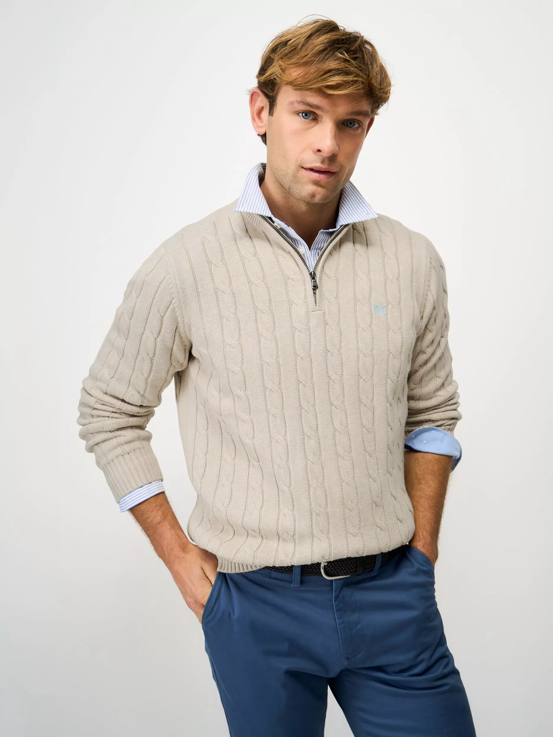 The ideal choice when temperatures start to drop, this zip neck jumper from Crew Clothing is made from a breathable cotton construction to a cable knit design.