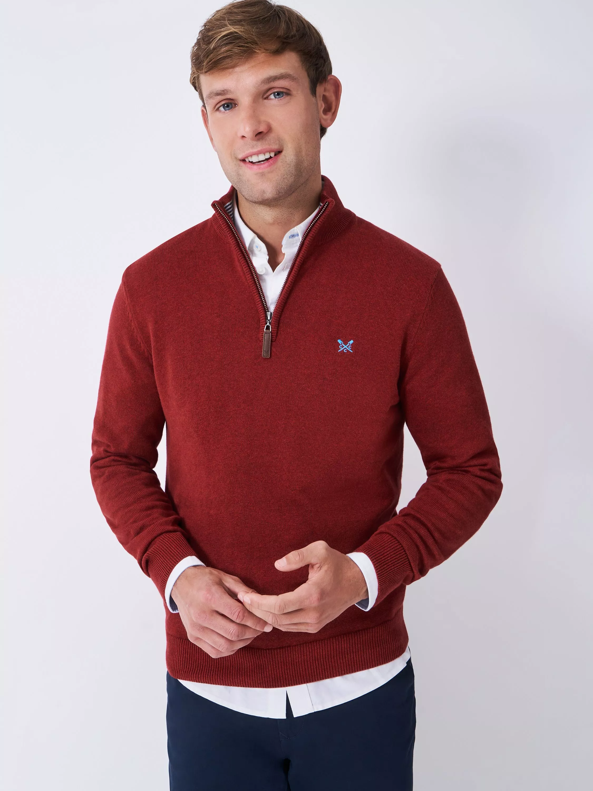 A sophisticated and timeless choice, this classic half-zip jumper is crafted from 100% cotton. This versatile piece can be dressed up or down, but for a modern, refined look, try pairing it with a denim shirt and dark jeans.