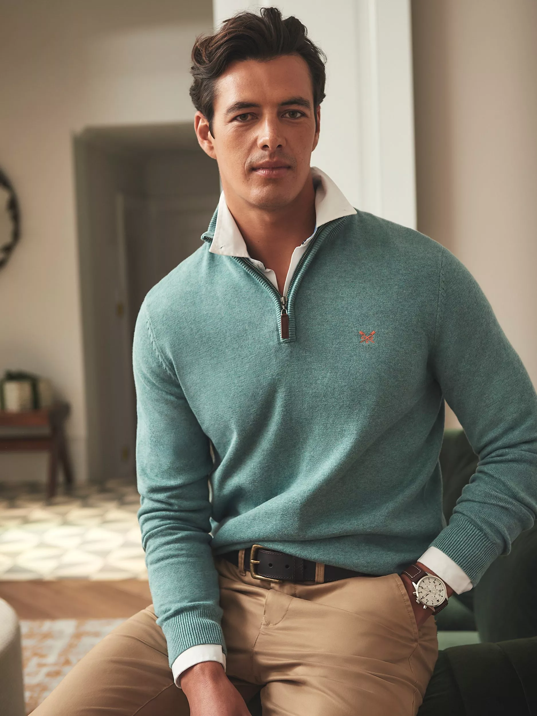 A sophisticated and timeless choice, this classic half-zip jumper is crafted from 100% cotton. This versatile piece can be dressed up or down, but for a modern, refined look, try pairing it with a denim shirt and dark jeans.