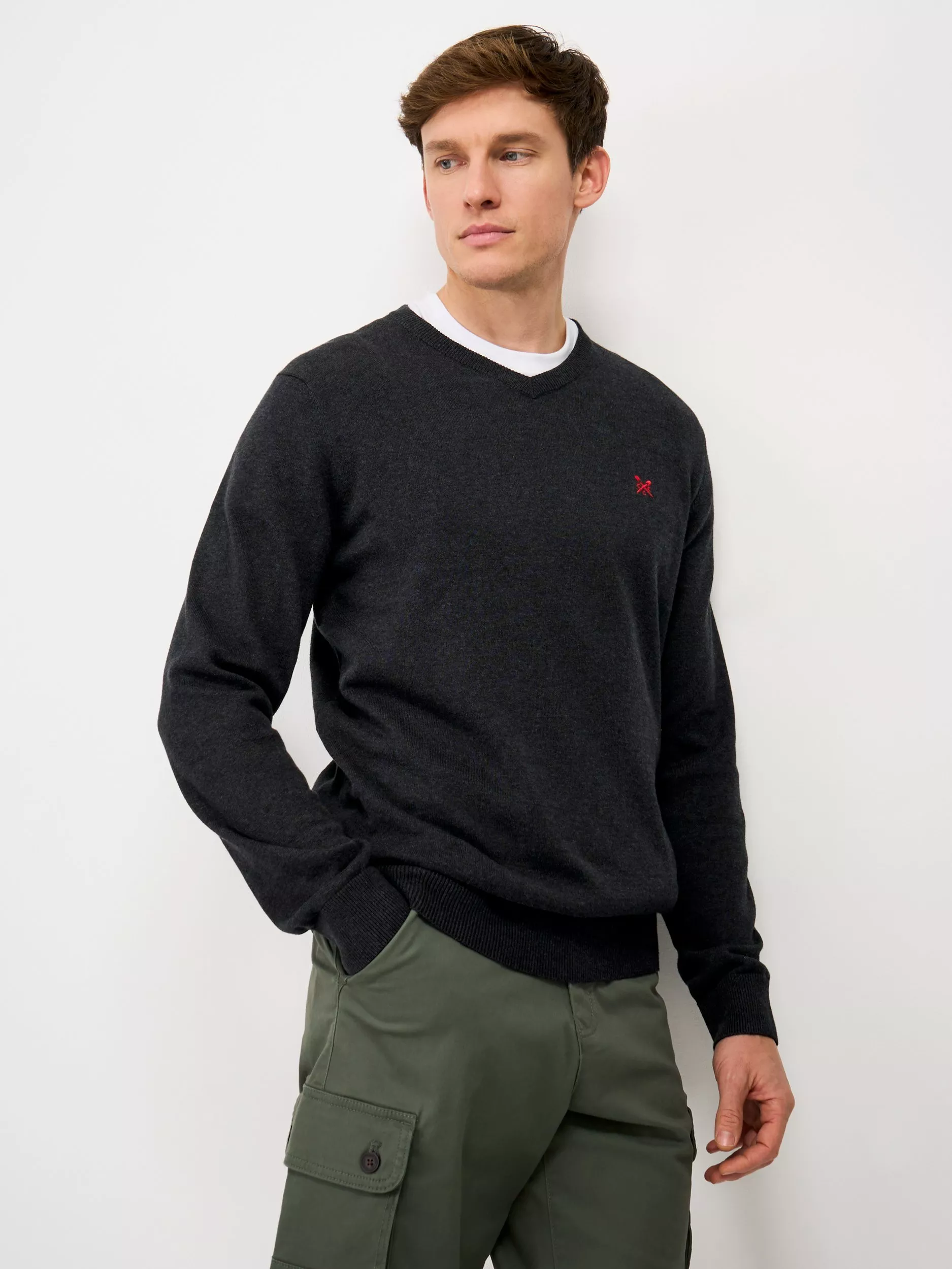 A V-neck jumper in charcoal grey. Made from 100% soft cotton, this jumper is ideal for layering over a tee or shirt. The crossed oars embroidered in a contrasting stitch finishes it off neatly.