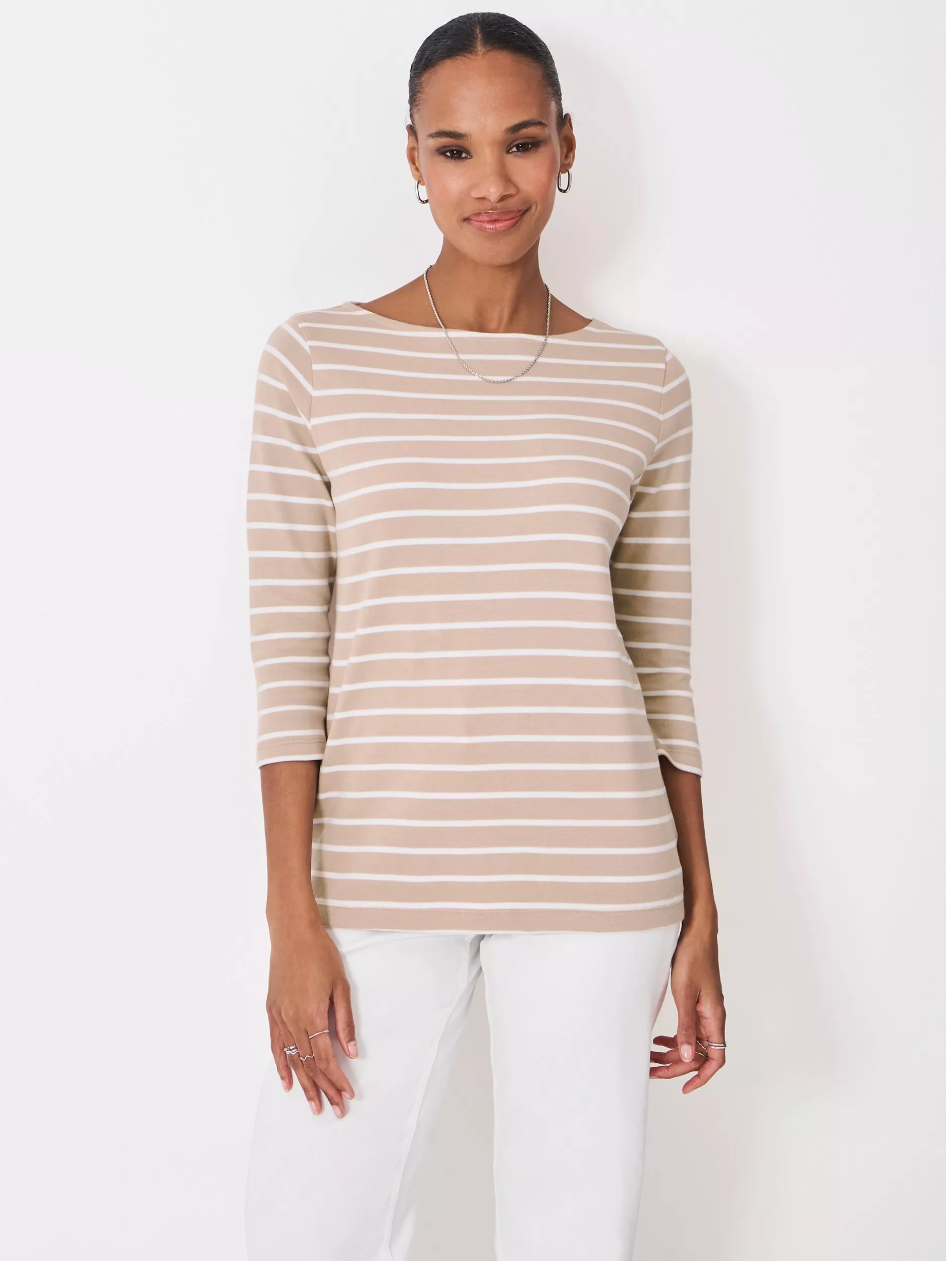 The ultimate Breton top remains a forever favourite. In neutral beige with white stripes, this one features long sleeves, a boat neckline, and crossed oars embroidery on the hem. The soft cotton fabric and curved hemline help it drape beautifully, too.