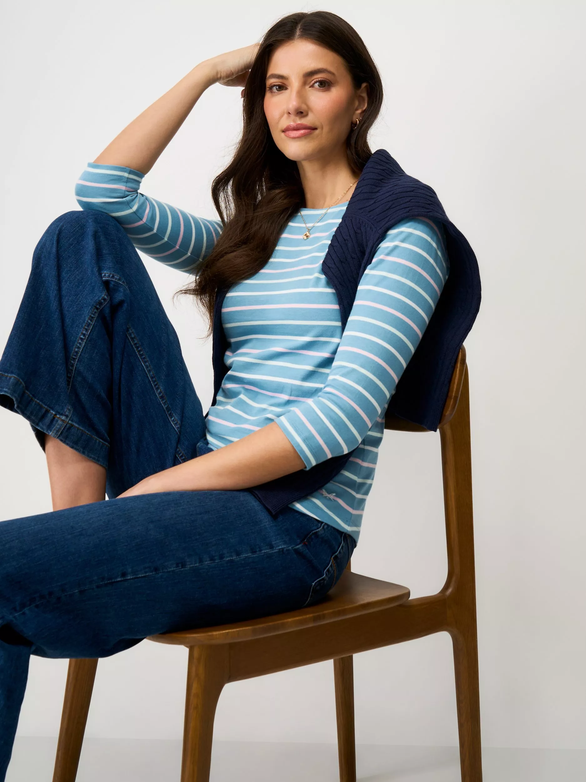 A wardrobe staple made from lightweight, super soft cotton, Crew Clothing have added a curved hem for a flattering fit and bracelet-length sleeves. Style with jeans and trainers on days off. Because stripes always look good.