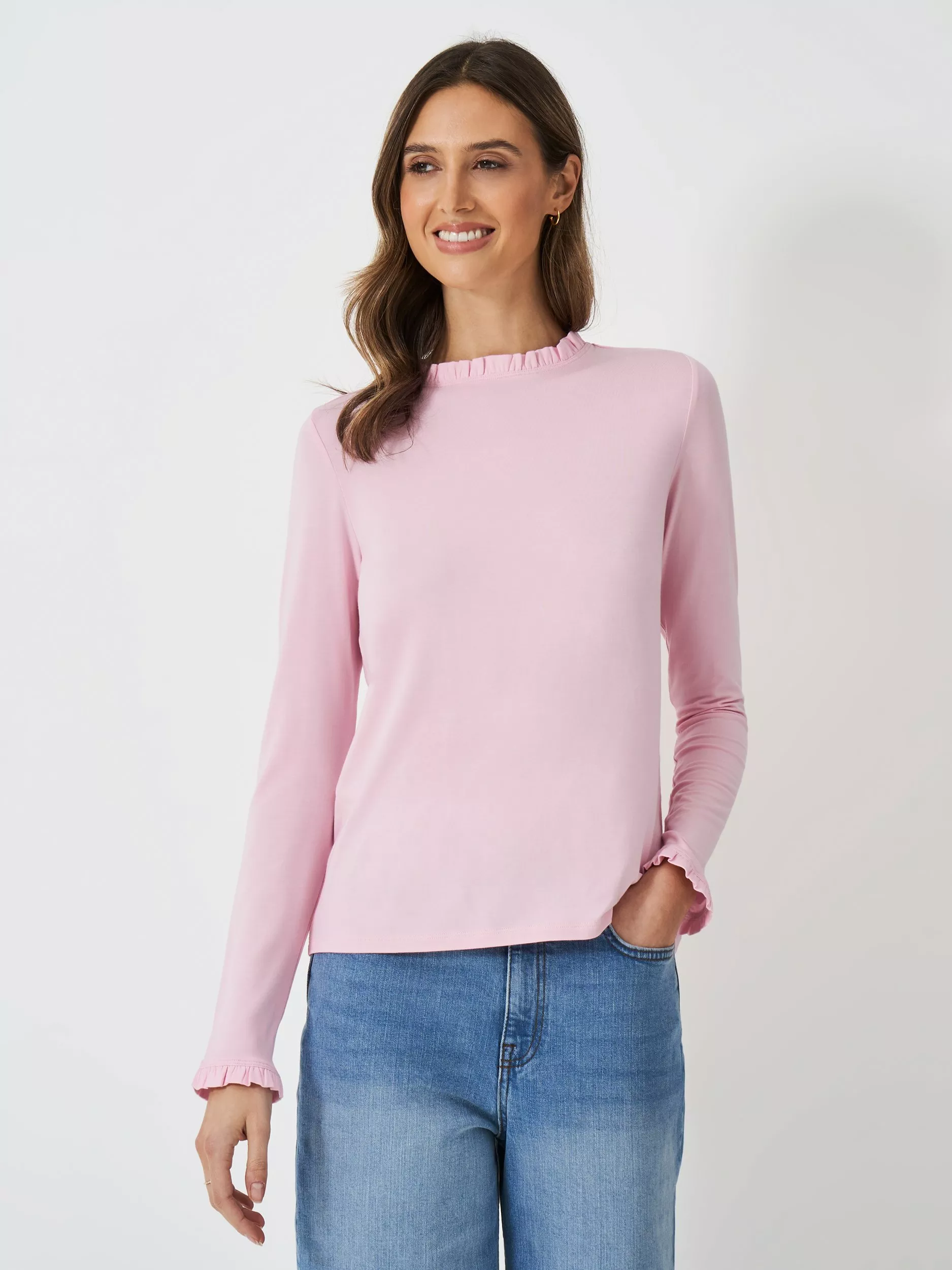A supersoft, drapey modal top. With a high neckline, frilly trim and sleeves, and a button-up back fastening what more could you want in a top? We think this style will look great teamed with dark denim and trainers, and it's perfect for layering under a knit.