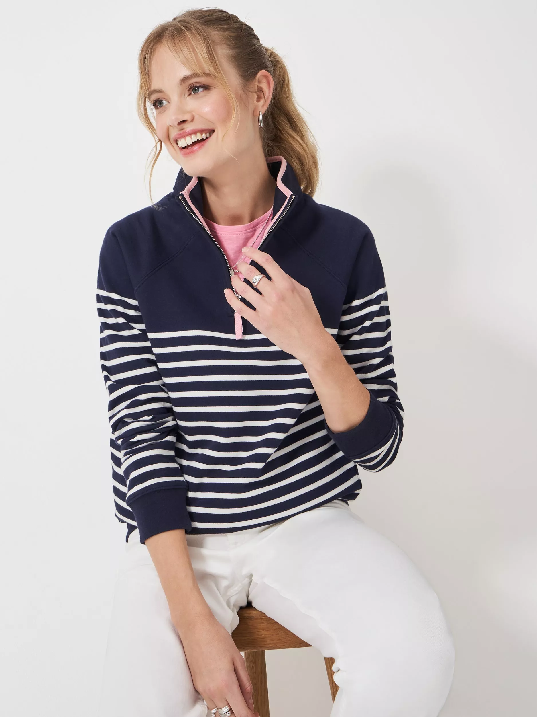 A navy and white striped half zip sweatshirt.