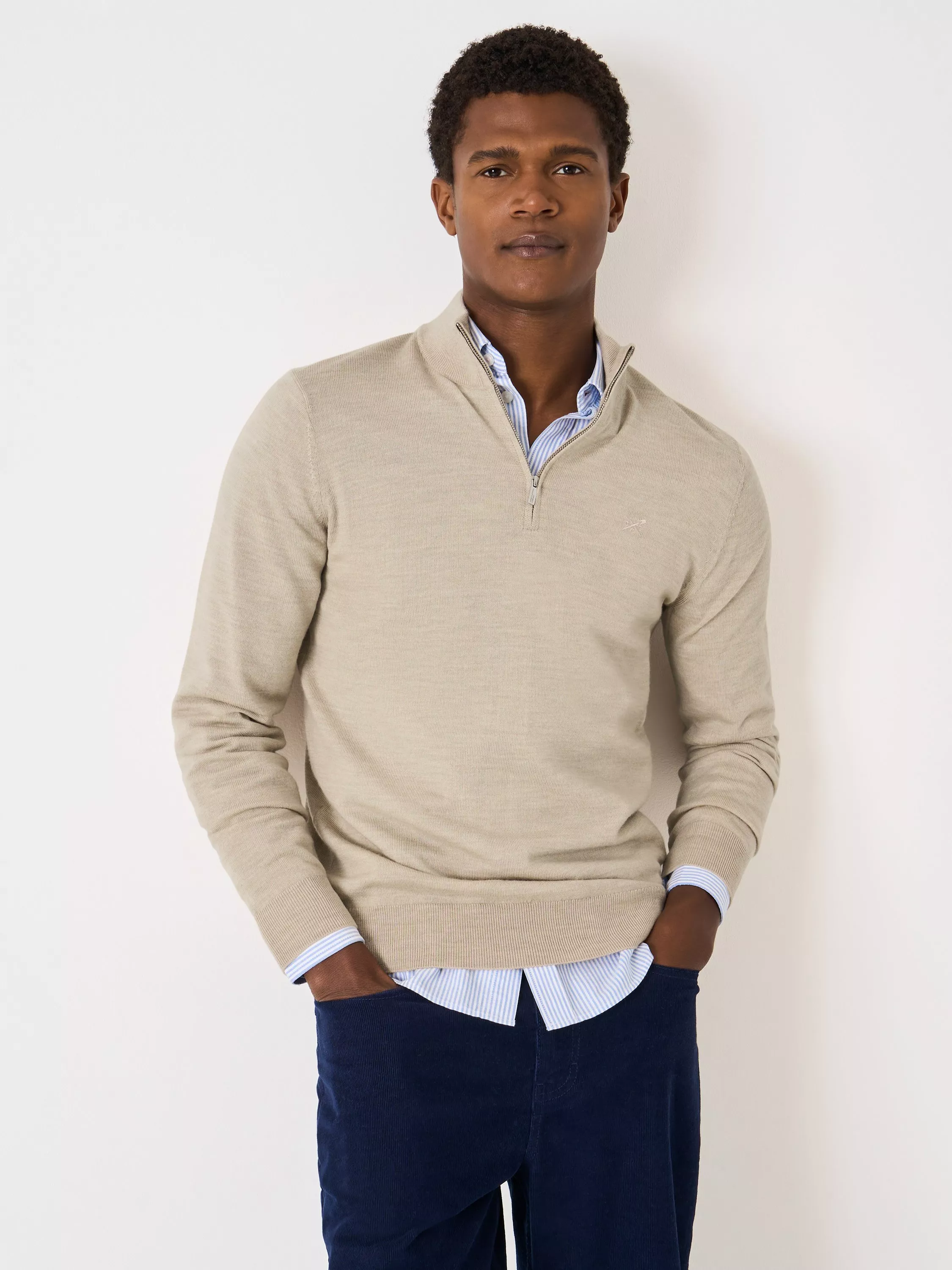 A soft merino wool jumper by Crew Clothing. Keeping you warm without fuss, it features a half-zip neck and is ideal for work, weekends, or simply making your mark wherever you go.