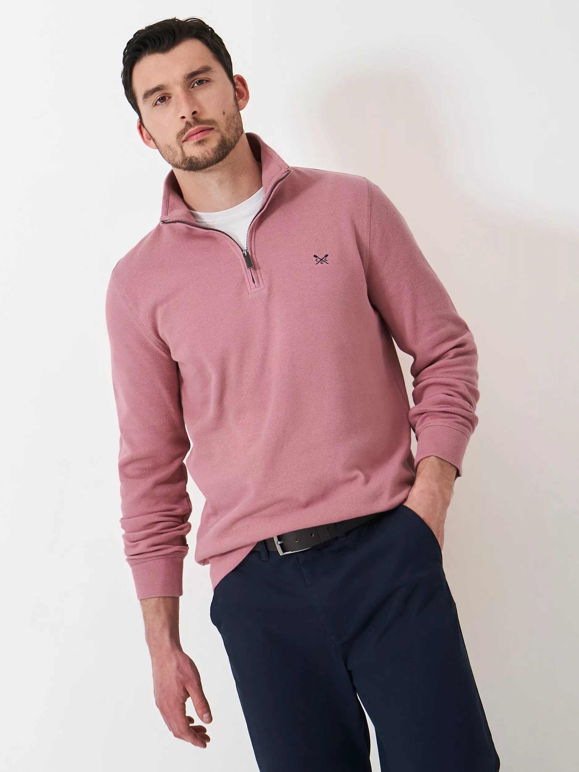 Crew Clothing's classic half zip sweatshirt. Fans of this signature style will love this stylish, soft vertical French rib knit, made from soft cotton. Stripes across the inner collar make for that extra touch. Pair with jeans or joggers for a relaxed day out and about, or around the house.