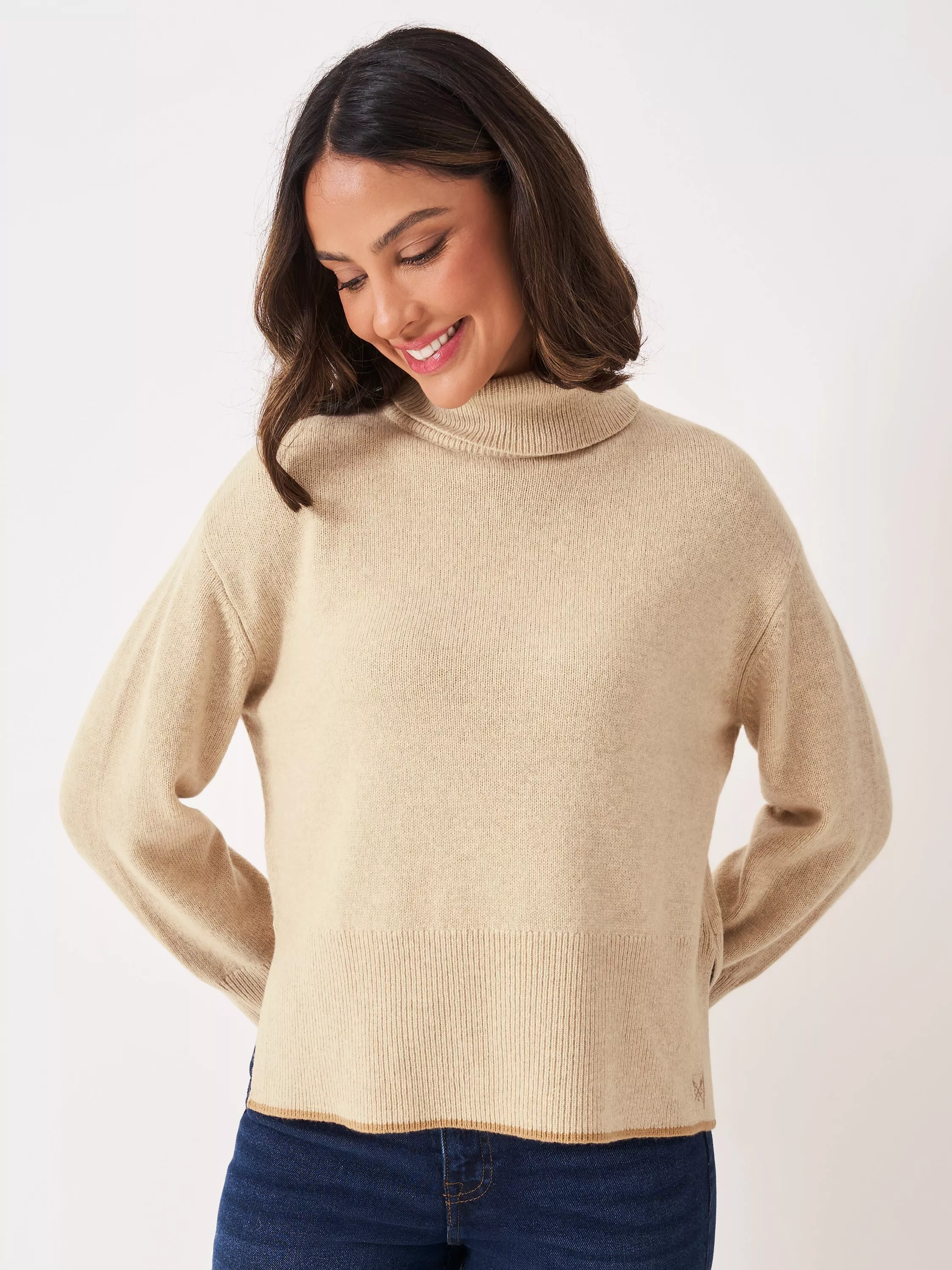 Tipped and striped with complementary dark beige, this super-soft layer has deep ribbed trims, dropped shoulders, and a funnel neckline.
