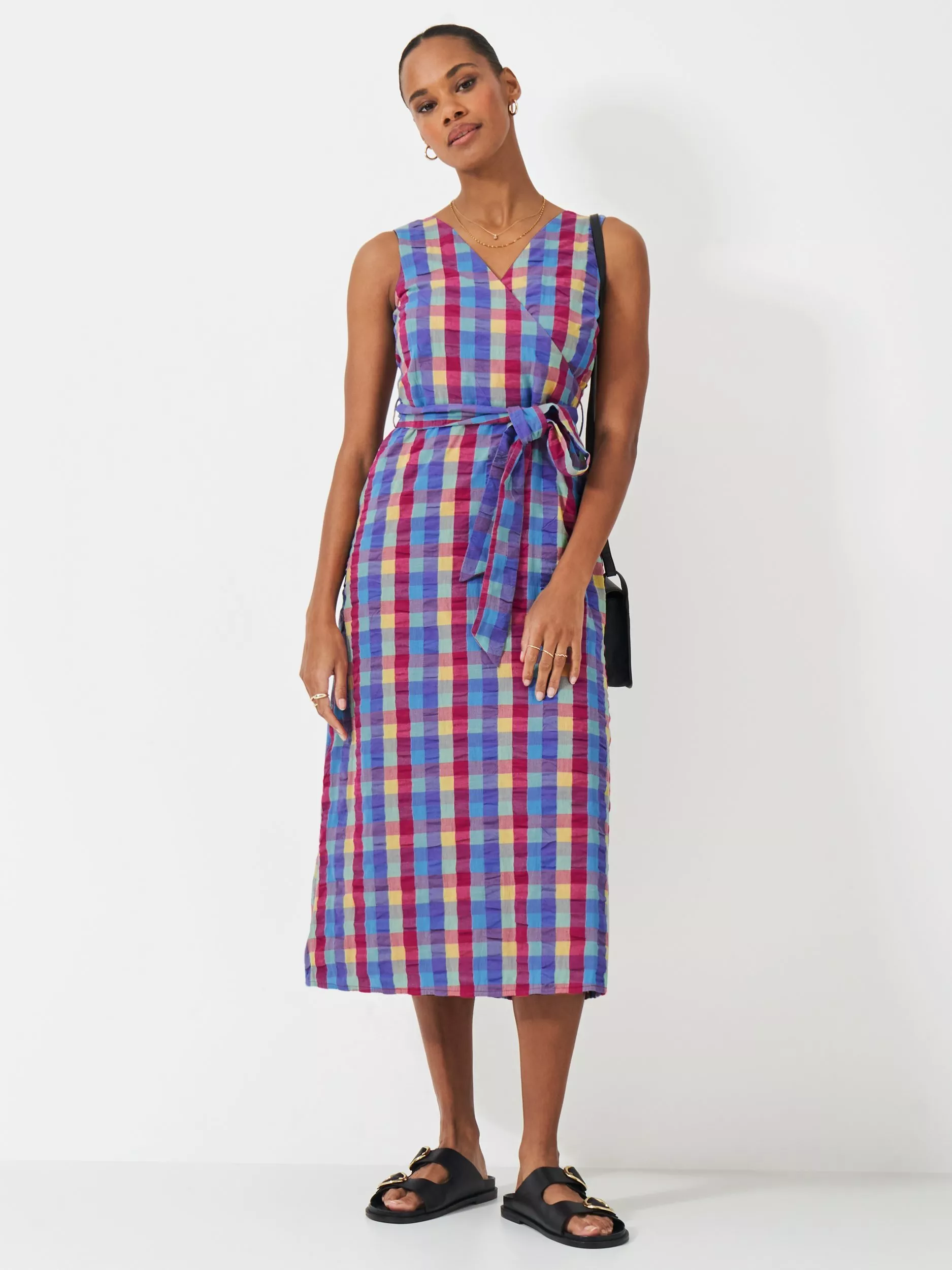 The Jenny cotton dress makes warm-weather outfitting a breeze. Boasting a red, navy and yellow check pattern, wrap-over-effect bodice, and tie-up belt to cinch in the waist, this dress is certainly not one to miss. Plus, a square-shaped back detail and gently flared skirt add to that classic look. Comfort and style to boot.