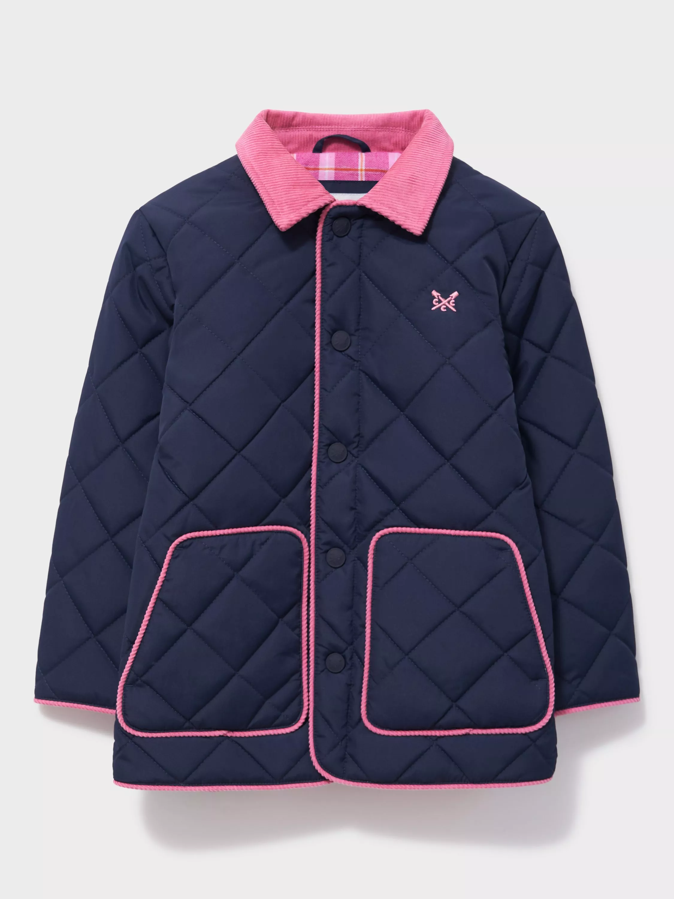 A diamond-quilted jacket in navy blue. With a pink corduroy collar and brushed check lining, it's a warm and cosy style little ones will love. Plus, this showerproof design fastens with a convenient front zip and poppers for simple dressing.