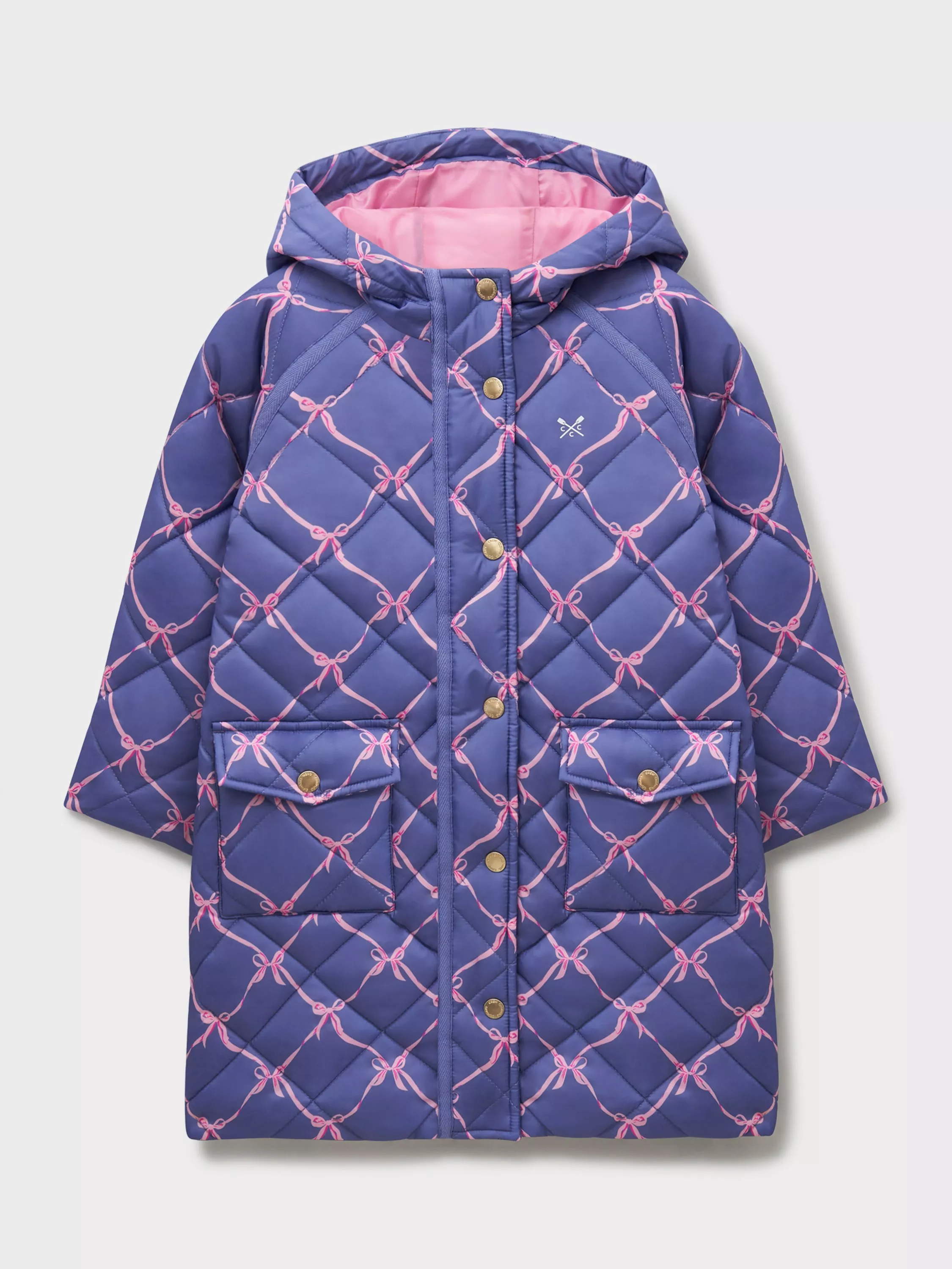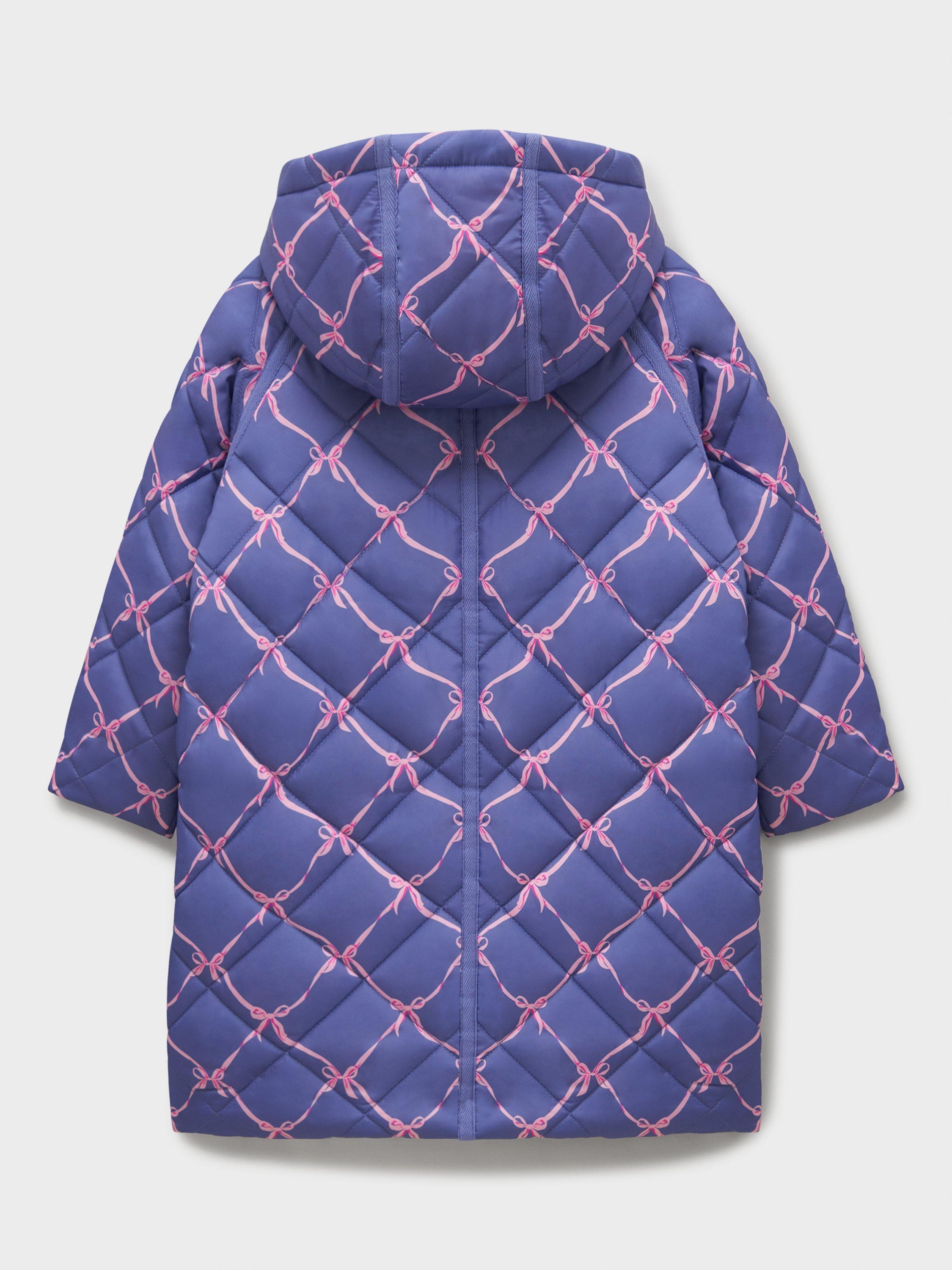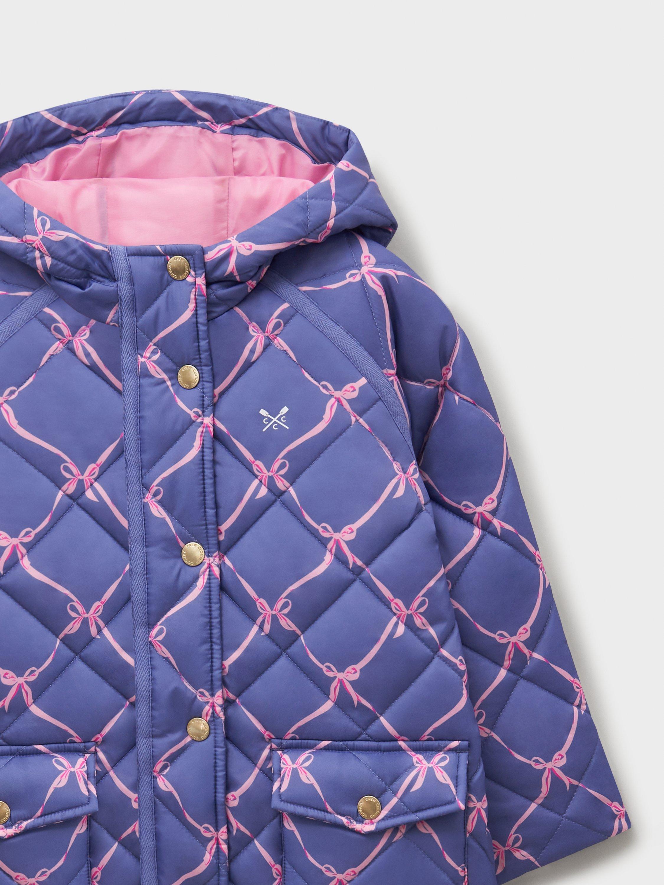 A girls' diamond-quilted coat in deep blue and pink, with a sweet bow print. This shower-resistant design has a cosy hood and soft padding for warmth. Plus, it fastens with a convenient front zip and poppers for simple dressing. The patch pockets are great for her little essentials - and they look lovely, too. Her new favourite.