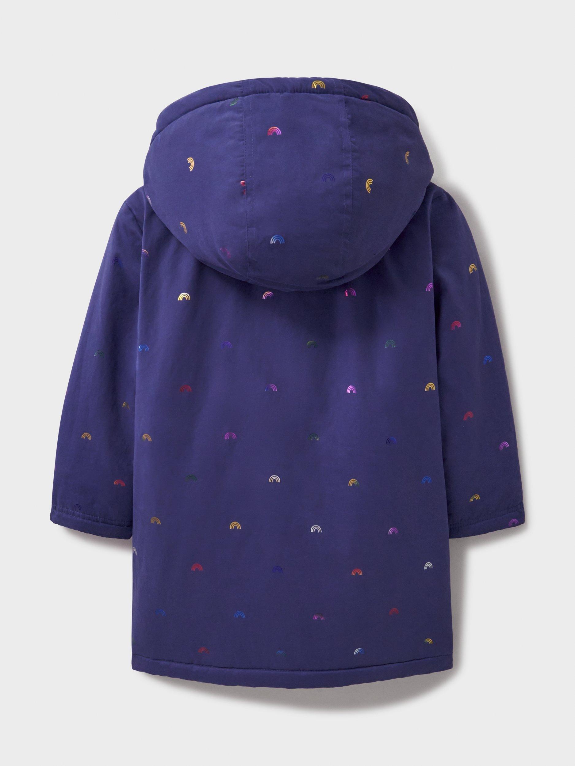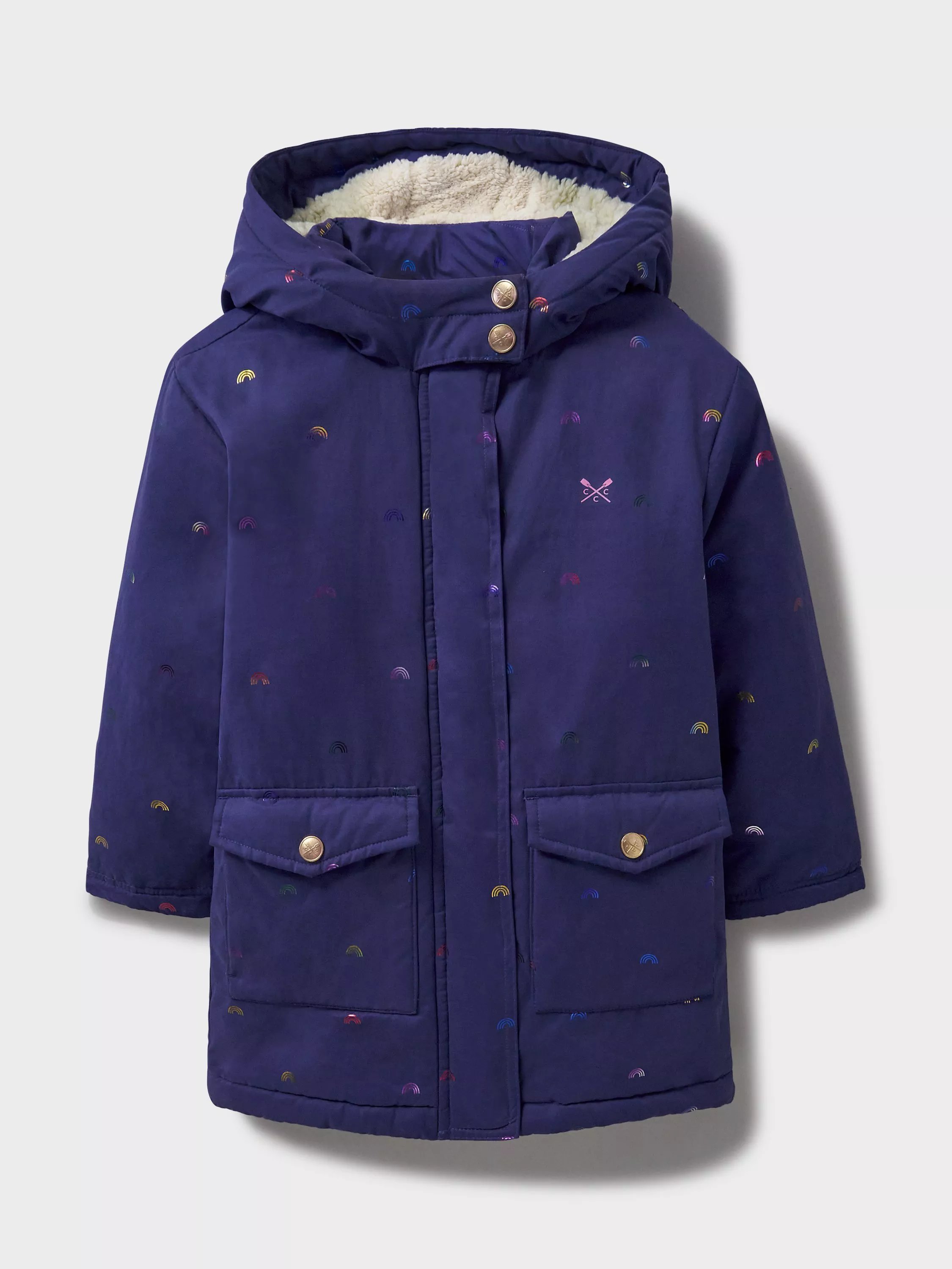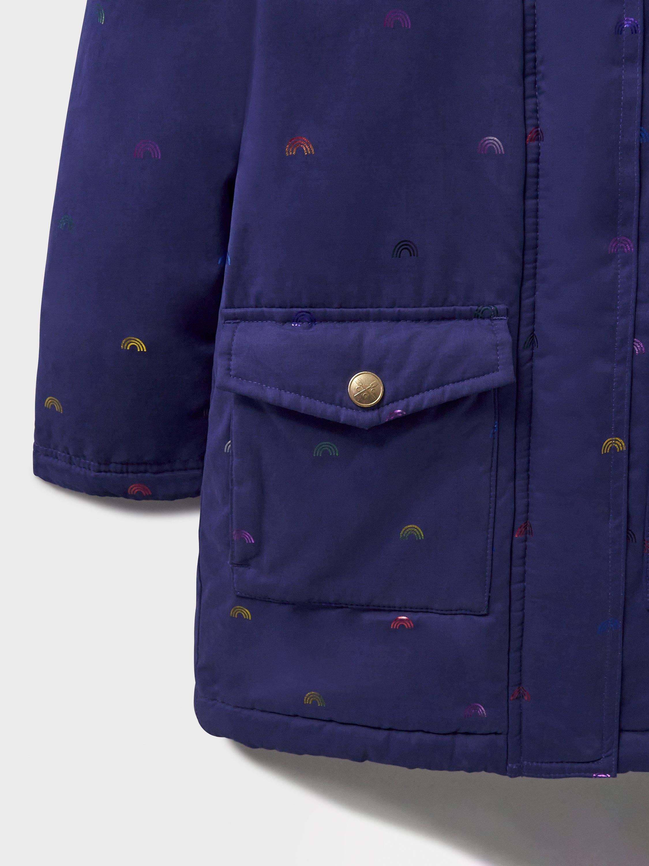 This mid-weight puffer coat in navy with foil rainbows printed all-over. Unbeatably cosy with teddy fleece lining, a fixed hood and feather-free wadding. We've added ribbed cuffs for extra cosiness, and the patch pockets on the front are very handy. It's been finished with poppers, a zip fastening and crossed oars neatly printed on the chest.