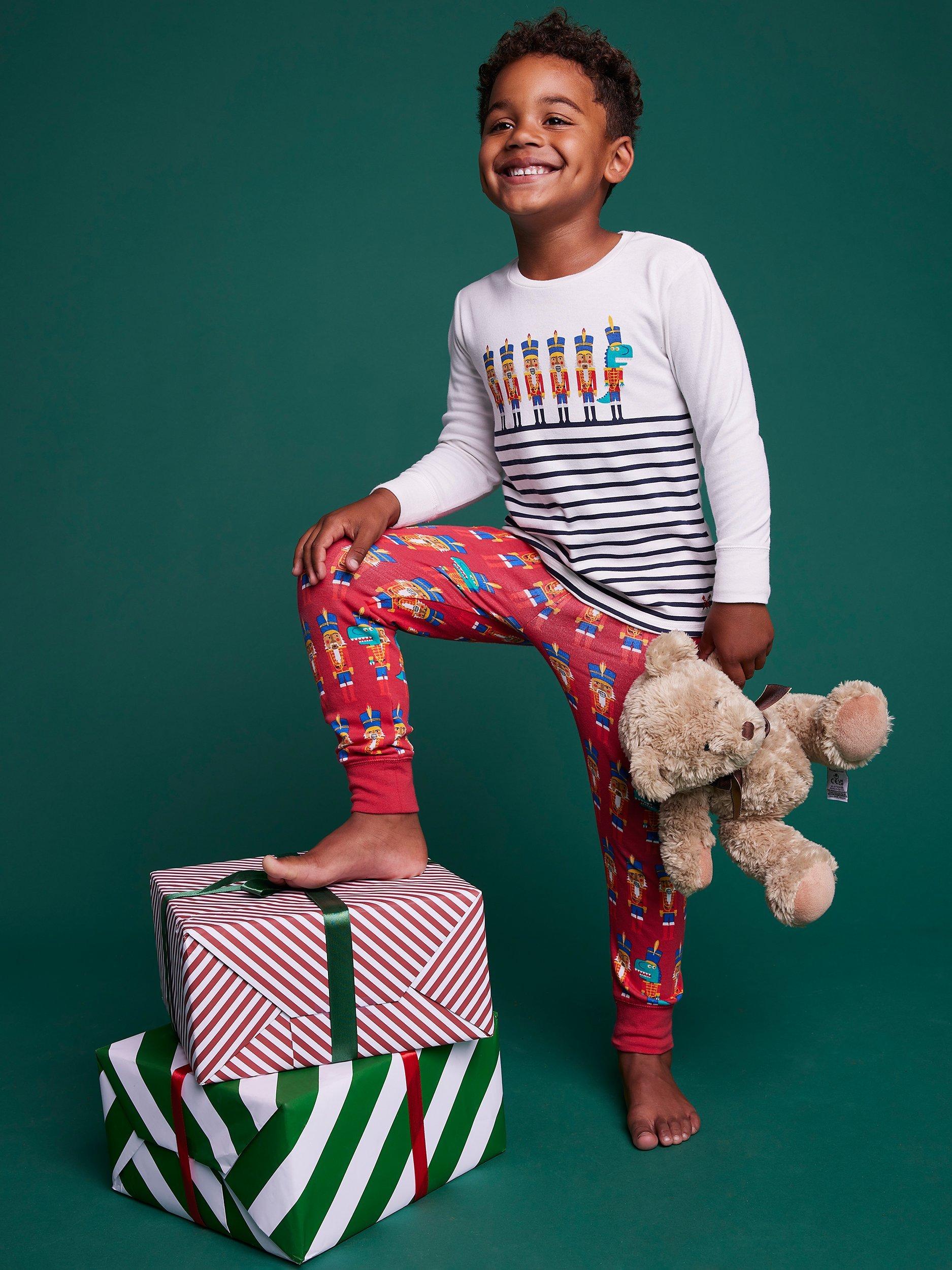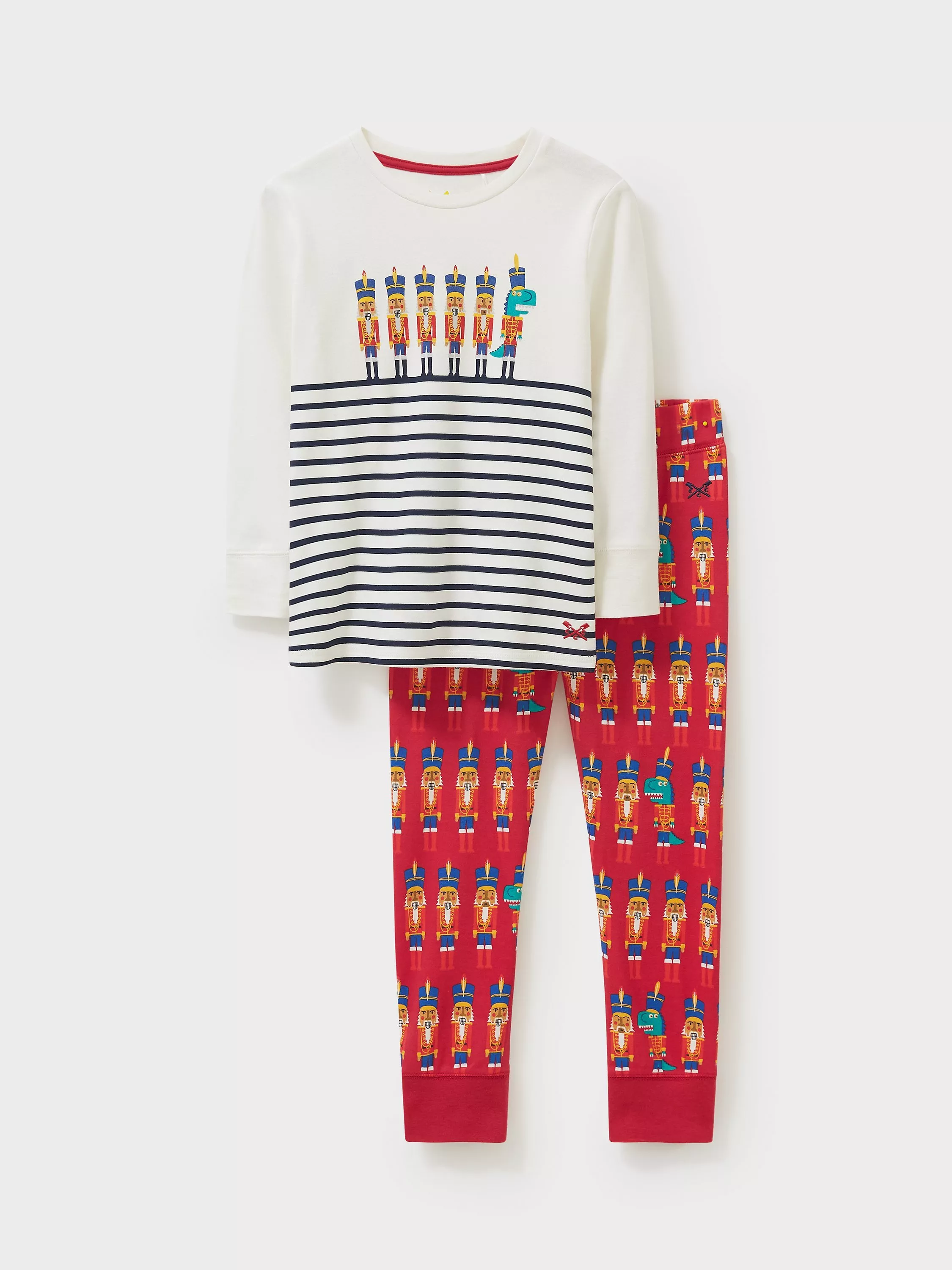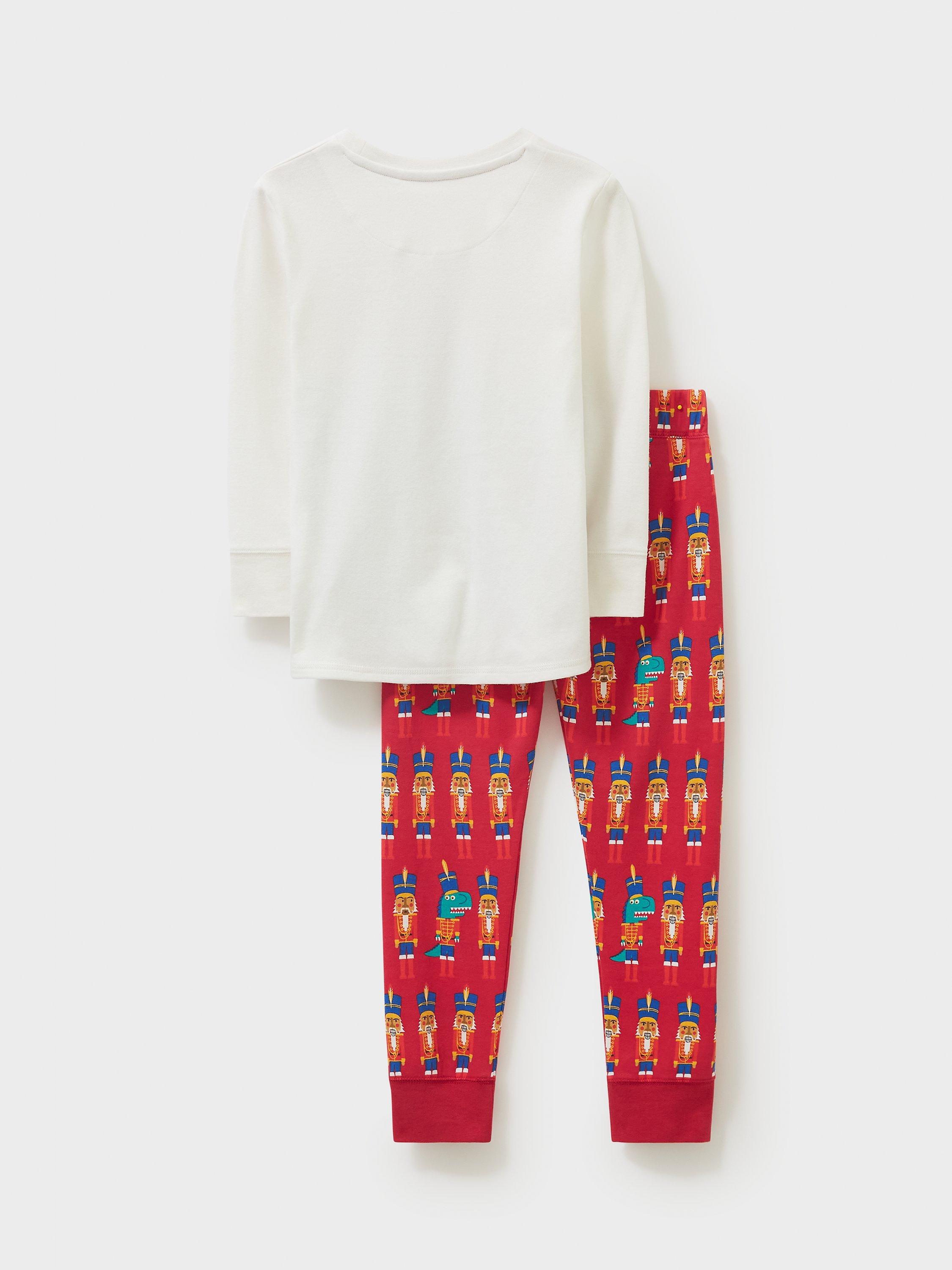 A pyjama set in white and red. The top features stripes and playful nutcracker characters, along with matching bottoms. Made from comfy cotton, this set will stand the test of time.
