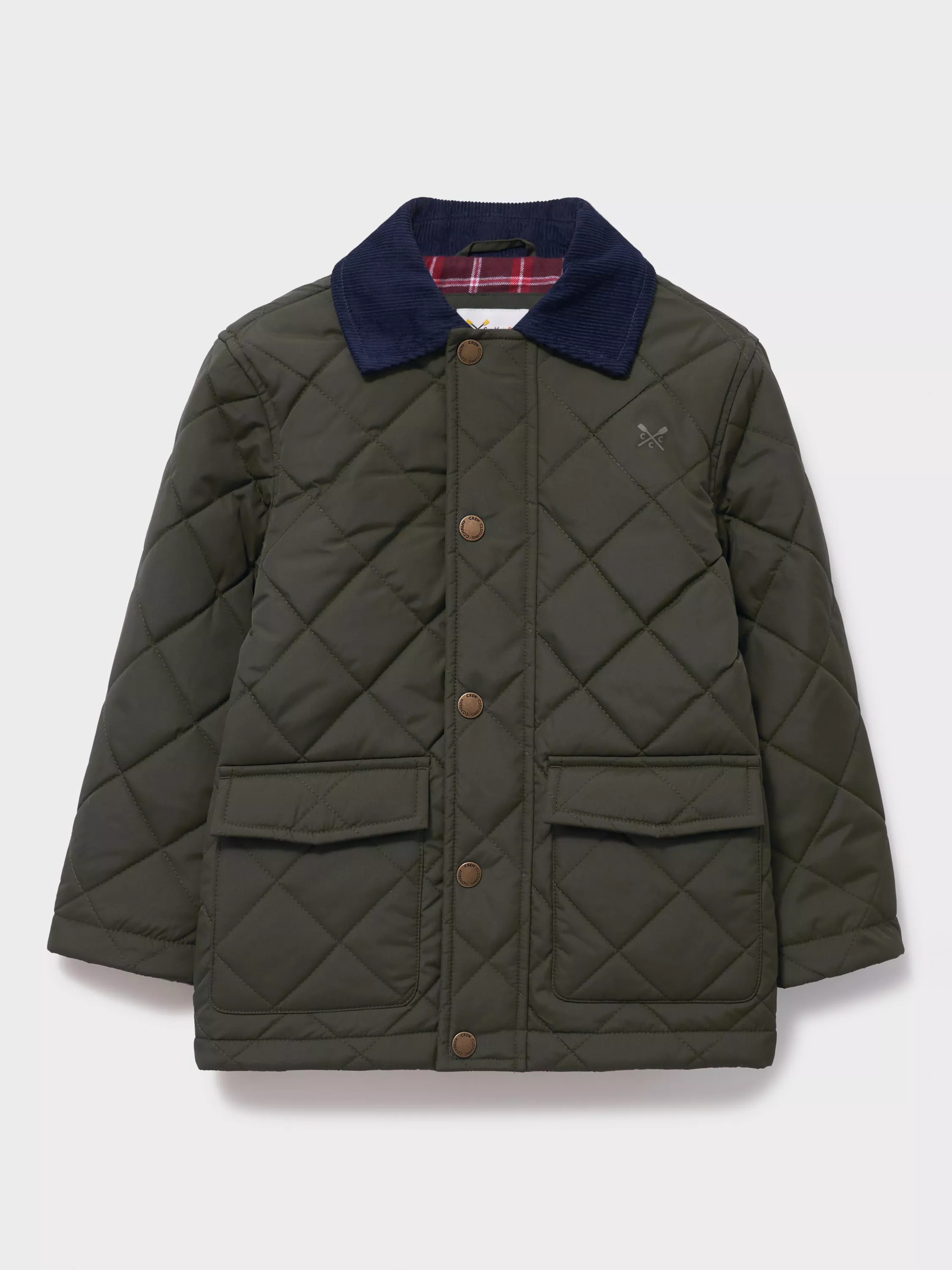 This quilted jacket is showerproof, perfect for taking on the season's unpredictable elements. The contrast corduroy collar adds interest, while snap poppers and a checked flannel lining help lock in warmth. Two flap pockets on the front are ideal for storing any treasures.