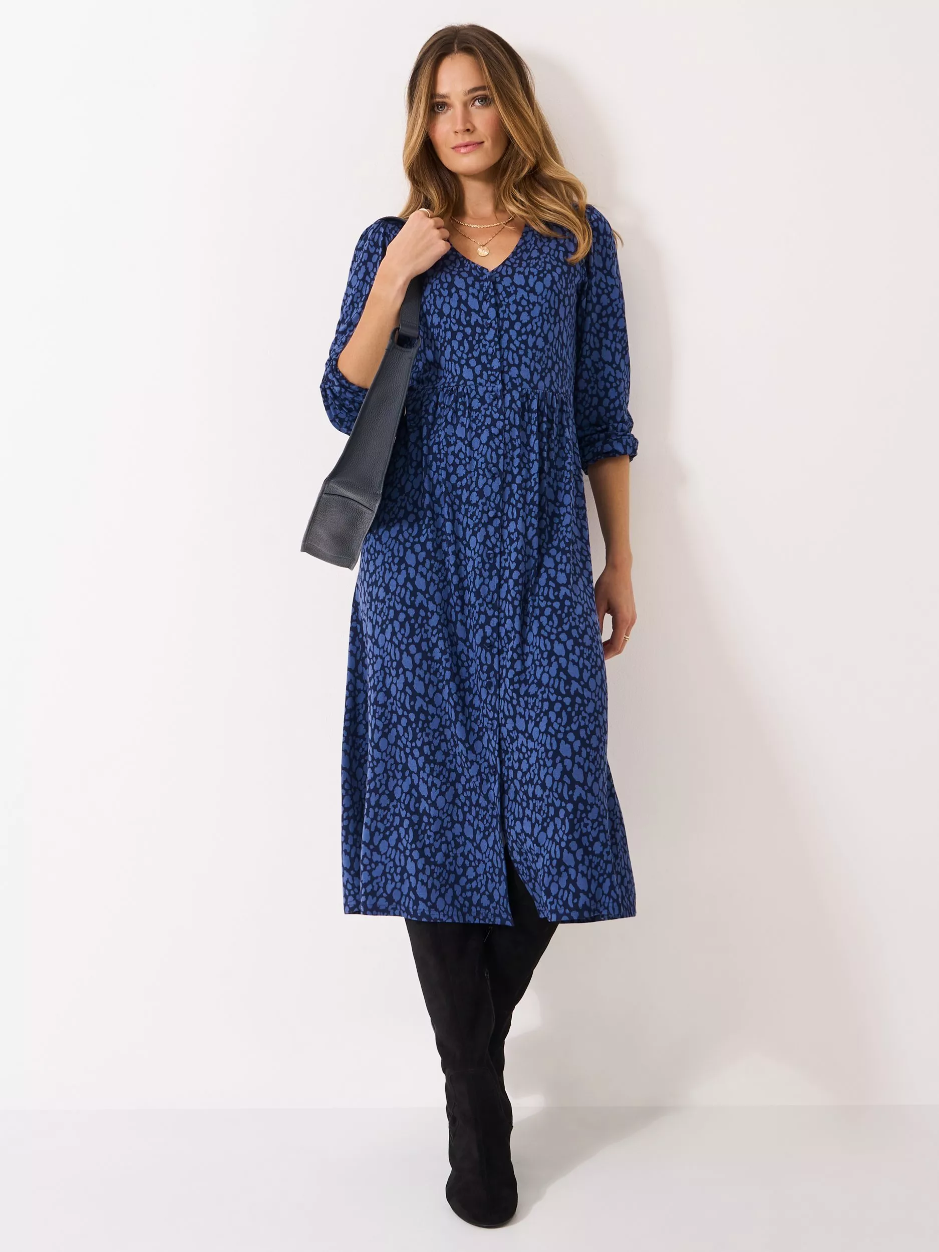 The Kiki button-through dress is designed in a blue leopard print pattern. Finishing above the knee, this beautifully elegant style is designed with long gathered sleeves, a curved waistband, buttons and a v-neckline.