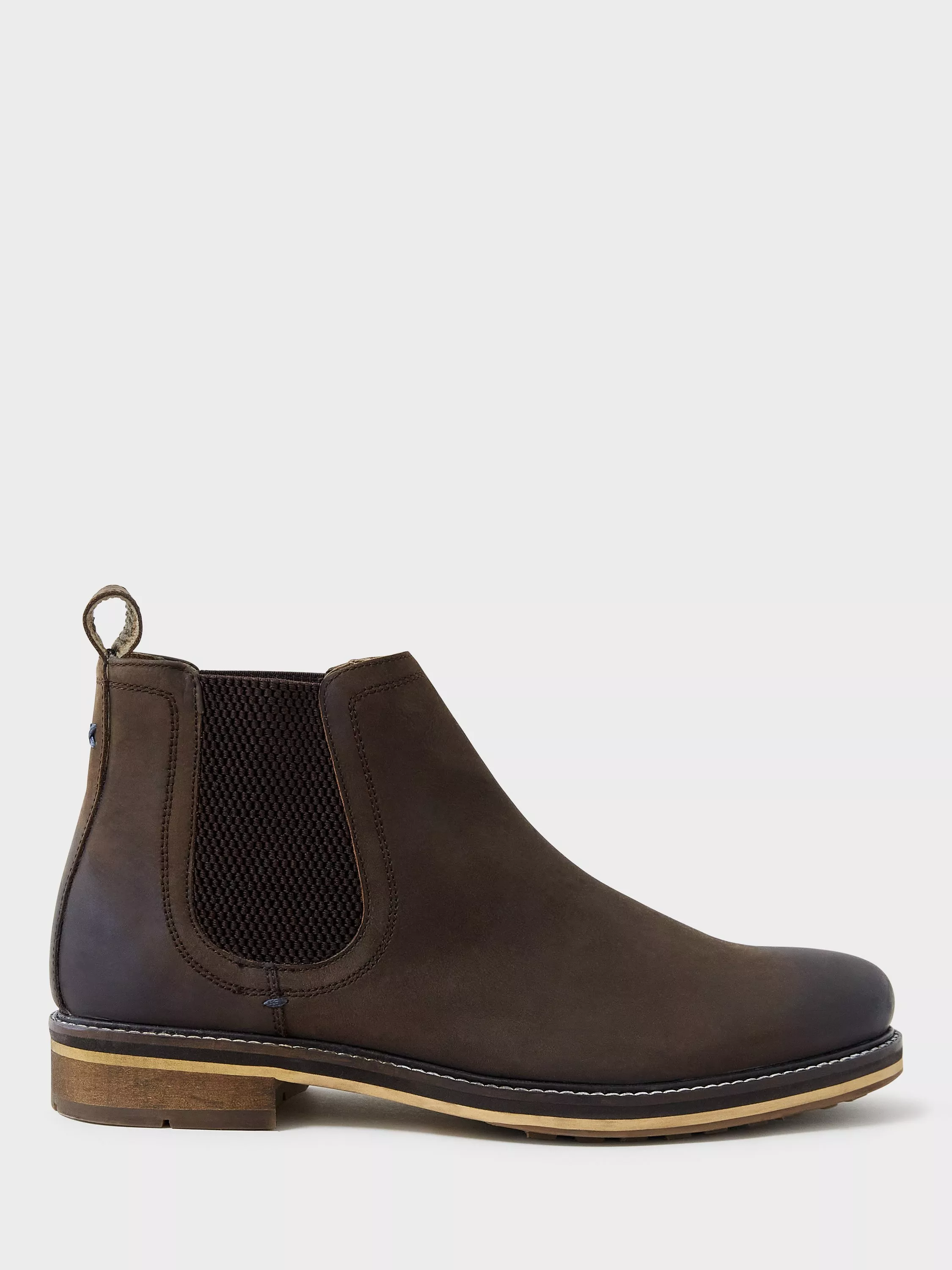 A premium leather Chelsea boot in chocolate from Crew Clothing, complete with a deep tread sole and a tab for pulling on.