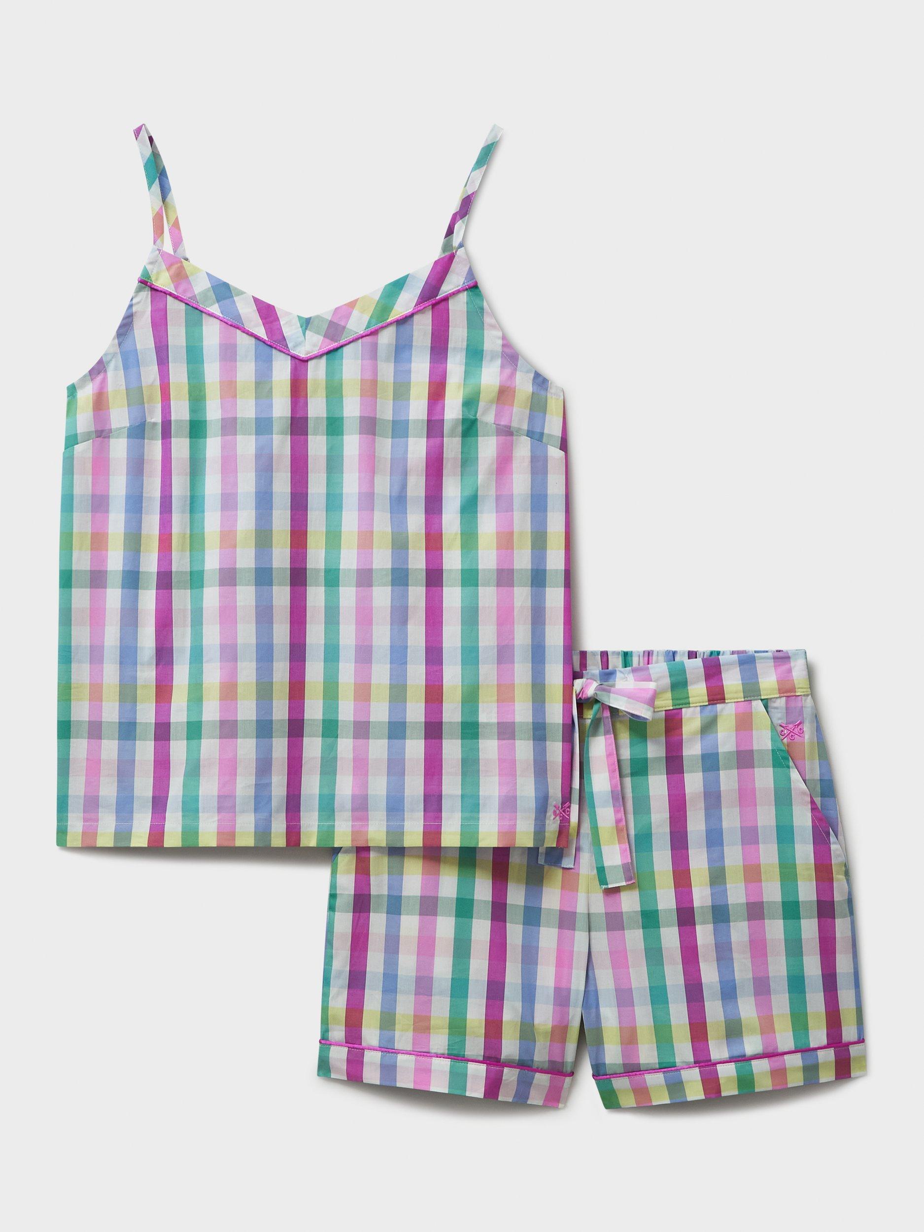 A cotton pyjama set in a pink, green and yellow multi-check pattern. Perfect for warm summer nights, this set is made in cool voile and designed with adjustable spaghetti straps, and an elasticated tie-up waist.