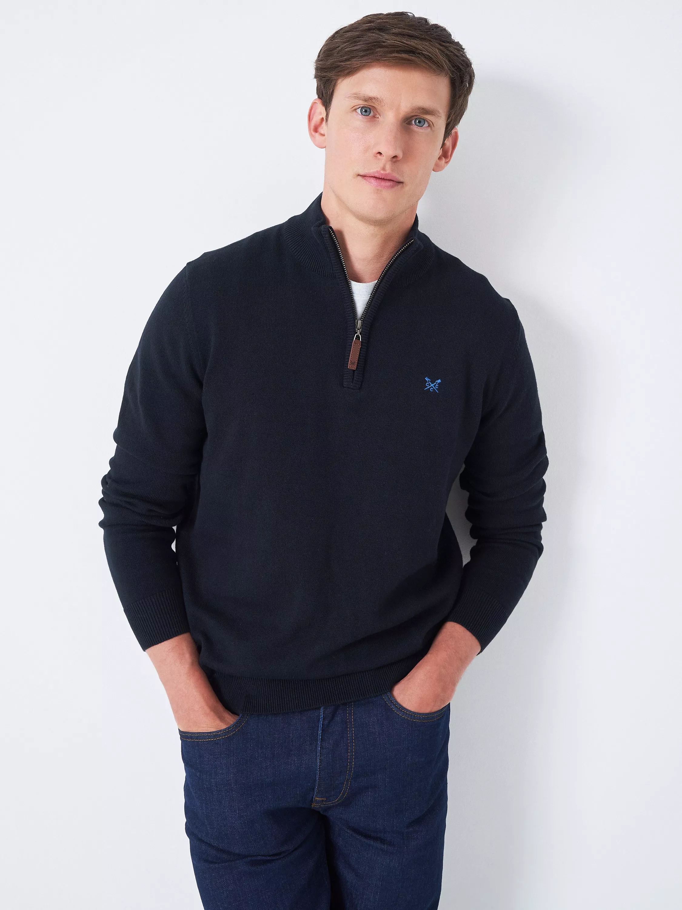 Pulling on easily in cooler climes, this half-zip jumper from Crew Clothing is made with sustainability in mind thanks to its organic cotton construction.