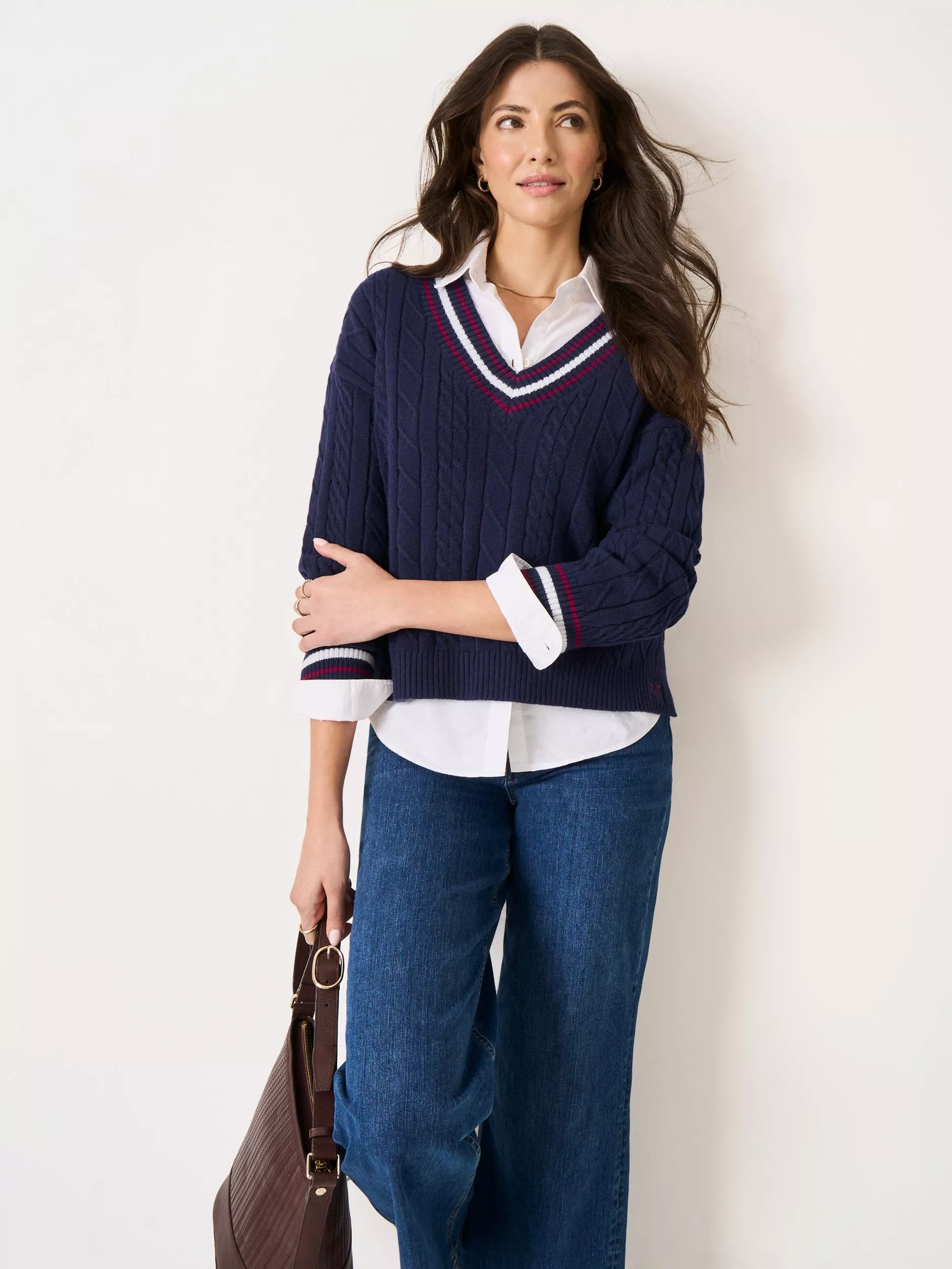 A cable-knit cricket jumper in stripes. Its super-soft, chunky-knit material will keep you warm, plus, it'll drape beautifully for a flattering look. The jacquard stripes, V-neckline and crossed oars embroidery are stylish touches, too.