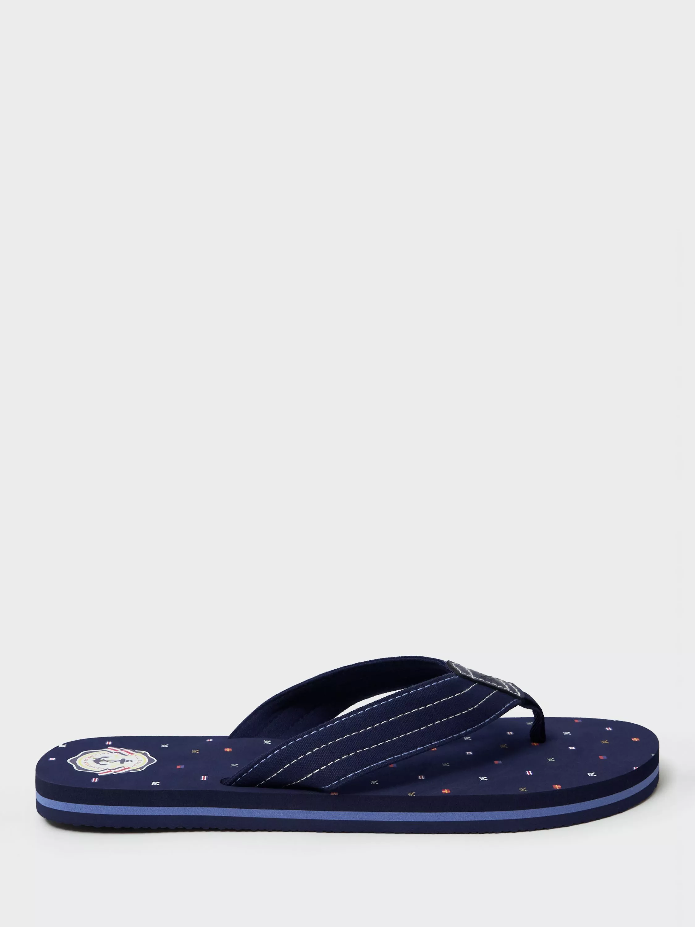 Men's flip-flops designed with a comfortable fabric strap with subtle stitching and small crossed oars detailing. Nautical crest artwork and semaphore motif give the shoes plenty of flair, too.