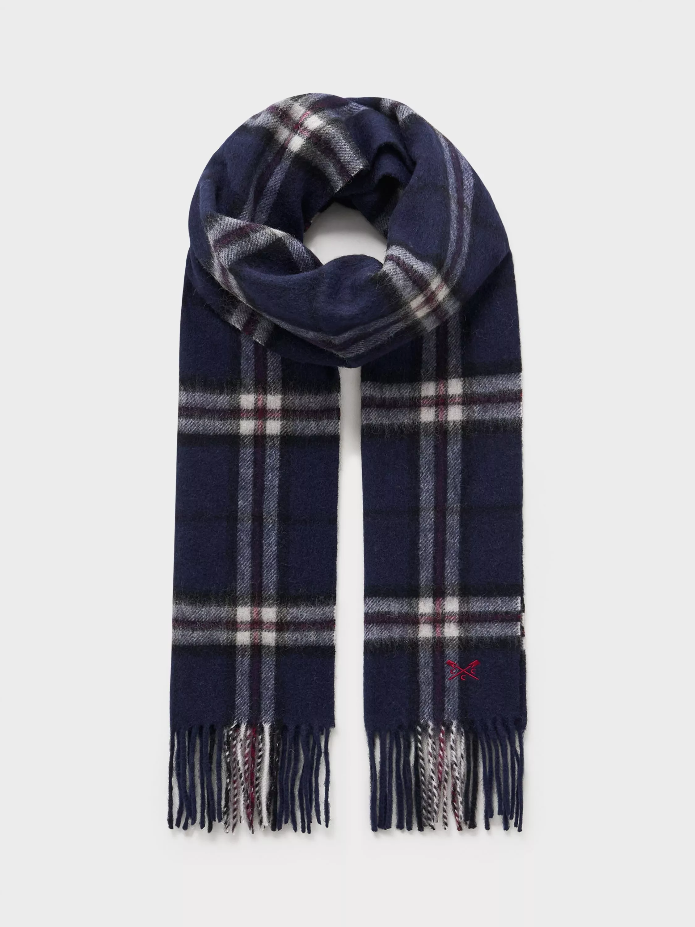 A super-soft wool scarf in a navy check. Made from cosy lambswool, this durable, comfortable scarf is finished with a tassel trim and subtle Crew branding. Layer it on over a jumper or jacket. A refined classic that also makes a great gift.