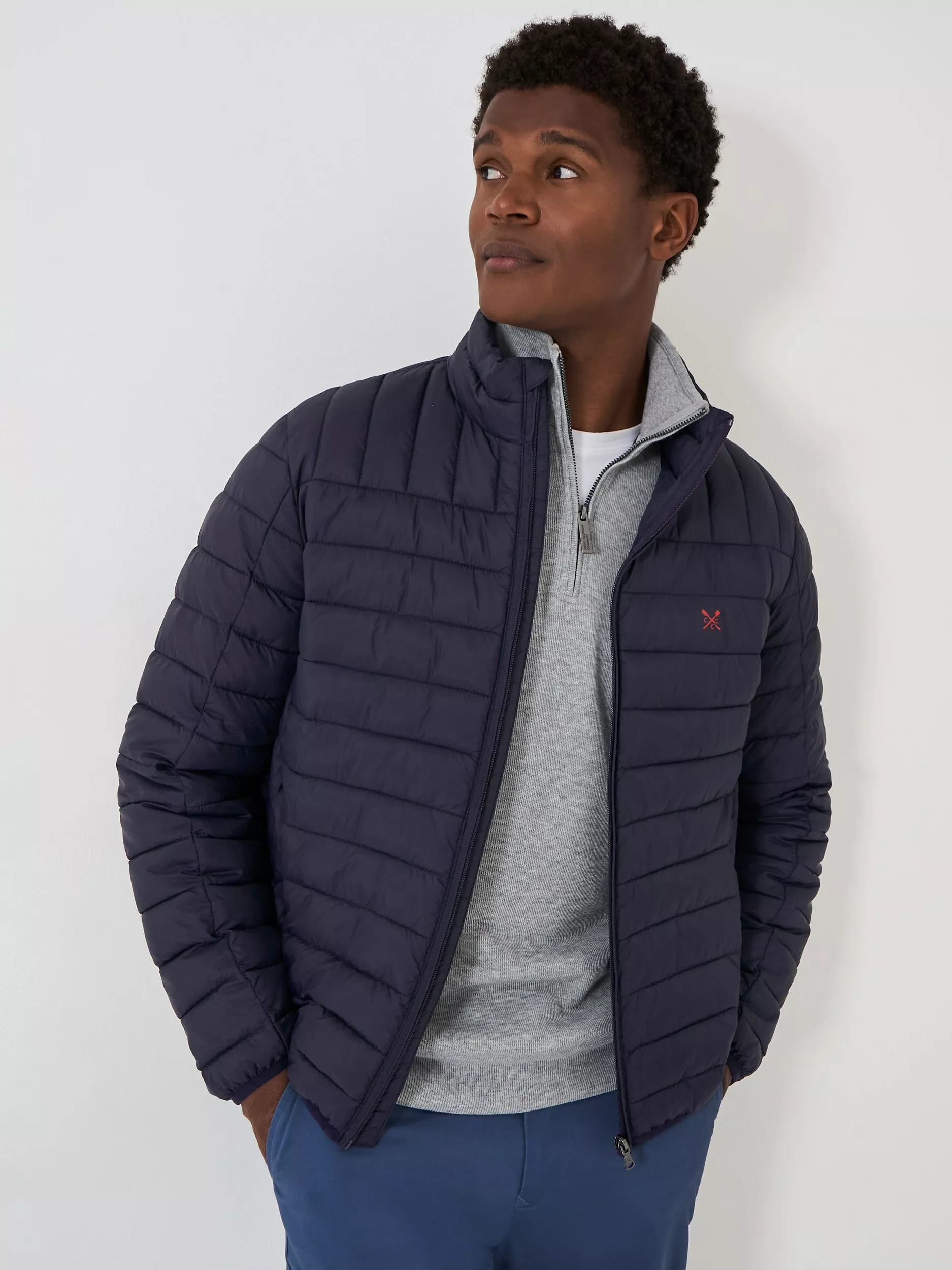 This warm quilted jacket from Crew Clothing will be your new go-to. Featuring a funnel neck, two pockets, an exposed zip pull, and filled with feather-free wadding.