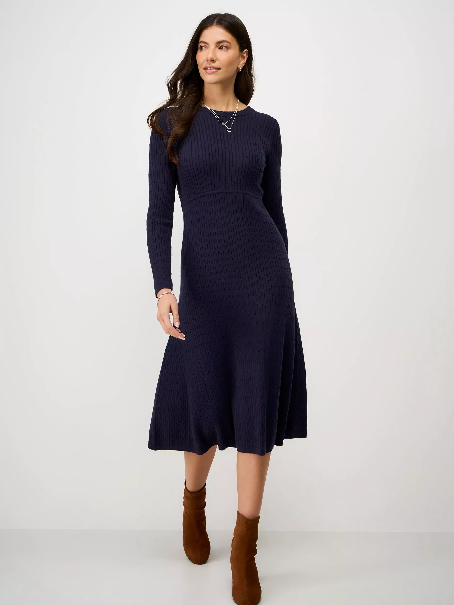 The Roxy cotton cable-knit dress - a firm favourite. Cleverly structured, it cascades into a gently flared skirt to give plenty of movement. The long sleeves help keep you warm on changeable-weather days, and the midi-length silhouette is super-flattering. A timeless piece that'll look effortless paired with your favourite suede boots.