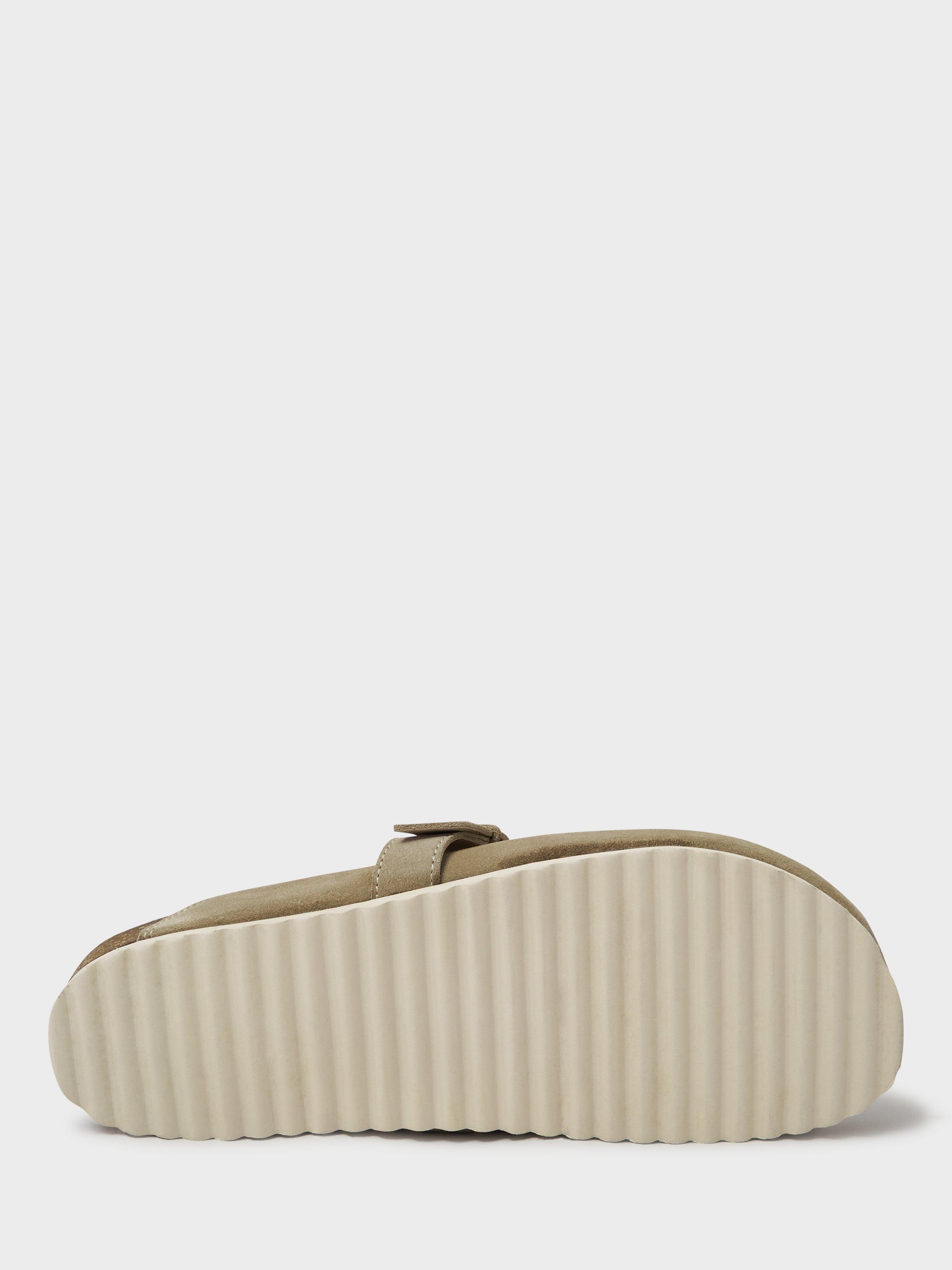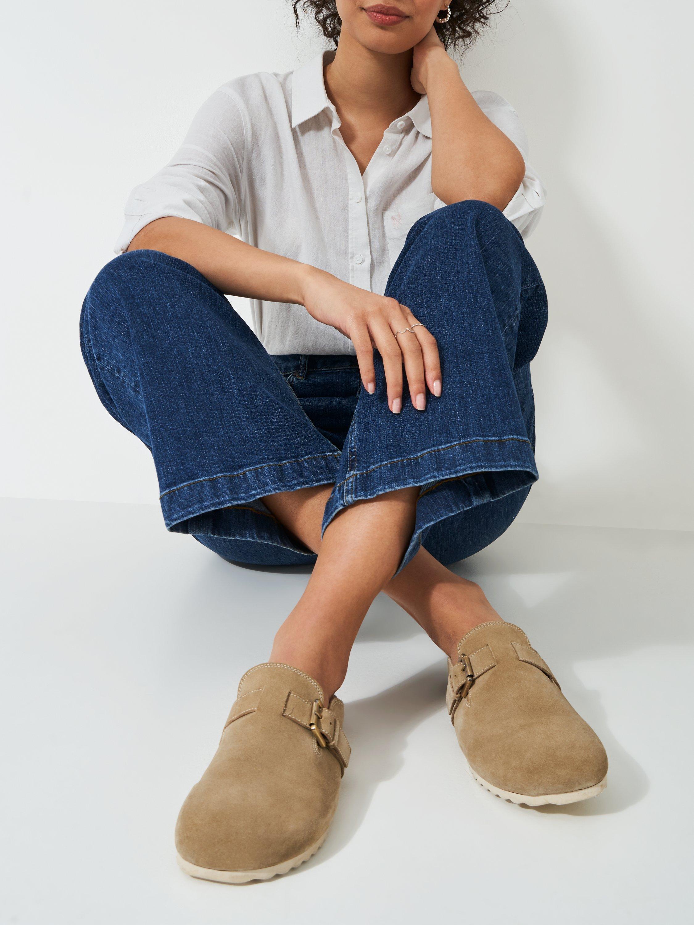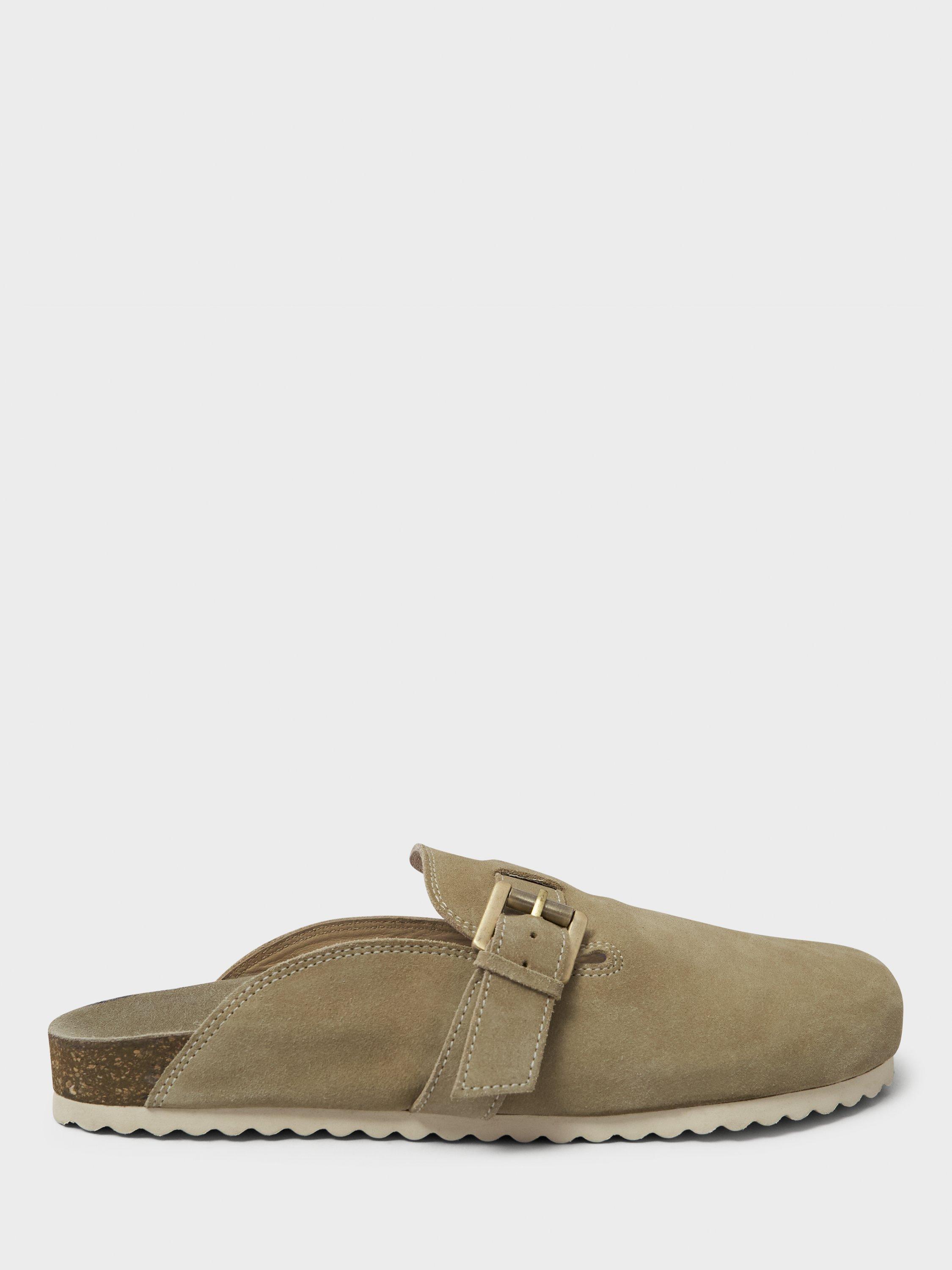 Presenting suede-leather mules with a chunky buckle detail. With comfort in mind, these slip-ons are lined in soft leather and fitted with a treaded sole. Contrast stitching and embossed branding add interesting elements. Perfect for everyday styling, these must-have flats make any outfit special.