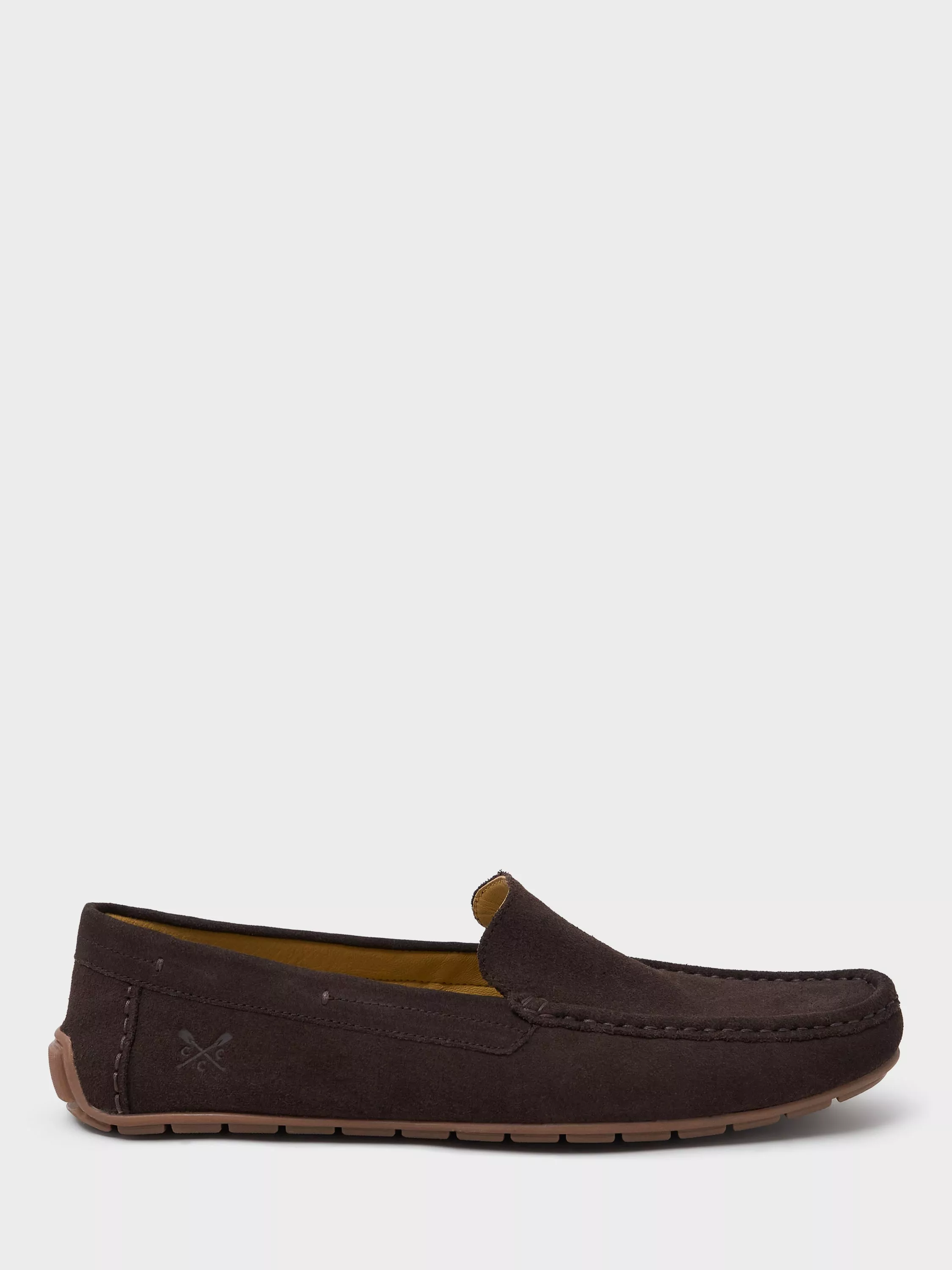 A pair of leather loafers from Crew Clothing, featuring lace-up design and a comfortable round toe for daily ease. An authentic driver style, they are designed with contrasting white stitching and rubberised grip studs on the sole.