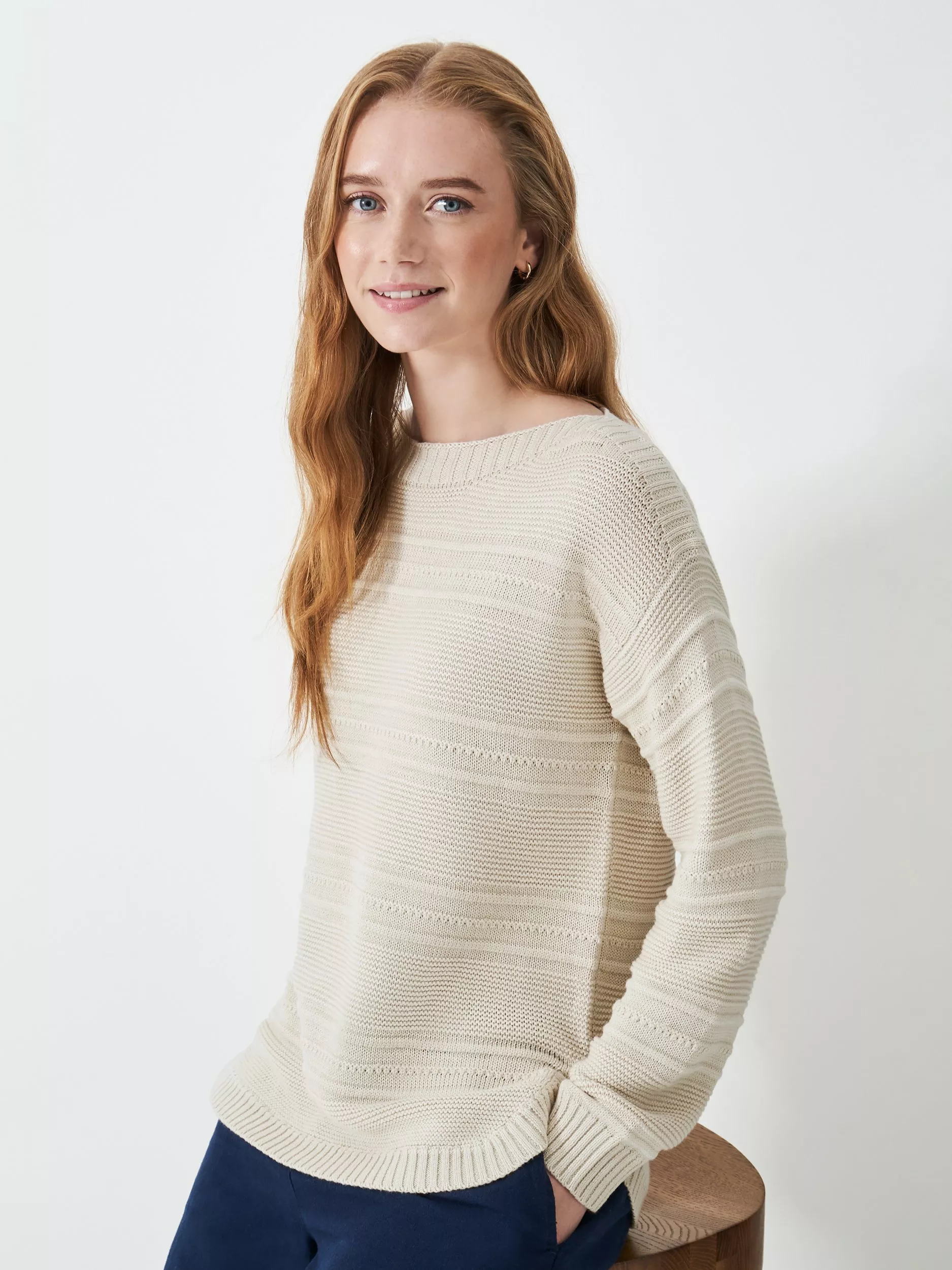 Crafted from a cotton mix, this jumper has a curved, split hem, ribbed hems, and subtle striped stitching. Pair with boxy light jeans and A-line skirts. This knit deserves a spot in your wardrobe.