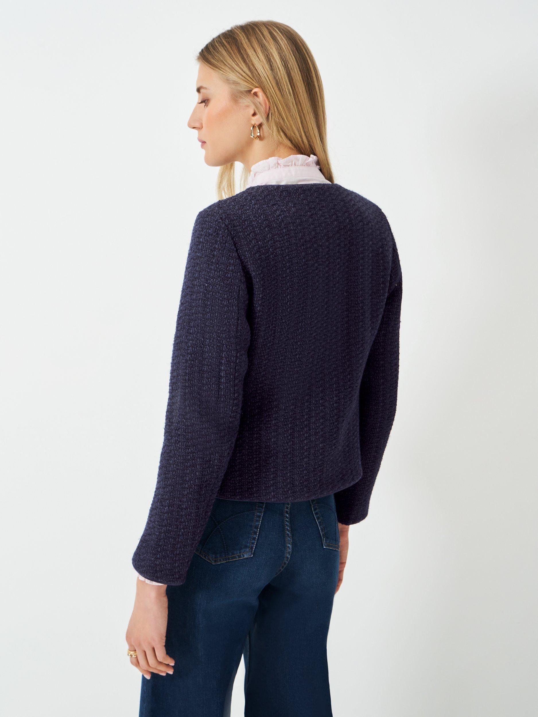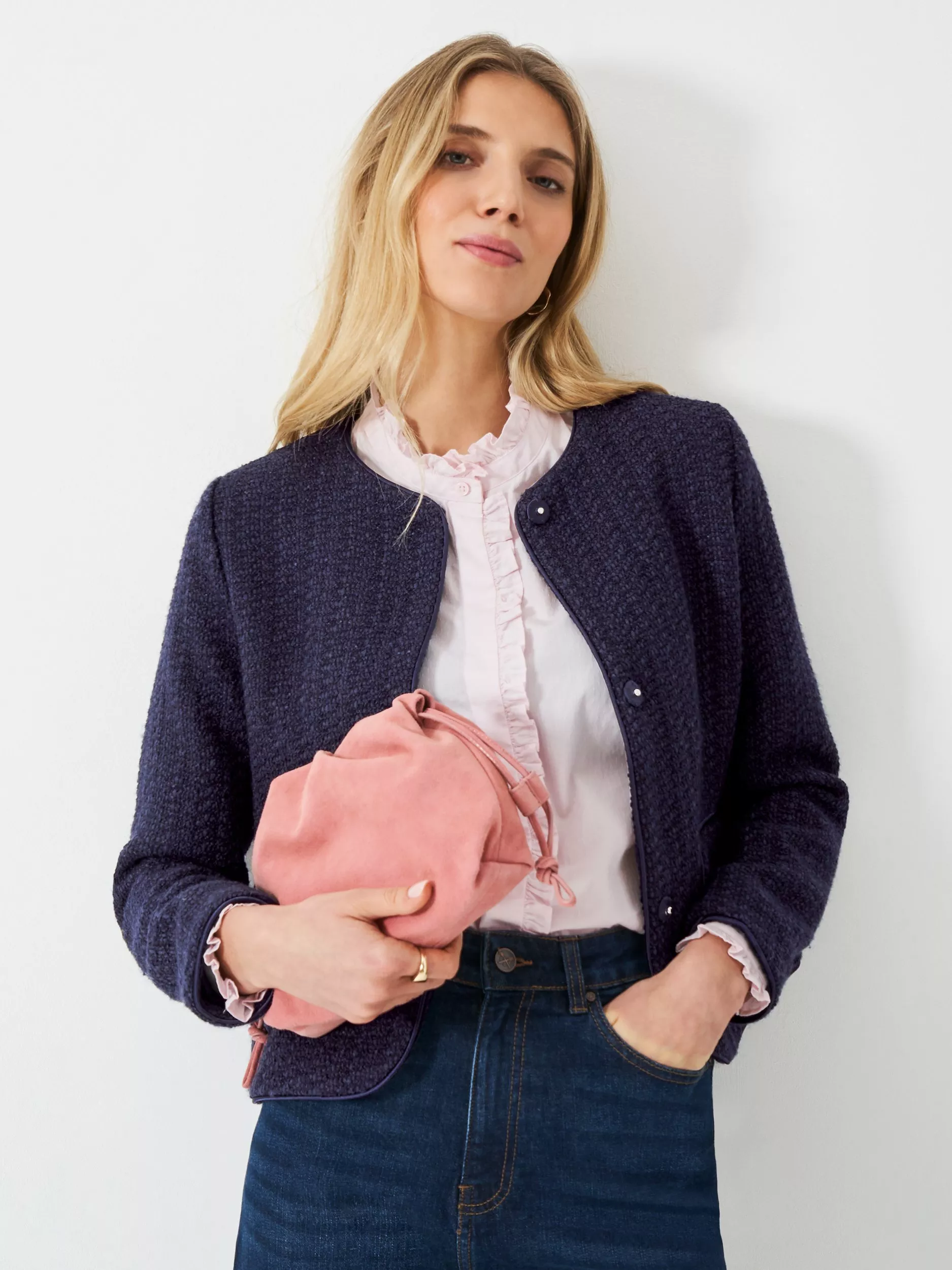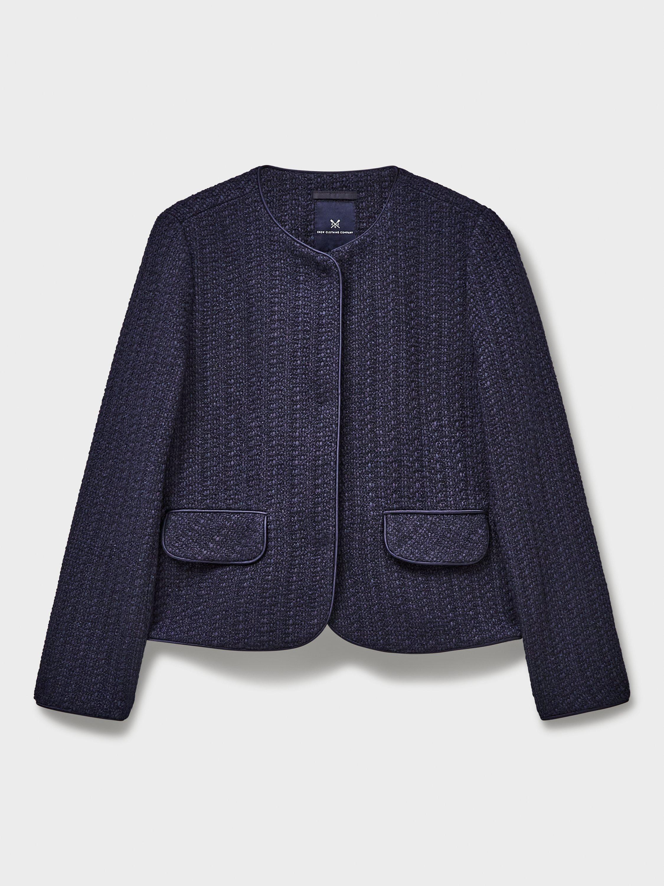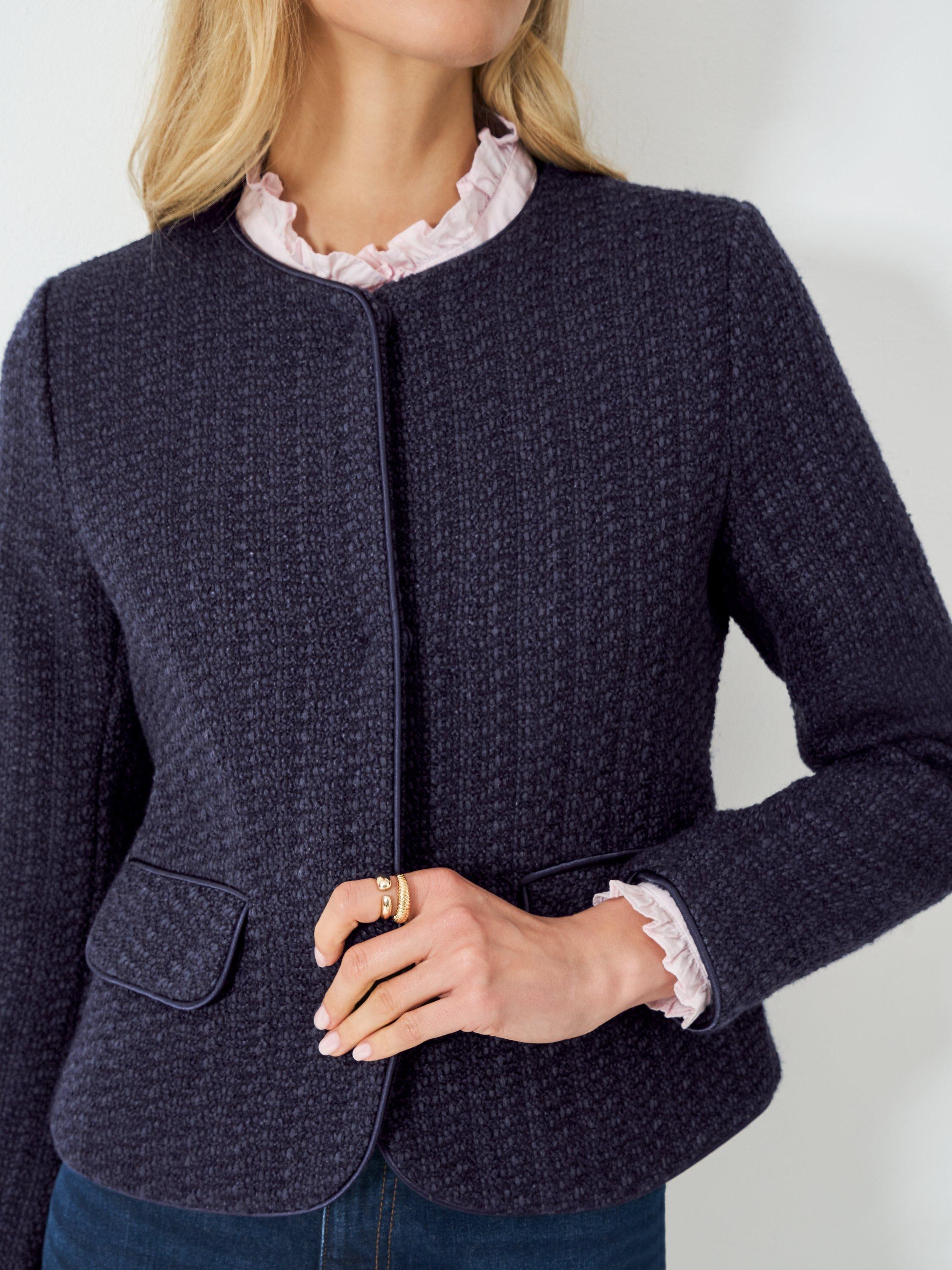 Trimmed with satin piping and designed in a boxy, slightly cropped shape, it's the perfect jacket for both work and play. The soft, textured fabric adds interest, while the hidden snap fastenings help create a super-clean look. Notice the subtle crossed oars embroidered just above the inner hem, too.