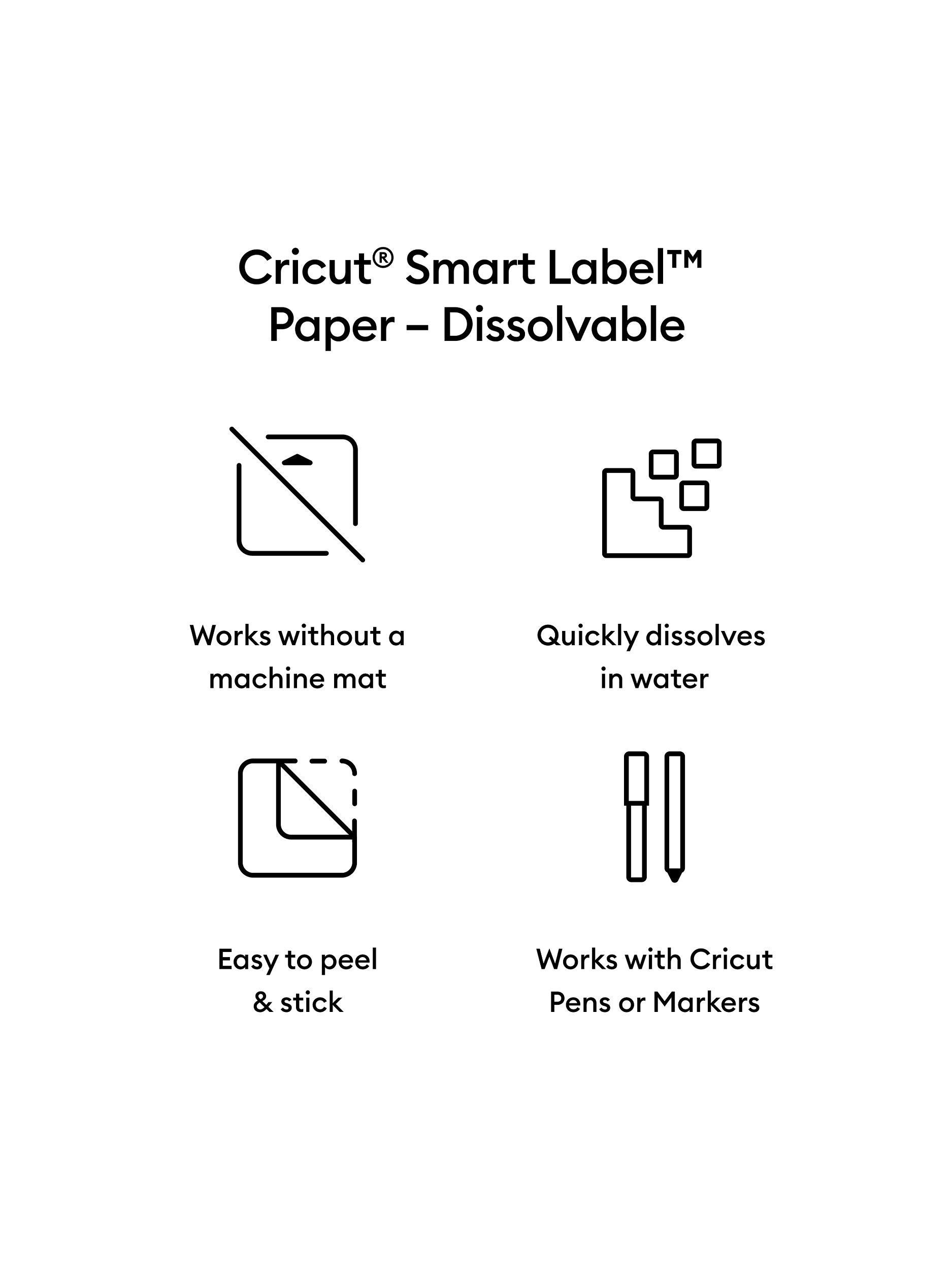 All the ease of labels without the sticky waste. Cricut Joy™ Dissolvable Smart Label™ Paper is designed to dissolve, making it a great solution for labelling leftovers, party cups, kids' sundries, and much more.When you're ready to clean the surface, place the label under running water, or put the item in the dishwasher for a residue-free result. This clever material works without a machine mat, so you can just load and go.