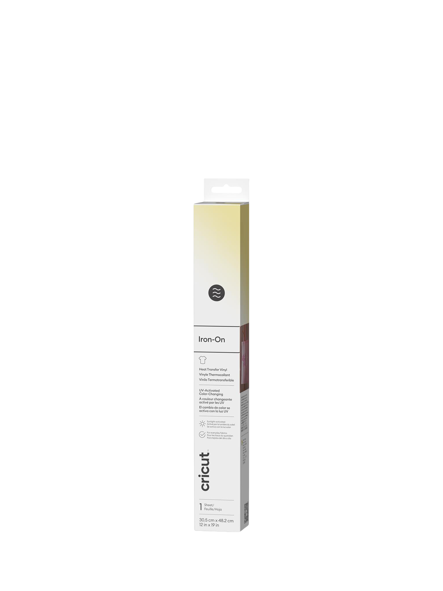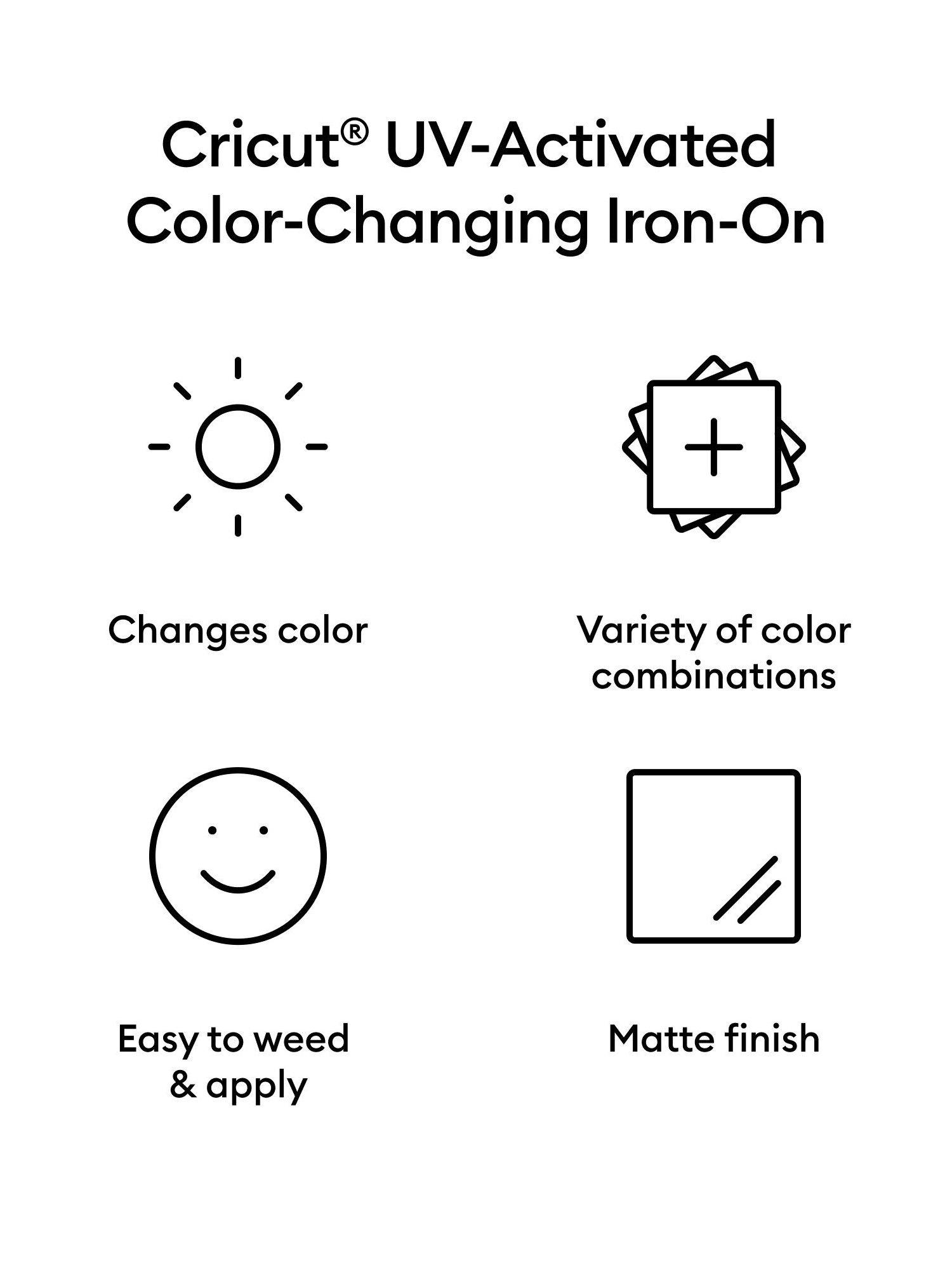 Let the sun transform your designs with Cricut® UV-Activated, colour-Changing Iron-On. This marvellous material changes colour when exposed to sunlight, making it ideal for clothing, accessories, and outdoor decor.