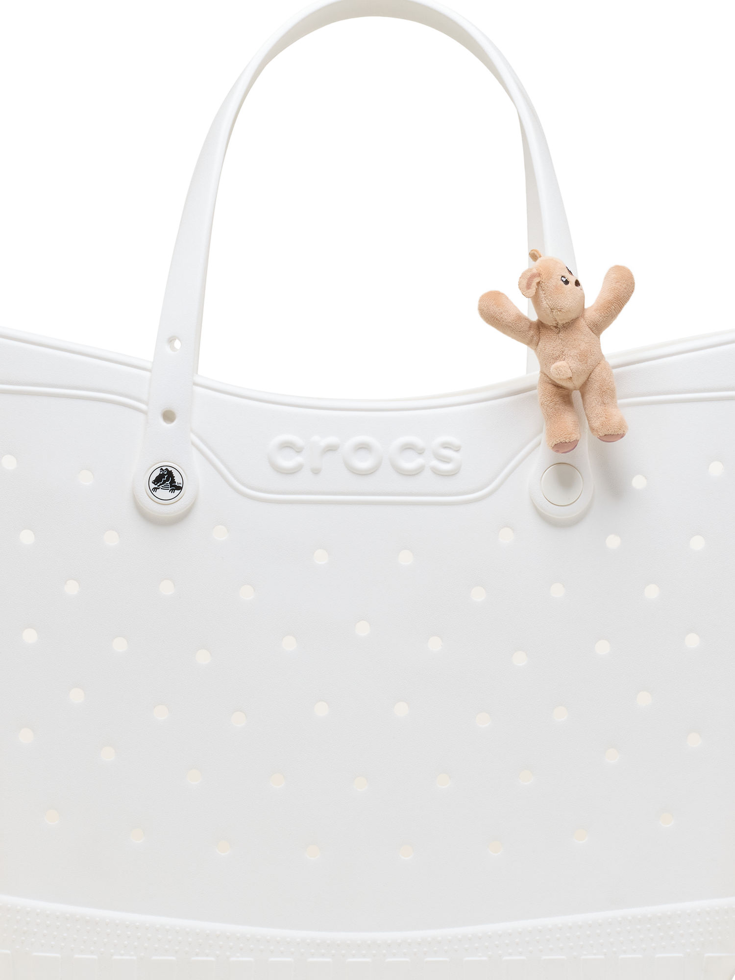 Plush and playful, carry this puppy Huggitz™ with you by popping its belly into a Jibbitz™ charms hole on any shoe or remove the backer to attach to a purse or water bottle handle with their riptape hands and feet.