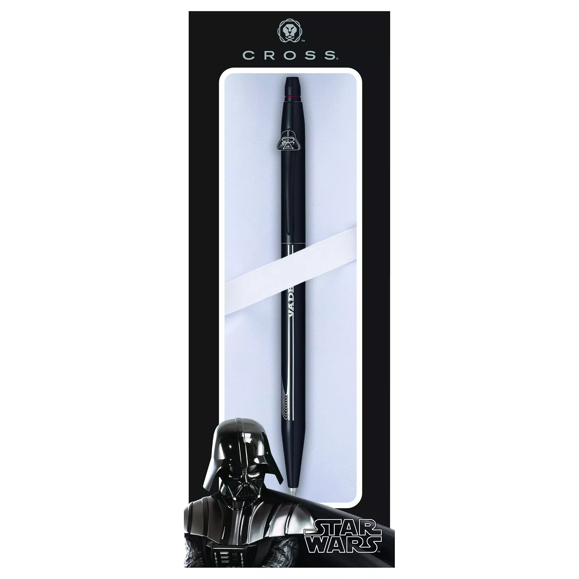 Part of Cross's Click Star Wars collection commemorating 3 iconic characters from the original Star Wars trilogy, this rollerball pen is inspired by everyone's favourite Sith Lord, Darth Vader. Symbolising the dynamic spirit of Lord Vader's character, this pen has a highly polished lacquer finish for imperial elegance and features smooth flowing gel ink technology. Featuring Lord Vader's unmistakable face mask on its barrel, this black pen comes showcased in a co-ordinating themed gift box and is a must-have for Star Wars fans and enthusiasts.
