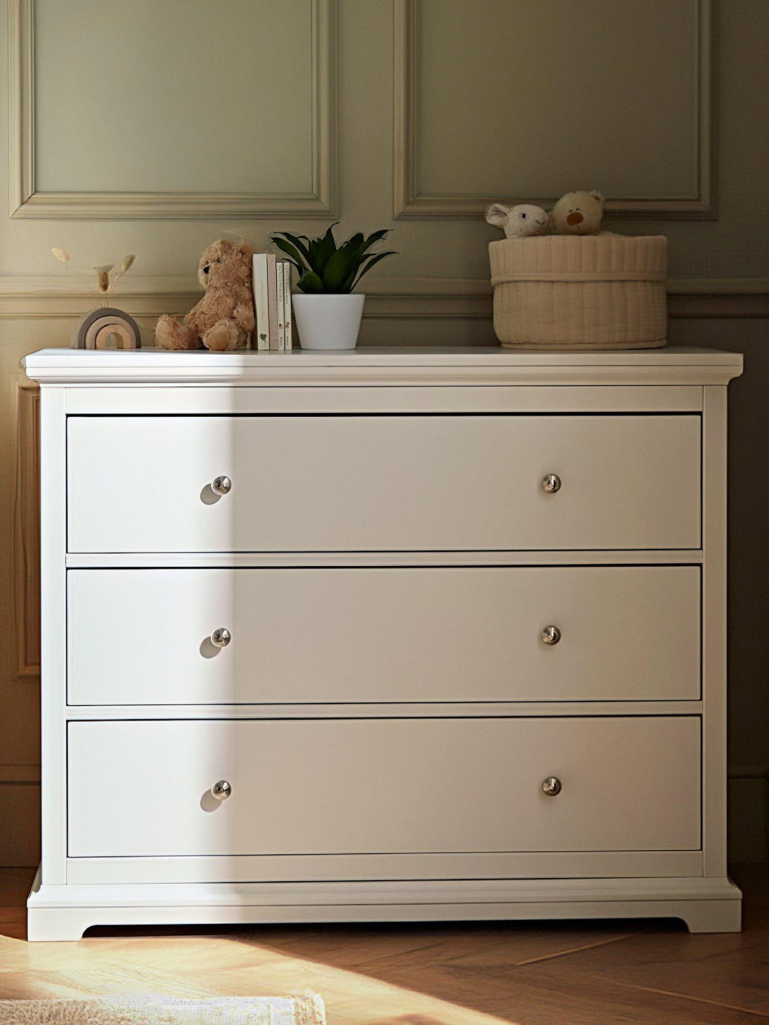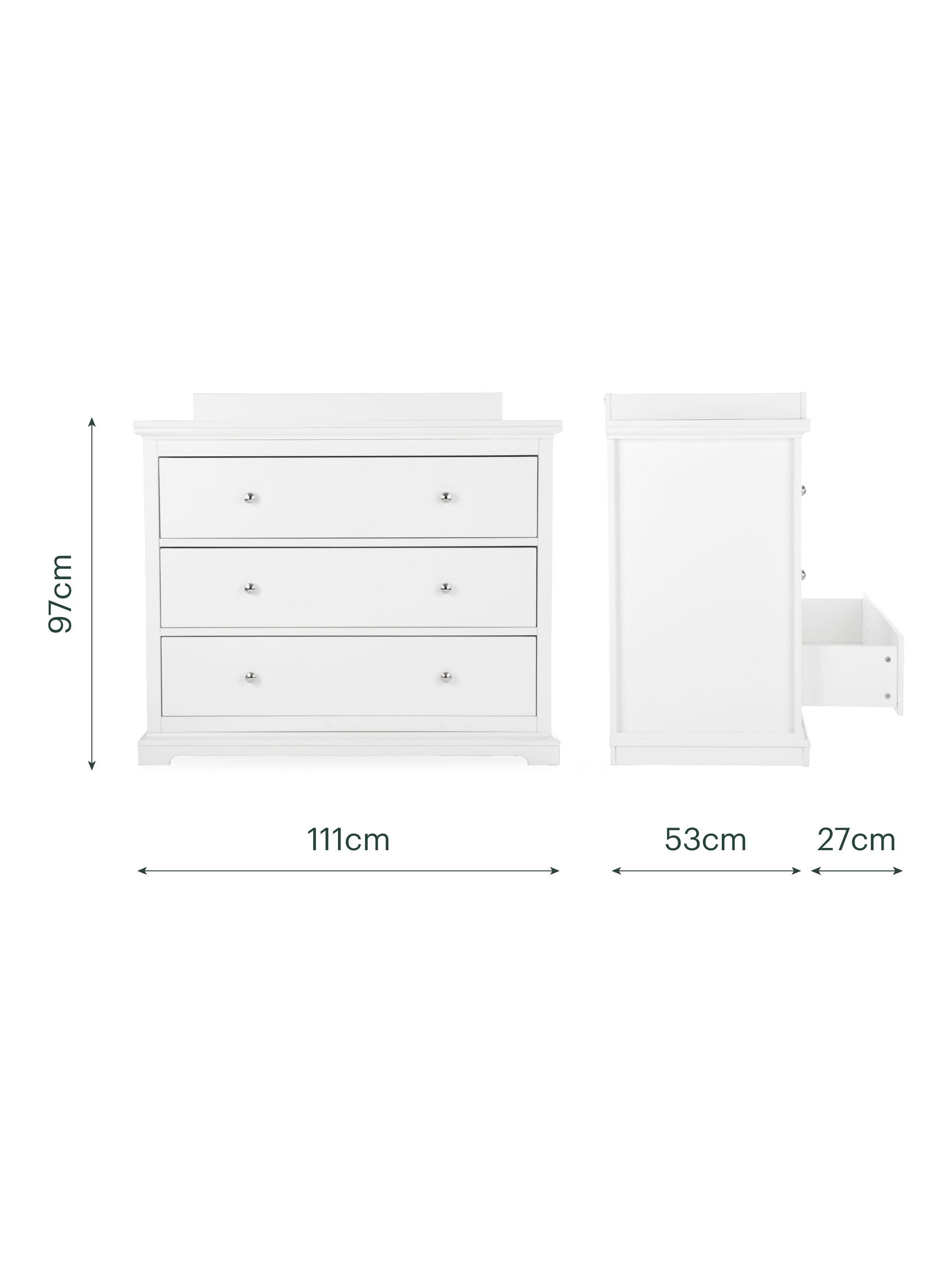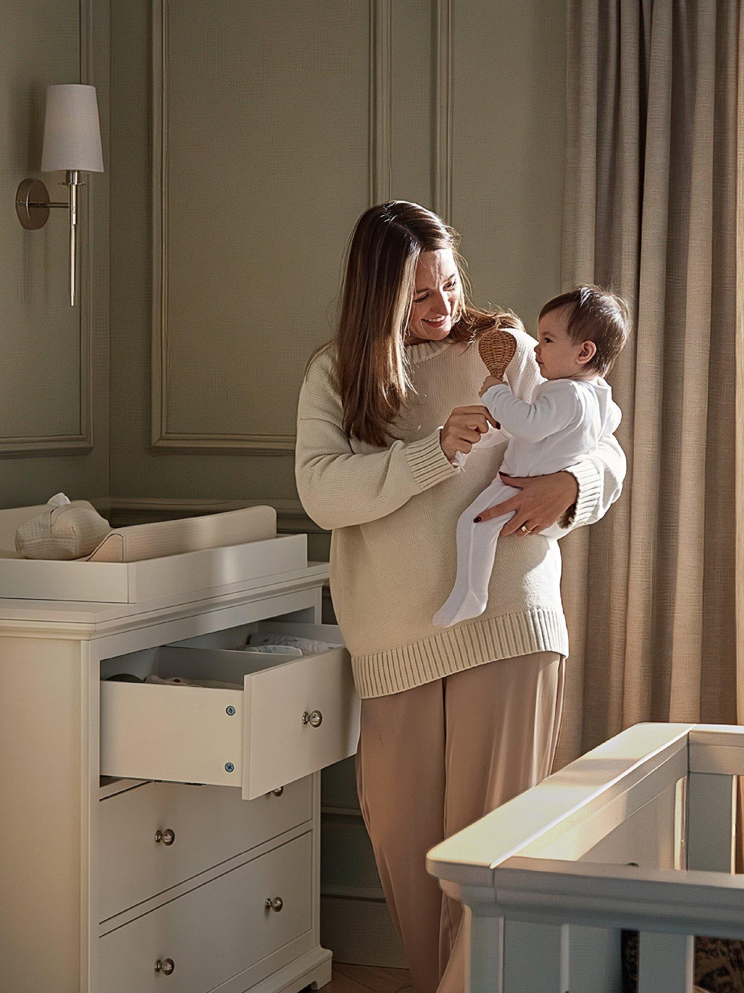 Beaumont is a period-inspired range, incorporating refined detailing and everyday functionality into the designs. The changing table dresser features a removable changing top that creates a secure and comfortable area for nappy changes in the early months, and can then be removed to transform the piece into a classic dresser suitable for long-term use. Below, there are three deep drawers for organised nursery storage. They open on smooth-glide runners and are soft close for quiet, fuss-free access, ideal for busy daily routines and silent nights.