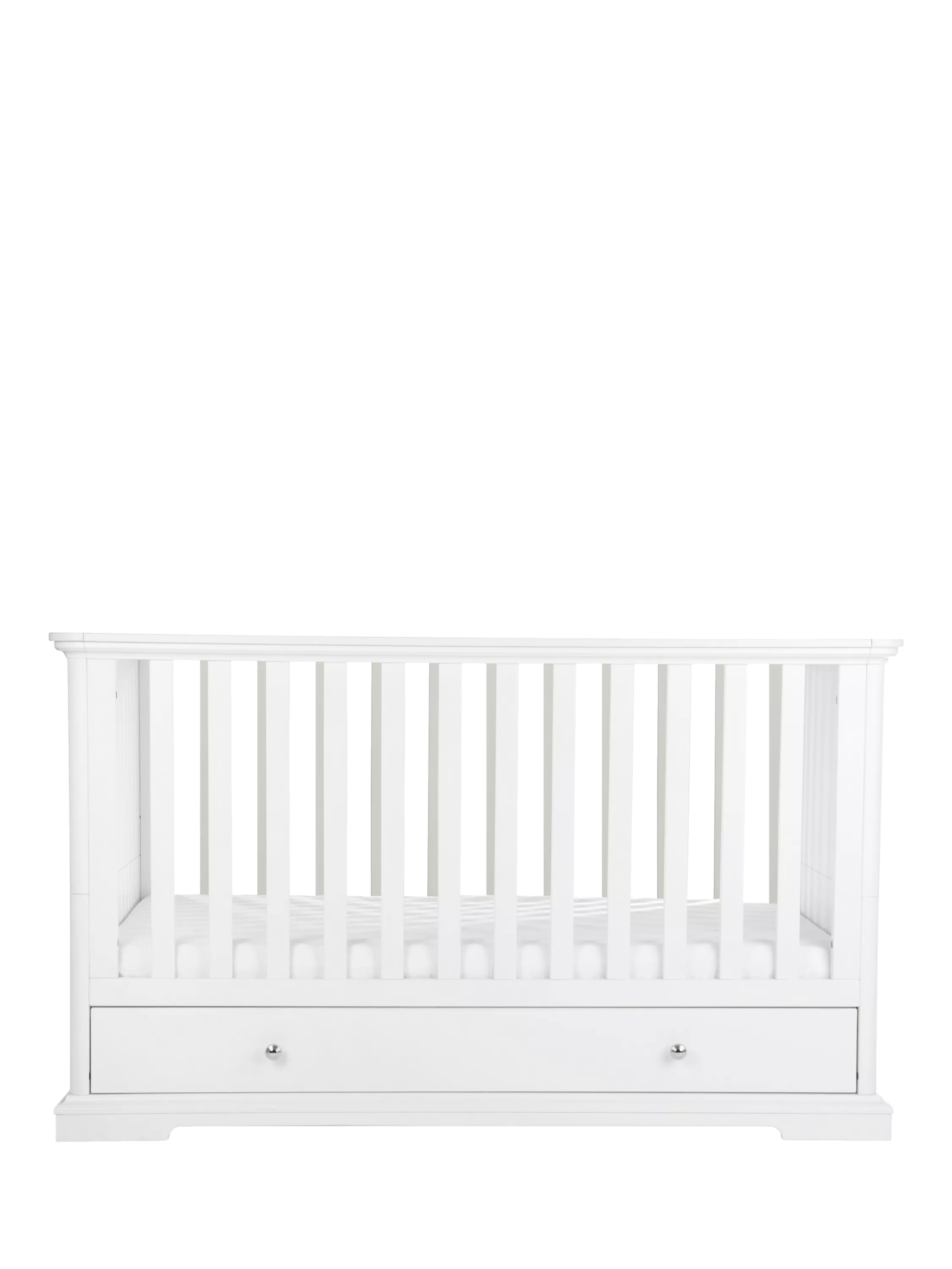 Beaumont is a period-inspired range, incorporating refined detailing and everyday functionality into the designs. This cot bed features traditional elements such as the substantial plinth, decorative cornice and mirrored beehive-style chrome handles, while the solid structure offers reassurance for everyday use. Designed to adapt as your child grows from birth to approximately 5 years old, it has three adjustable mattress base positions and converts smoothly into a toddler bed, giving you peace of mind that the next stage is already considered. An integrated under-bed drawer with smooth glide runners and soft-close drawer provides practical storage for bedding and nursery essentials, supporting an organised, calm nursery environment.
