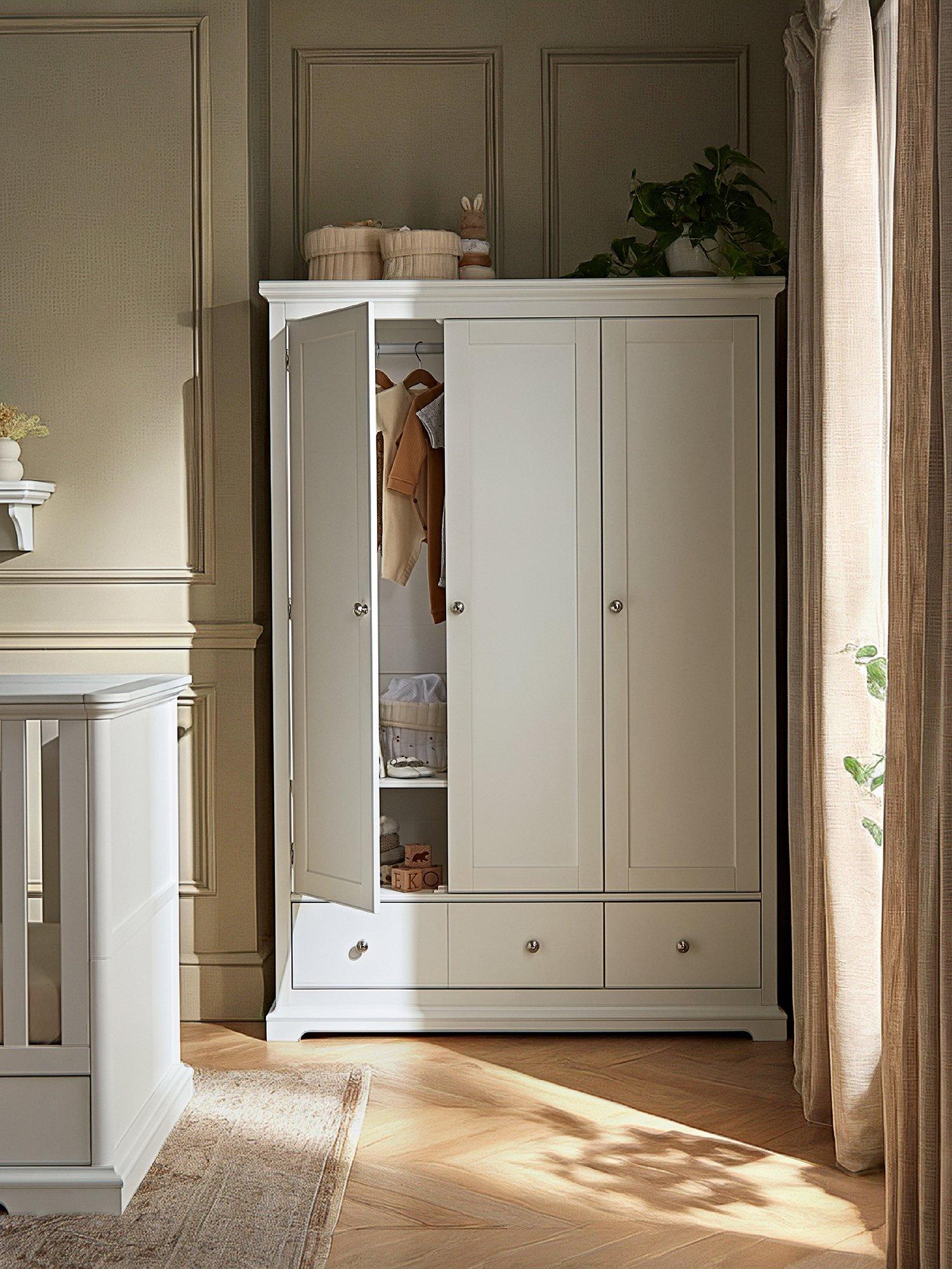 Beaumont is a period-inspired range, incorporating refined detailing and everyday functionality into the designs. The triple wardrobe is crafted with substantial proportions, decorative cornicing and chrome beehive handles that give it a strong presence, making it a natural anchor piece within the room. Inside, the layout is thoughtfully designed to adapt as storage needs change. One side features a full-height hanging space with two removable, adjustable hanging rails, ideal for everything from newborn clothing to longer toddler pieces. The opposite side includes three adjustable shelves, offering flexible storage for folded clothes, bedding and accessories. A spacious lower drawer provides additional room for larger items, helping keep everyday essentials neatly tucked away.
