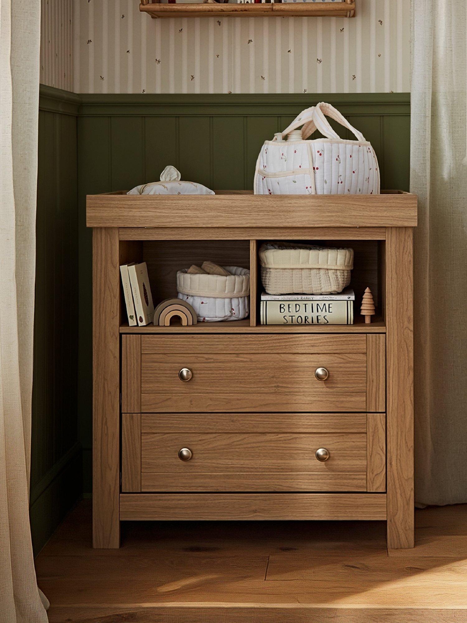 Two generously sized drawers provide space for nappies, clothing and changing essentials, while the removable changing top creates a secure changing area during the early months. Once no longer needed, the unit transitions into a standalone dresser, remaining useful well beyond the baby stage.