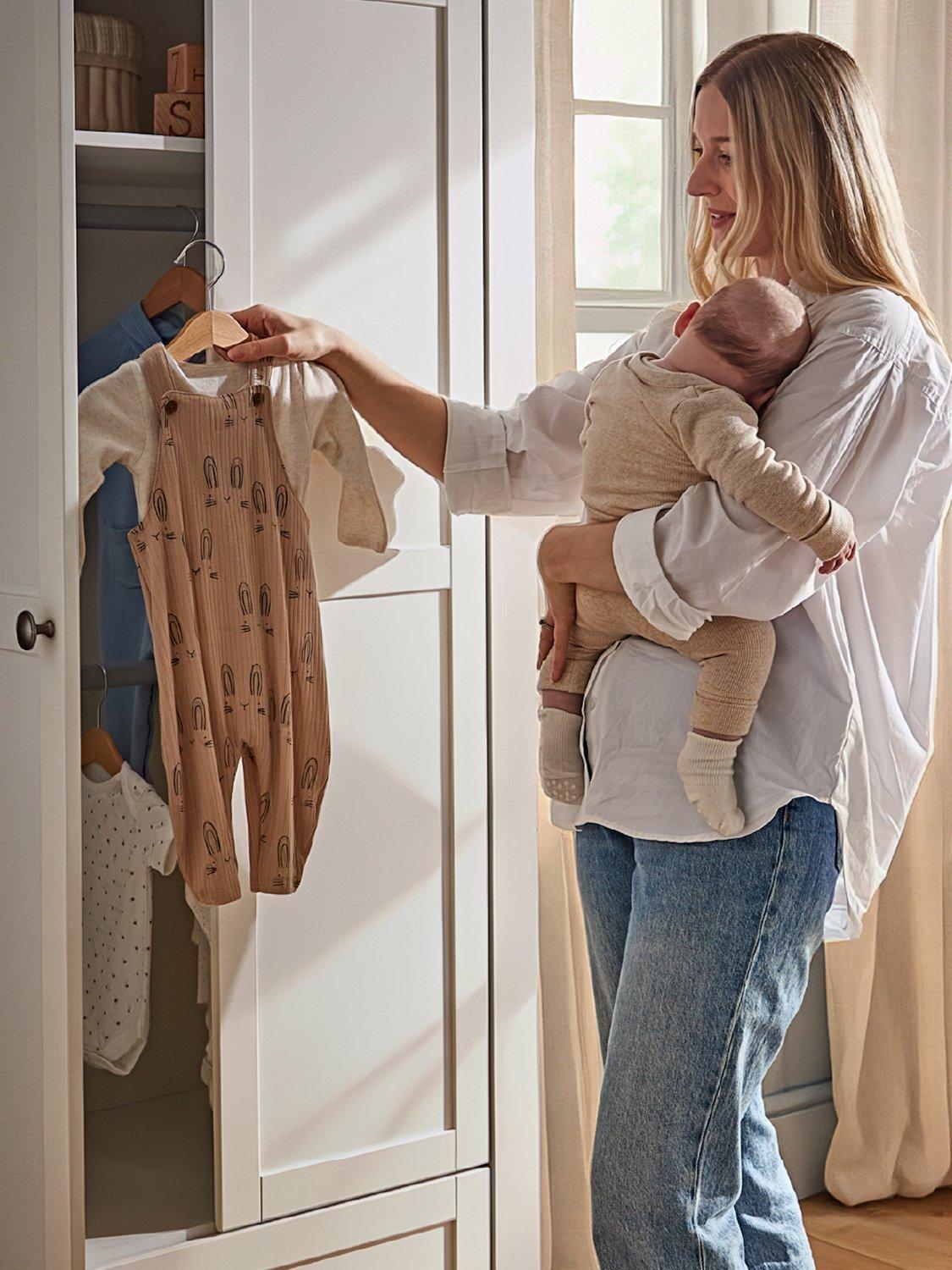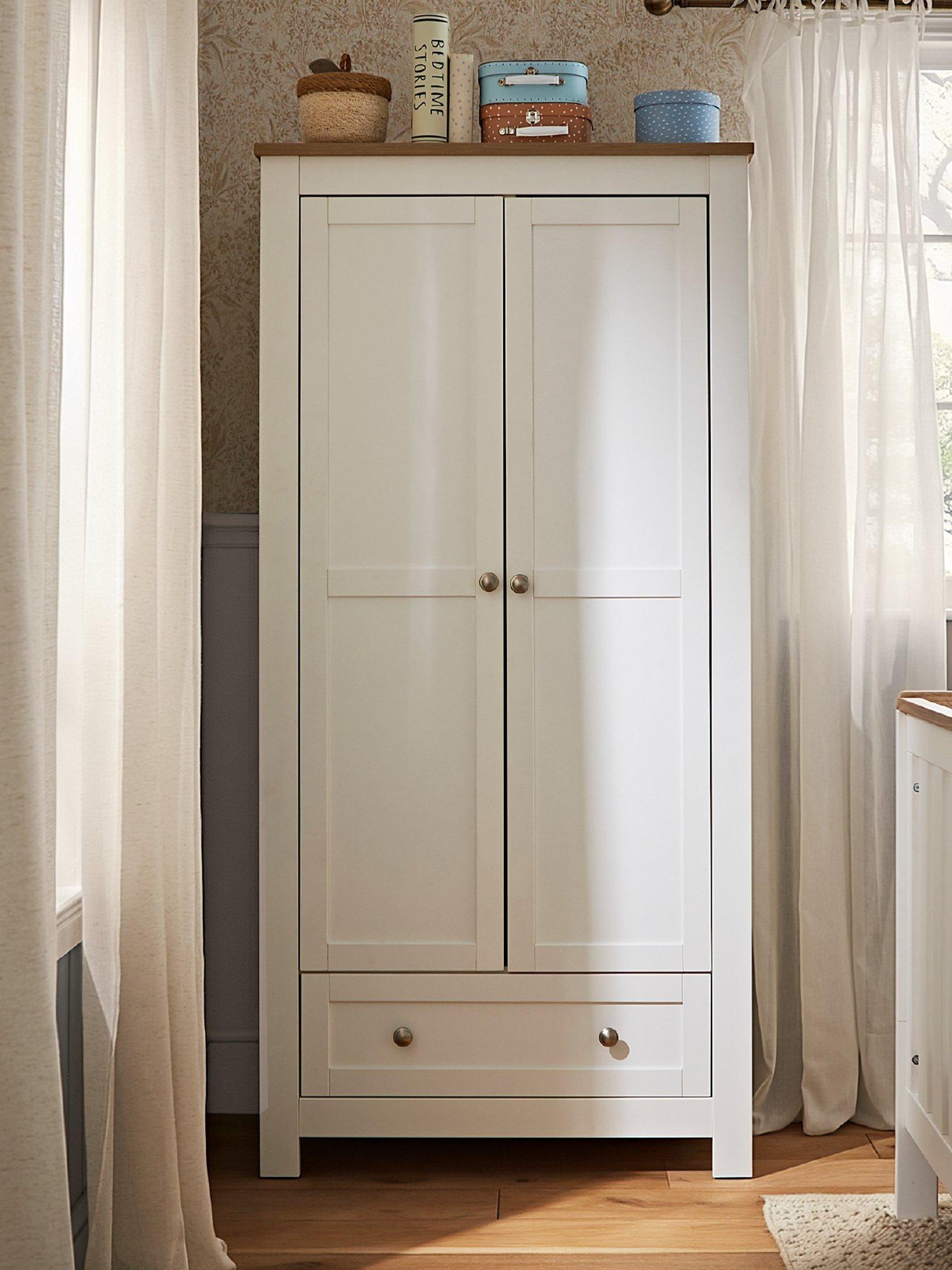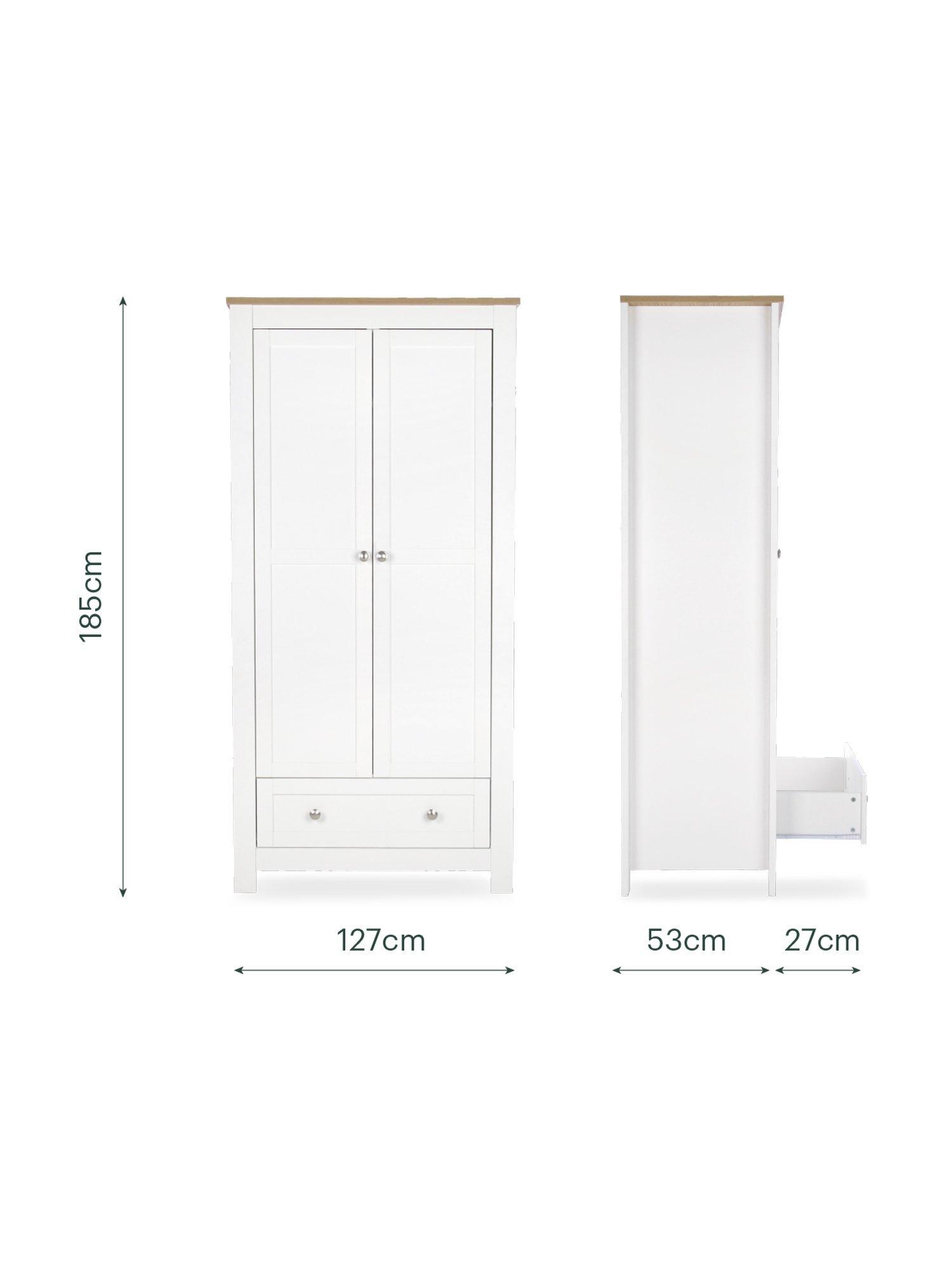 Finished in crisp white with warm oak-effect detailing, the shaker-style Burford Wardrobe brings a reassuring, traditional feel to the nursery while offering practical storage for everyday family life. Its clean lines and natural tones make it easy to style alongside a wide range of nursery interiors. Inside, two removable hanging rails provide flexible space for baby clothes, while an internal shelf and wide lower drawer offer additional storage for bedding, blankets and everyday essentials. As your child grows, the internal layout can be adapted to suit changing storage needs, allowing the wardrobe to remain useful well beyond the baby stage.