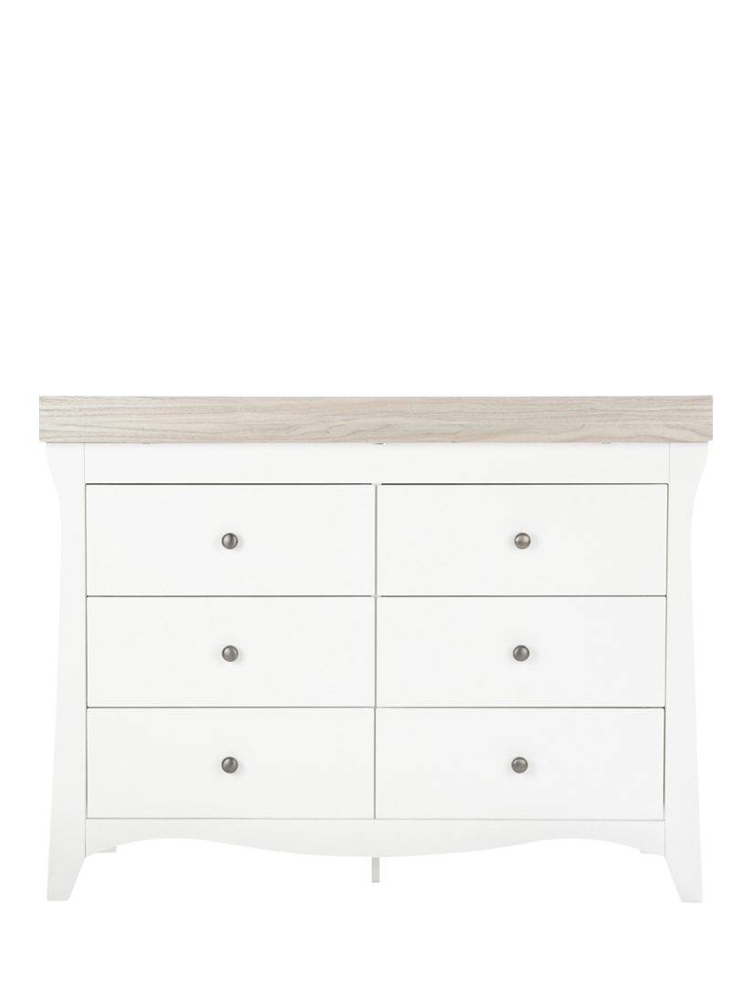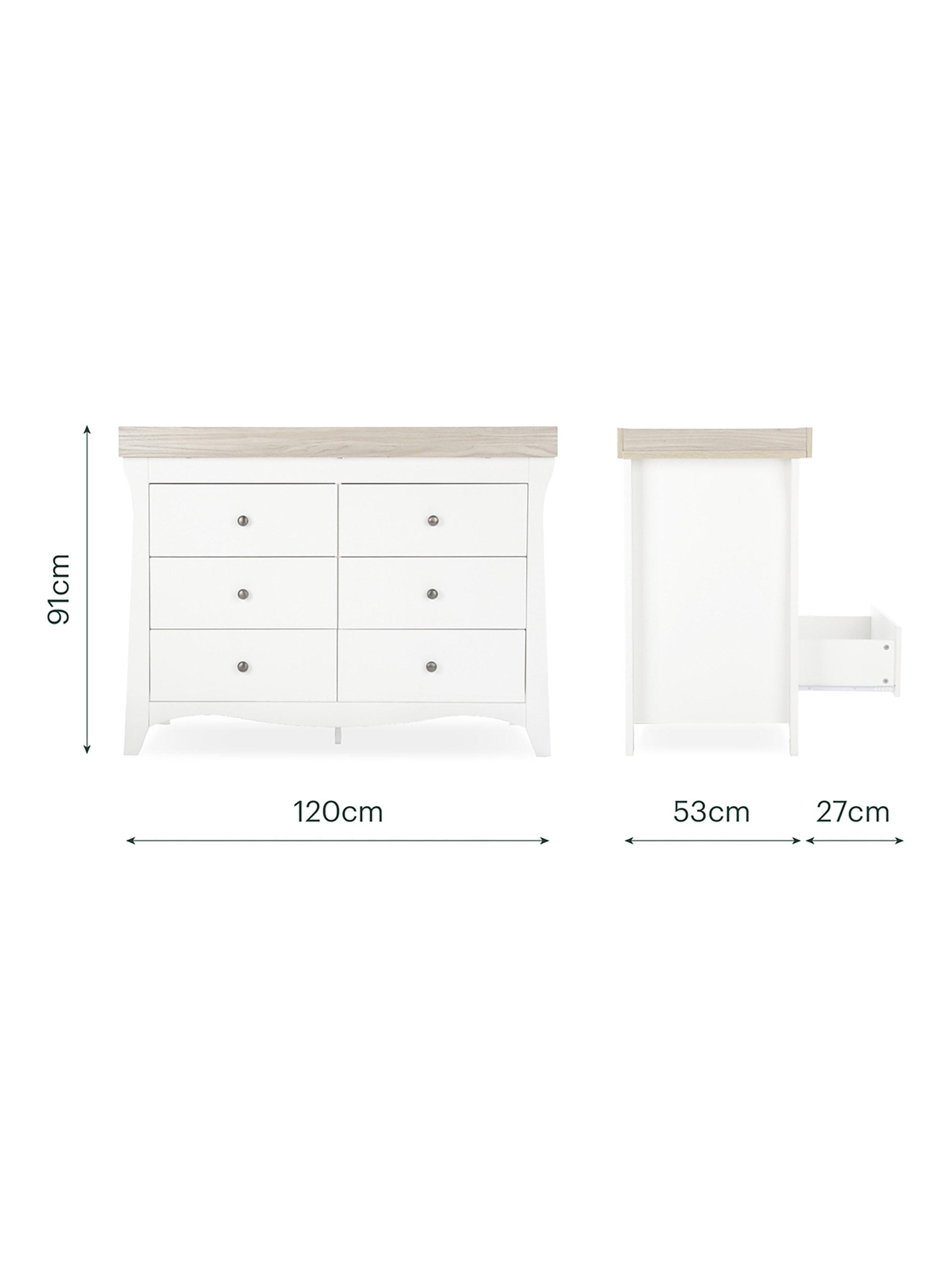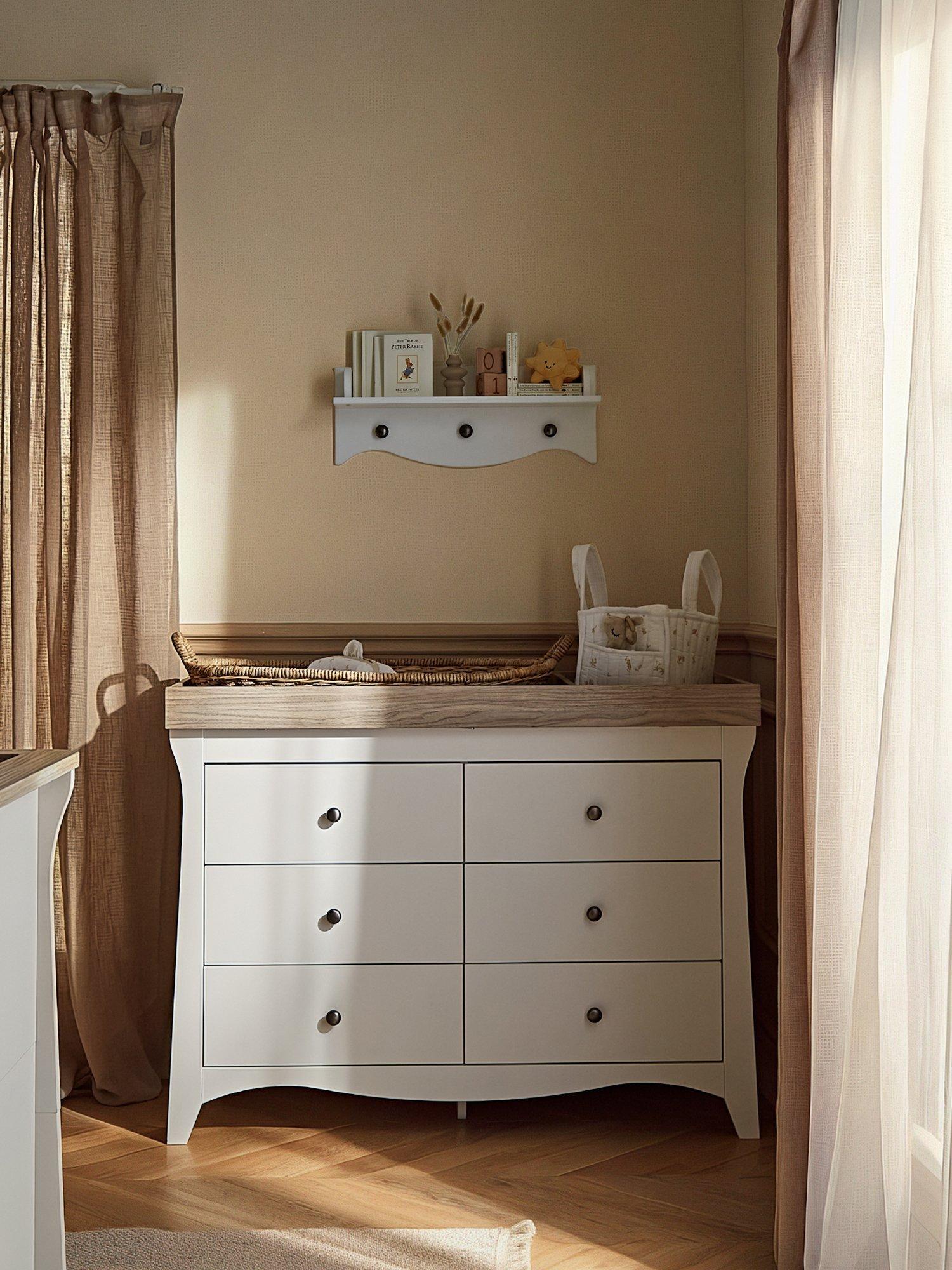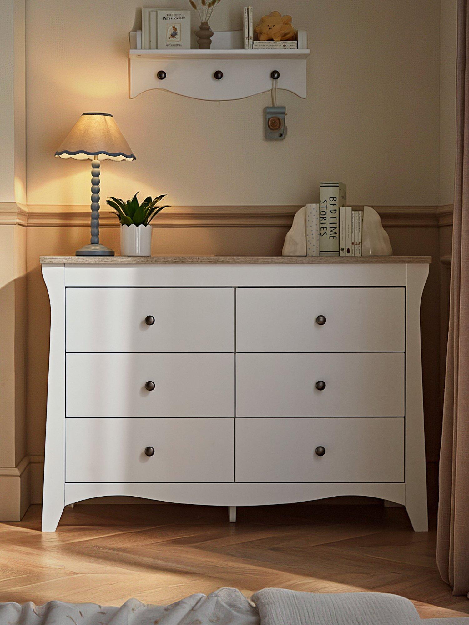 Finished in soft white with warm ash detailing, the Clara 6 Drawer Dresser Changer has a traditional, heritage-inspired design and offers a practical, versatile storage solution for the nursery. Six generously sized drawers with smooth-glide runners provide ample space for nappies, clothing and everyday essentials, while the removable changing top creates a secure changing area in the early months. Once no longer needed, the unit transitions into a standalone dresser designed to remain useful well beyond the baby stage.