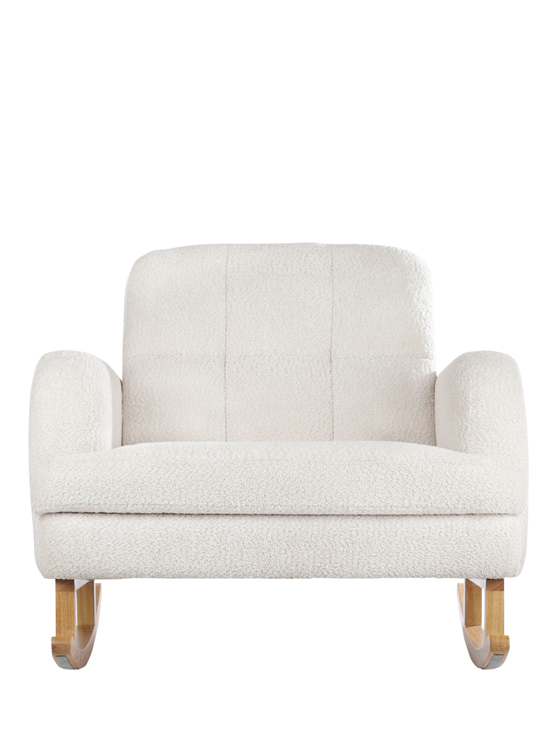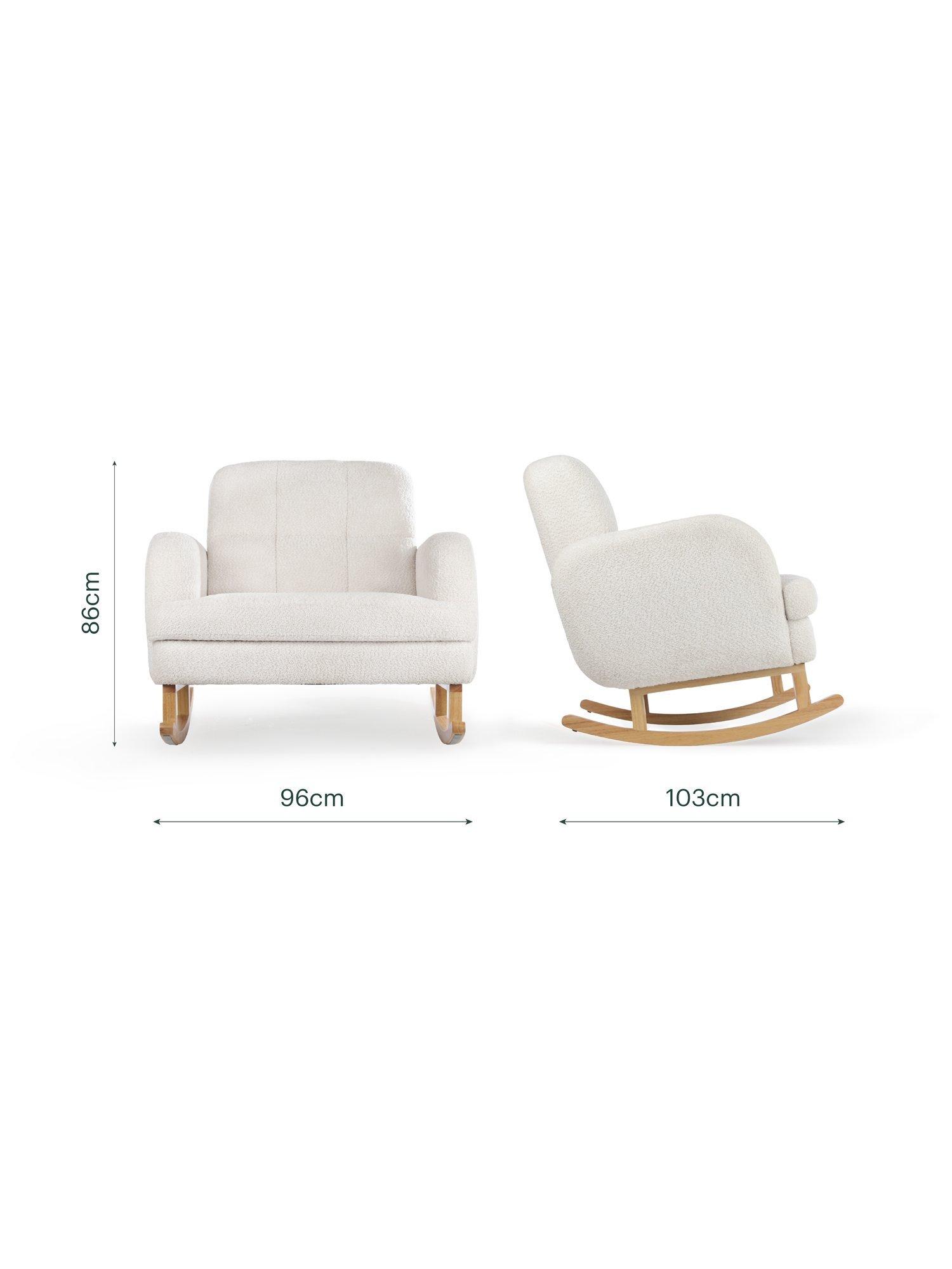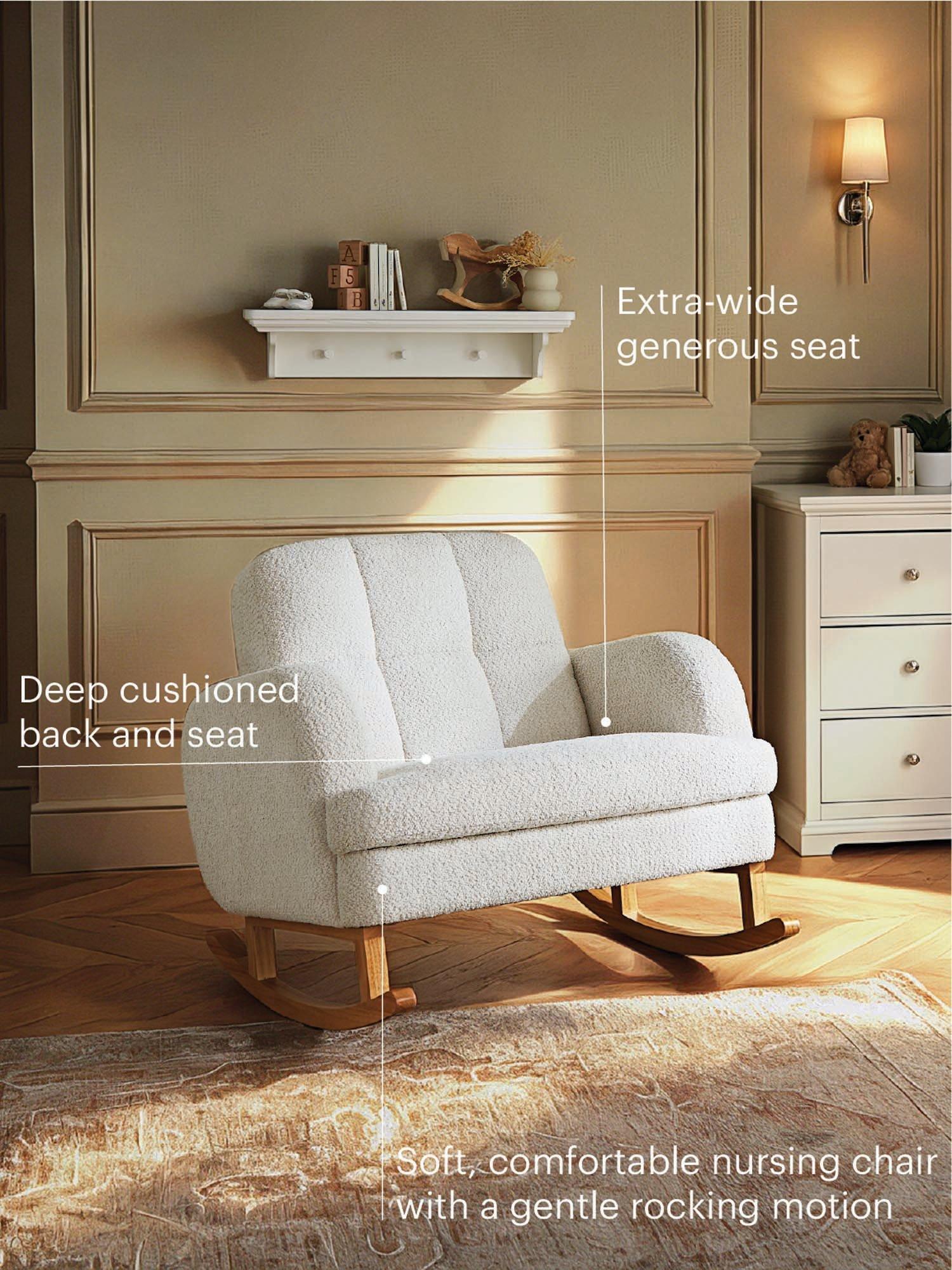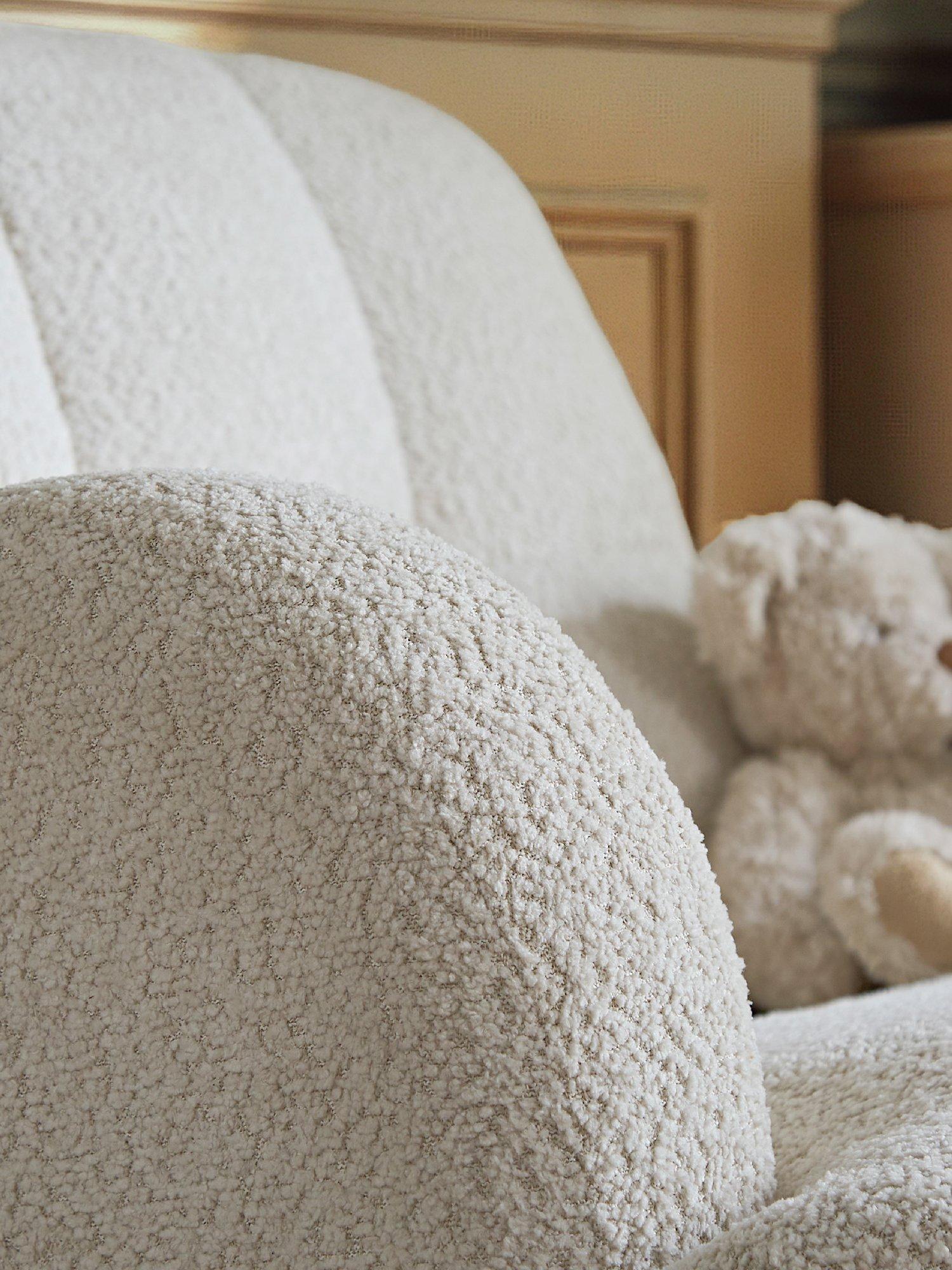 Upholstered in boucle, it brings softness and depth to the nursery while remaining practical for everyday use. The gentle rocking motion supports calm routines, and the deeply cushioned seat, supportive back and ideally positioned softly padded armrests make for relaxed feeding moments. Designed to support quiet moments of bonding, day or night, the extra-wide seat offers comfort well beyond the newborn stage.