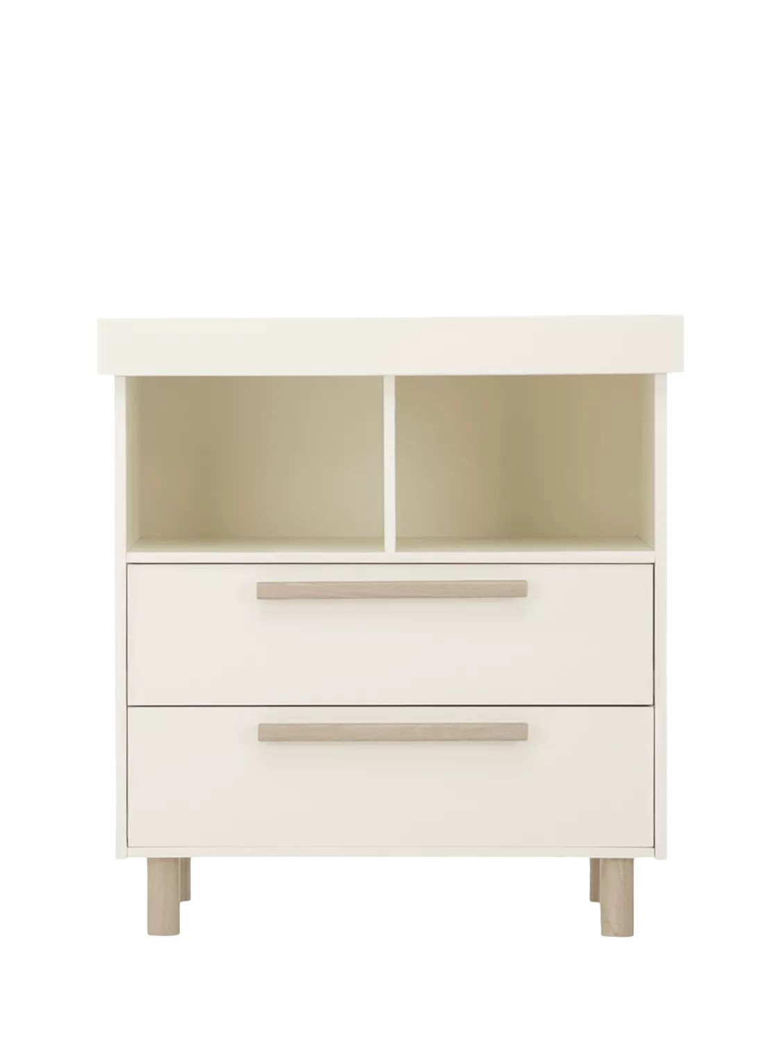 Each of the two drawers pull out to offer deep space perfect for storing your changing essentials while the open top shelf presents itself as the ideal space for decorative baskets between the divider.
