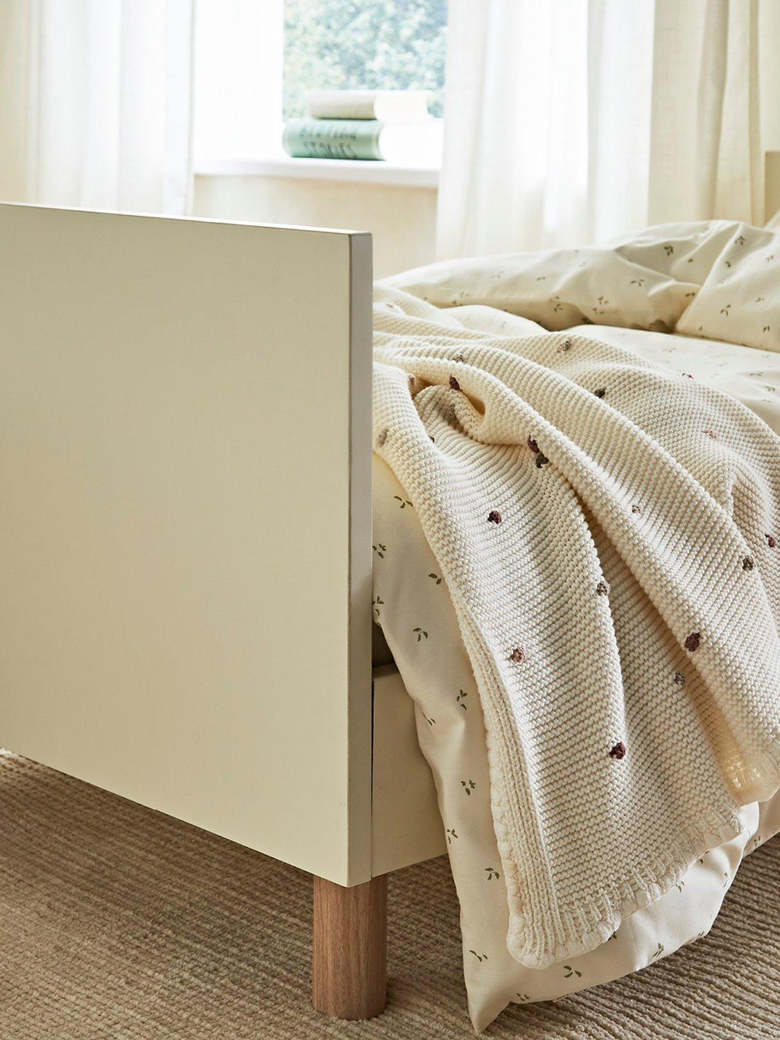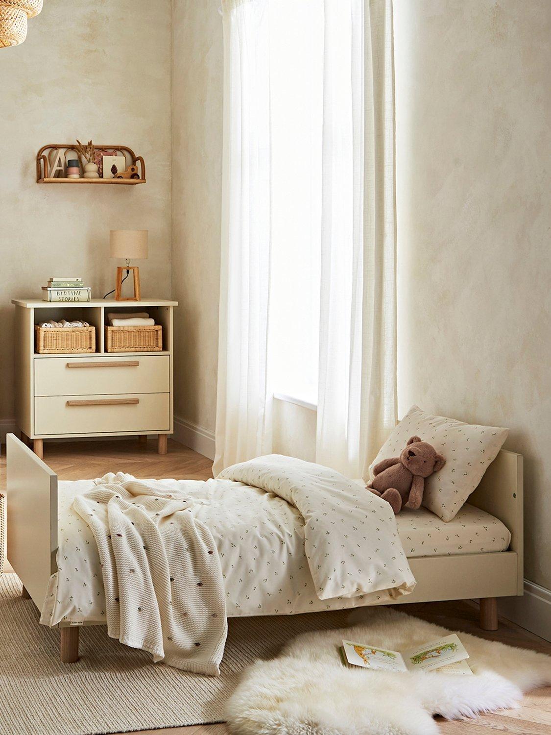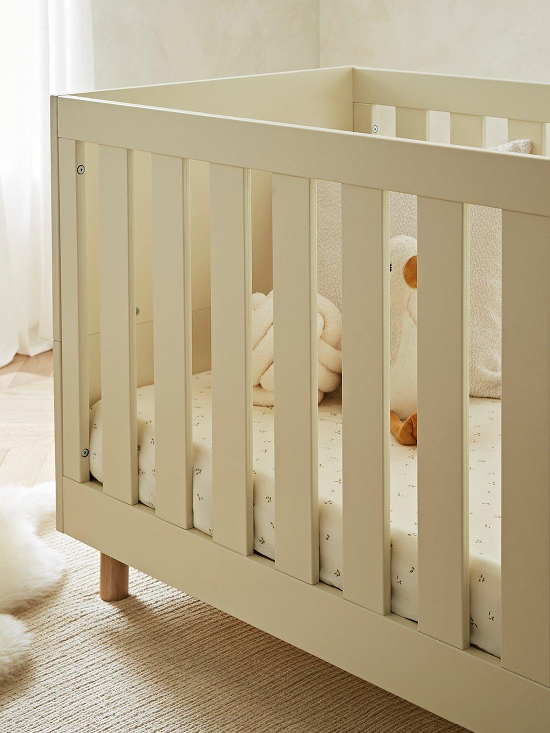 The Harper cotbed is suitable for ages 0-5 and comes with 3 mattress base positions that adjust to your baby’s sleep needs. When your little one transitions to a toddler, this bed easily converts into a toddler bed.
