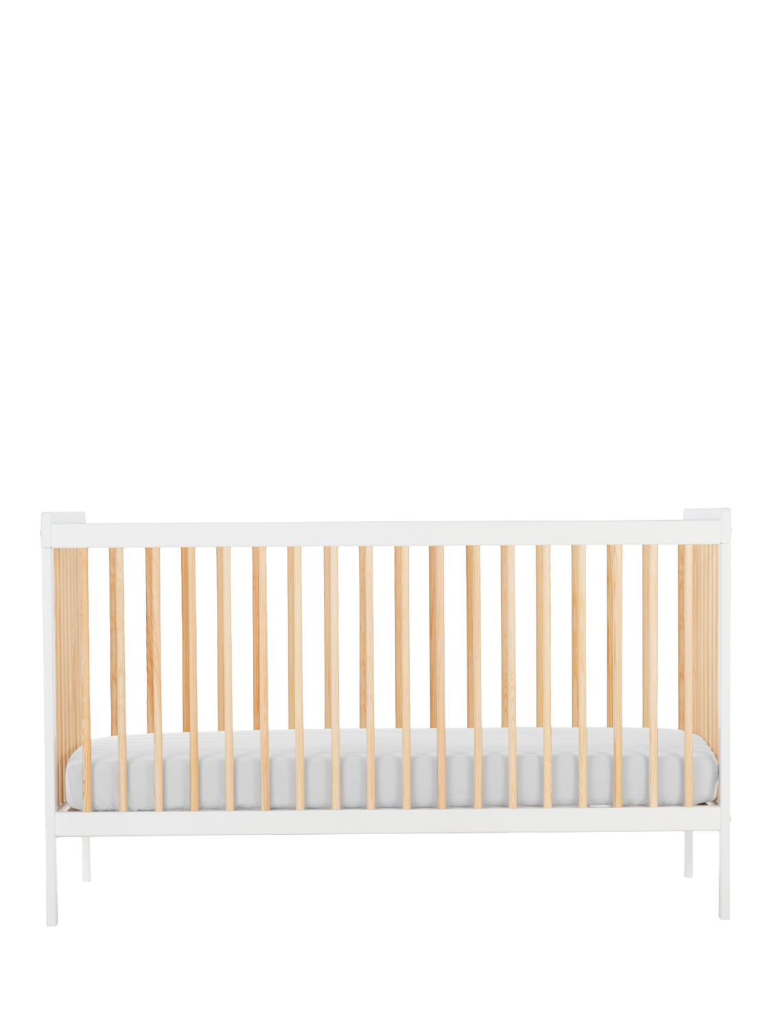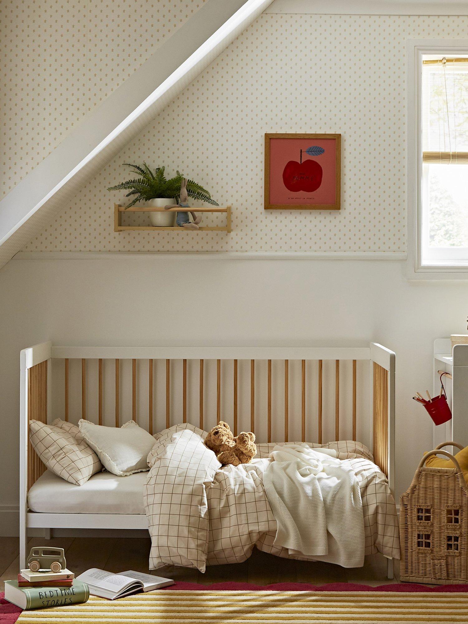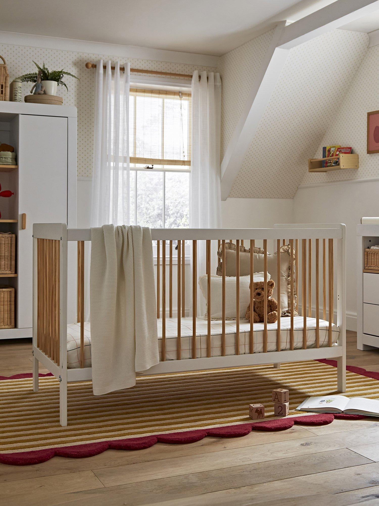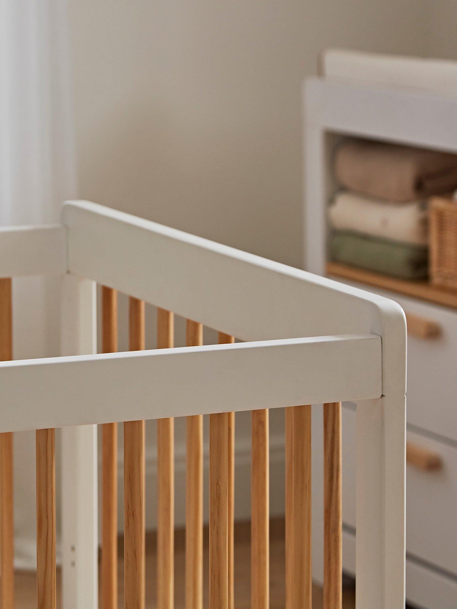 The Nola Cotbed is a stylish staple for any nursery. Crafted from quality pine wood, this white cot bed boasts a contrasting two-tone design with intricate pine detailing.
