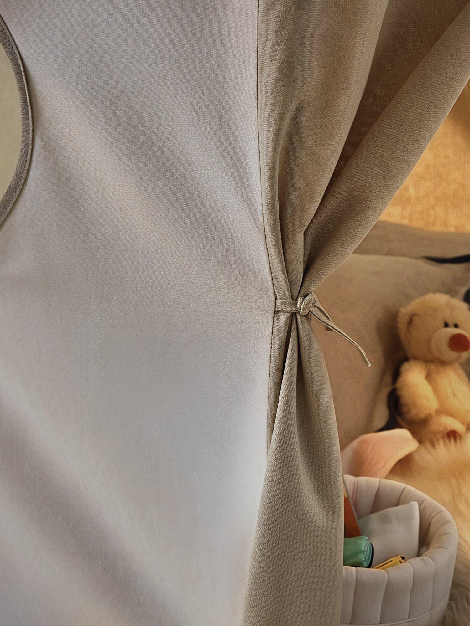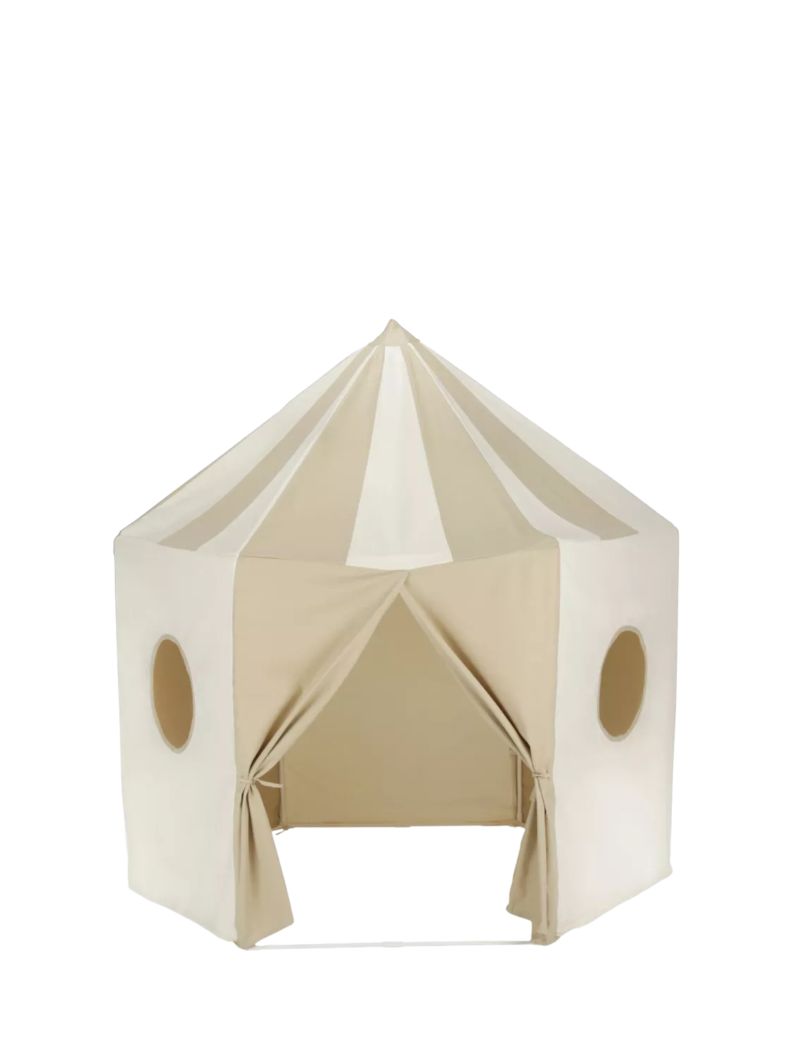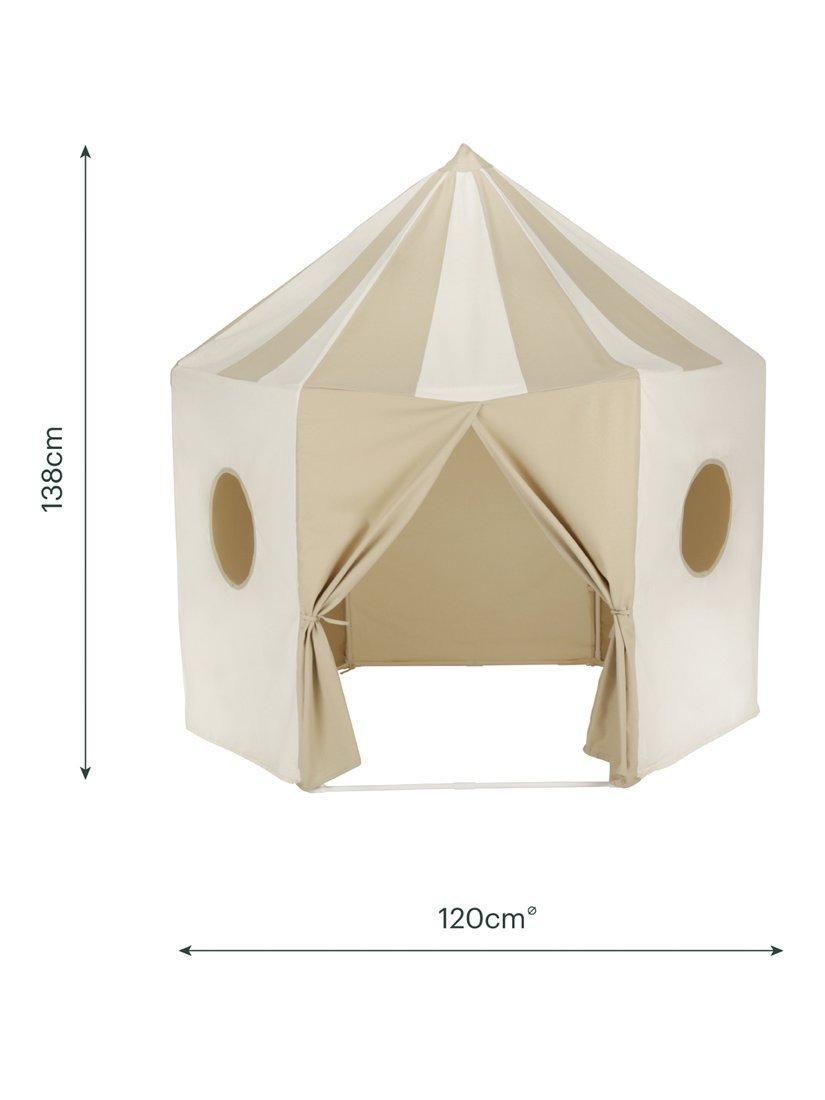 Finished in a neutral cookie tone, the tent blends easily into modern family homes. It's made from soft, durable cotton canvas with tie-back doors and peek-through windows that add a playful detail. Sturdy PVC poles add stability, yet it still has a lightweight design and folds away neatly for simple storage between playtimes.