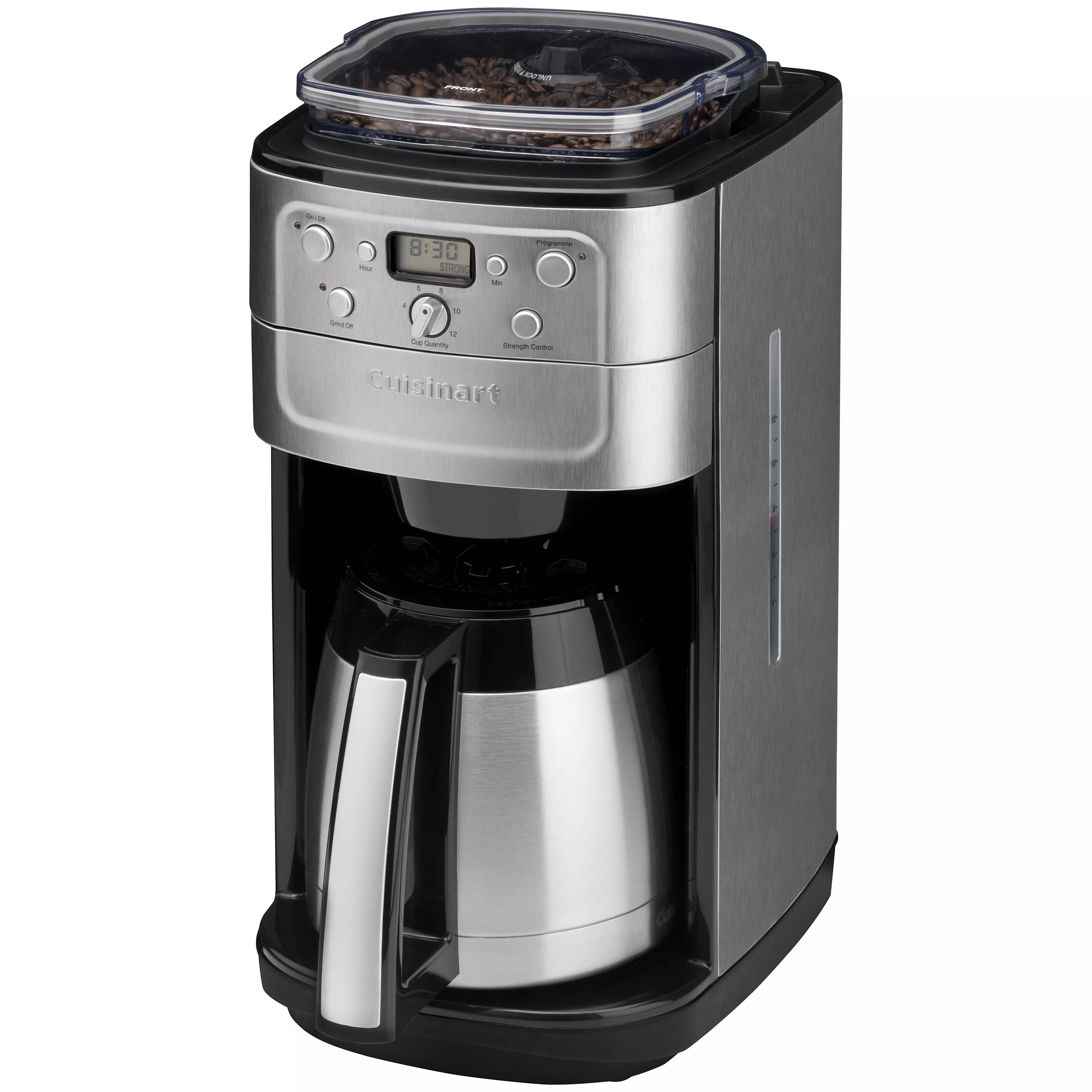 The integral hopper holds up to 225g of your favourite beans, with the burr plates extracting the ultimate flavour. A strength selector lets you personalise the coffee to suit your taste, and you can set the Cuisinart DGB900BCU to produce between 2 and 12 cups.