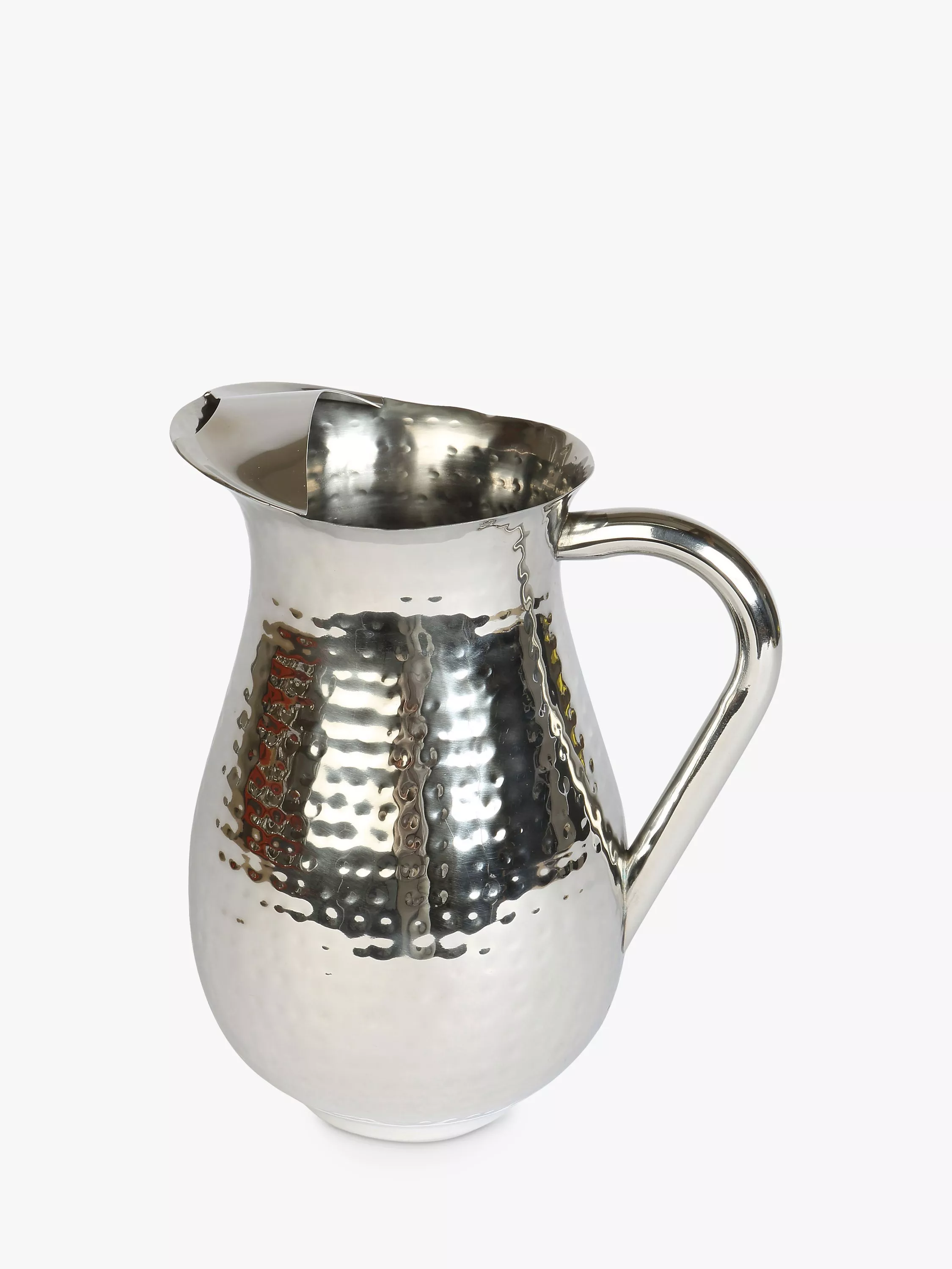 A shiny stainless steel pitcher with a hammered-effect texture, from Culinary Concepts. Perfect for serving soft drinks or cocktails, it's designed for easy pouring with a large handle and spout to direct flow and prevent splashing.